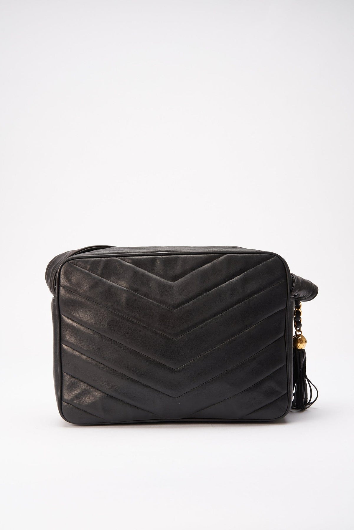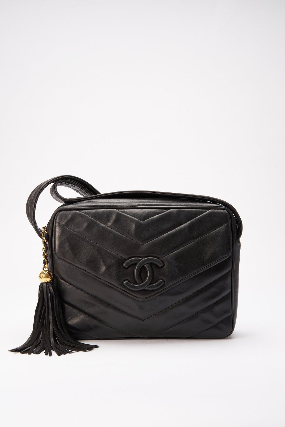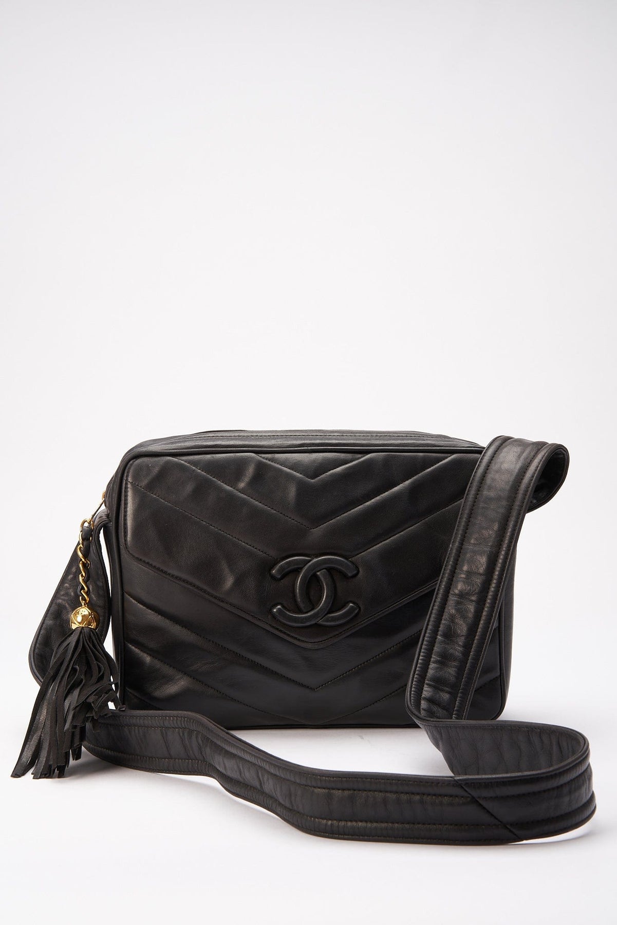 Regular price $2,170.00 Sale price $420.00 Save $1,750.00This Chanel camera bag is crafted from chevron quilted black lambskin, featuring a Chanel CC tassel and the rare leather covered CC branding.