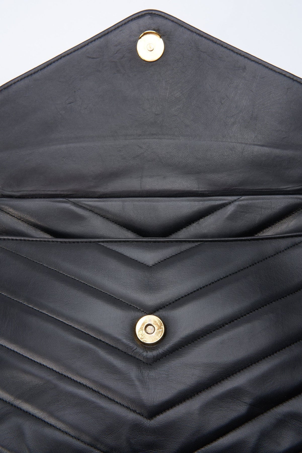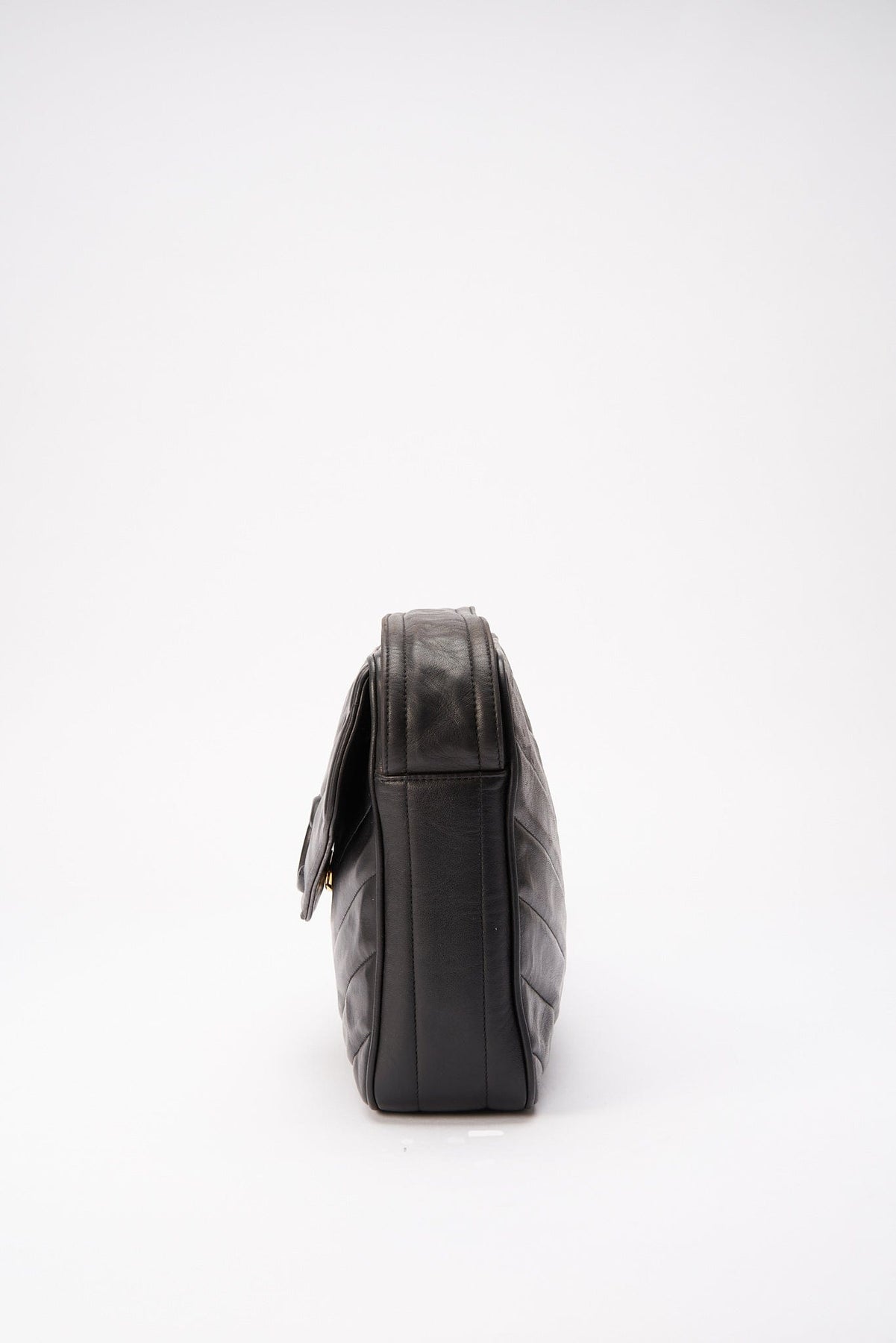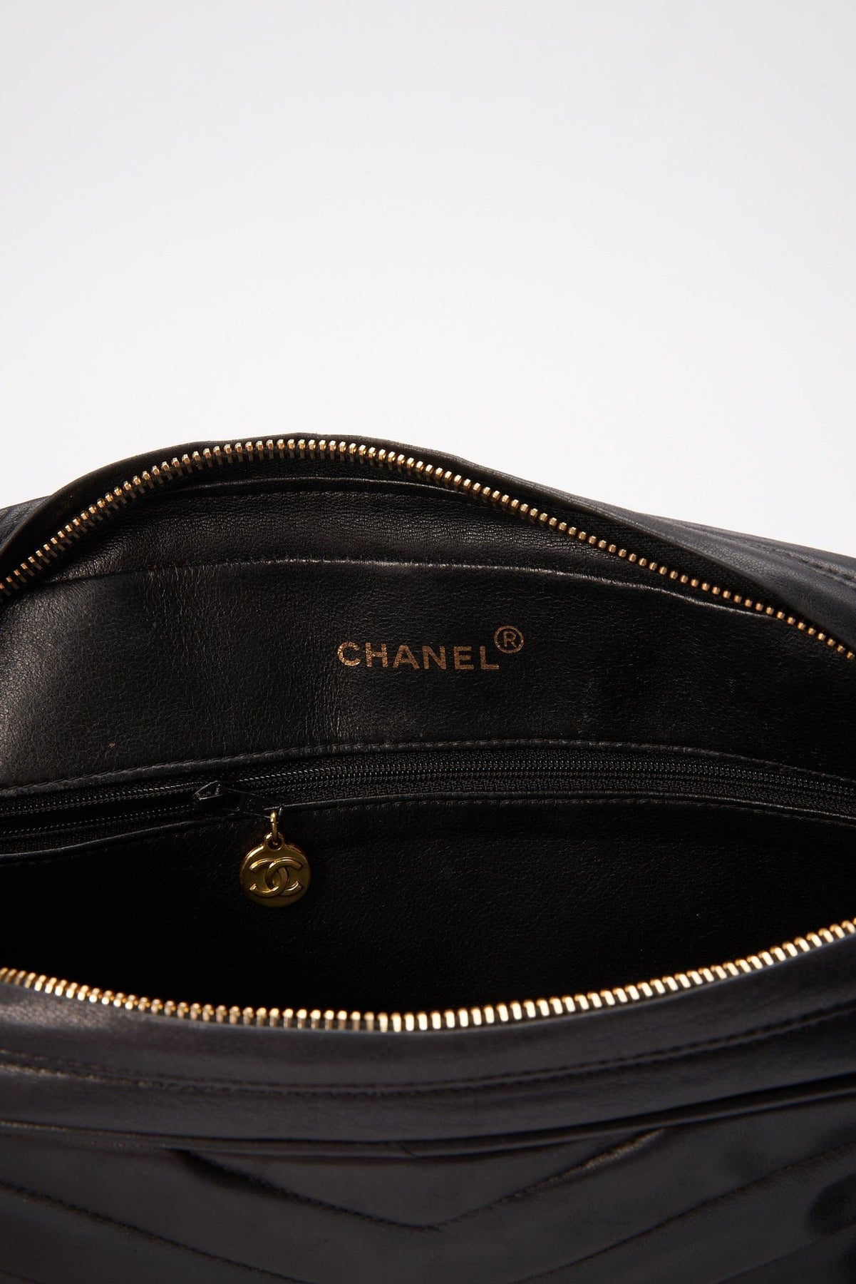 Regular price $2,170.00 Sale price $420.00 Save $1,750.00This Chanel camera bag is crafted from chevron quilted black lambskin, featuring a Chanel CC tassel and the rare leather covered CC branding.