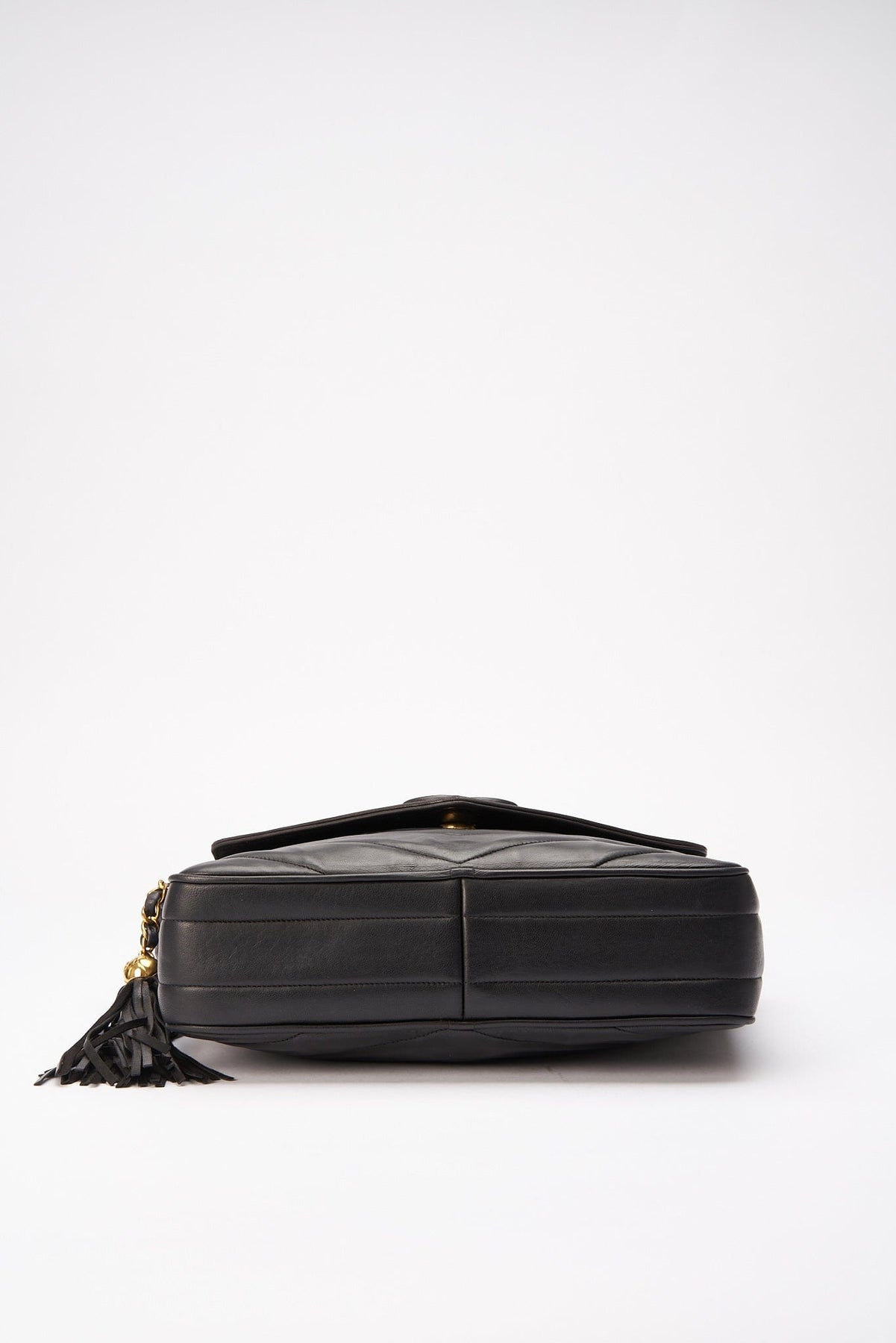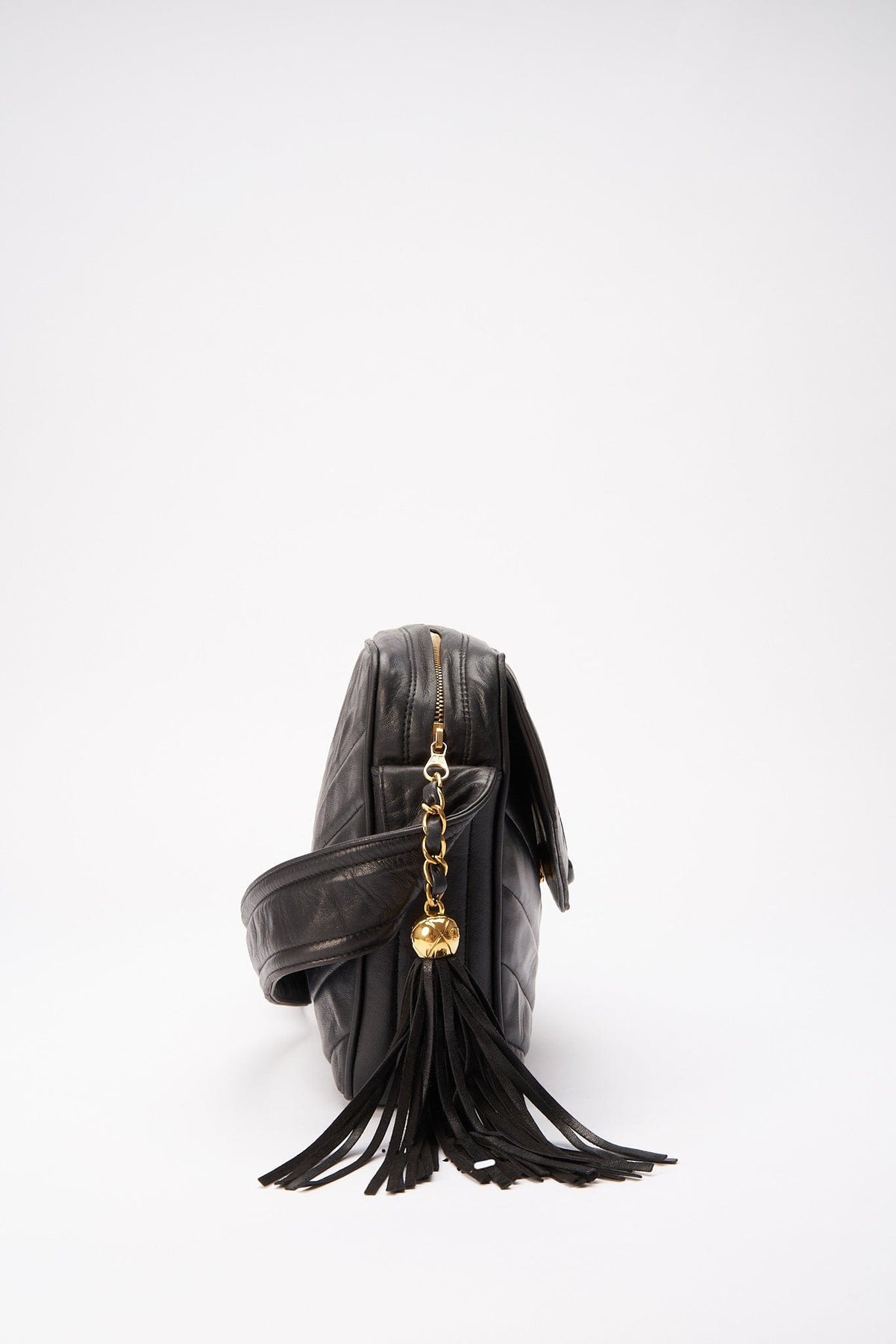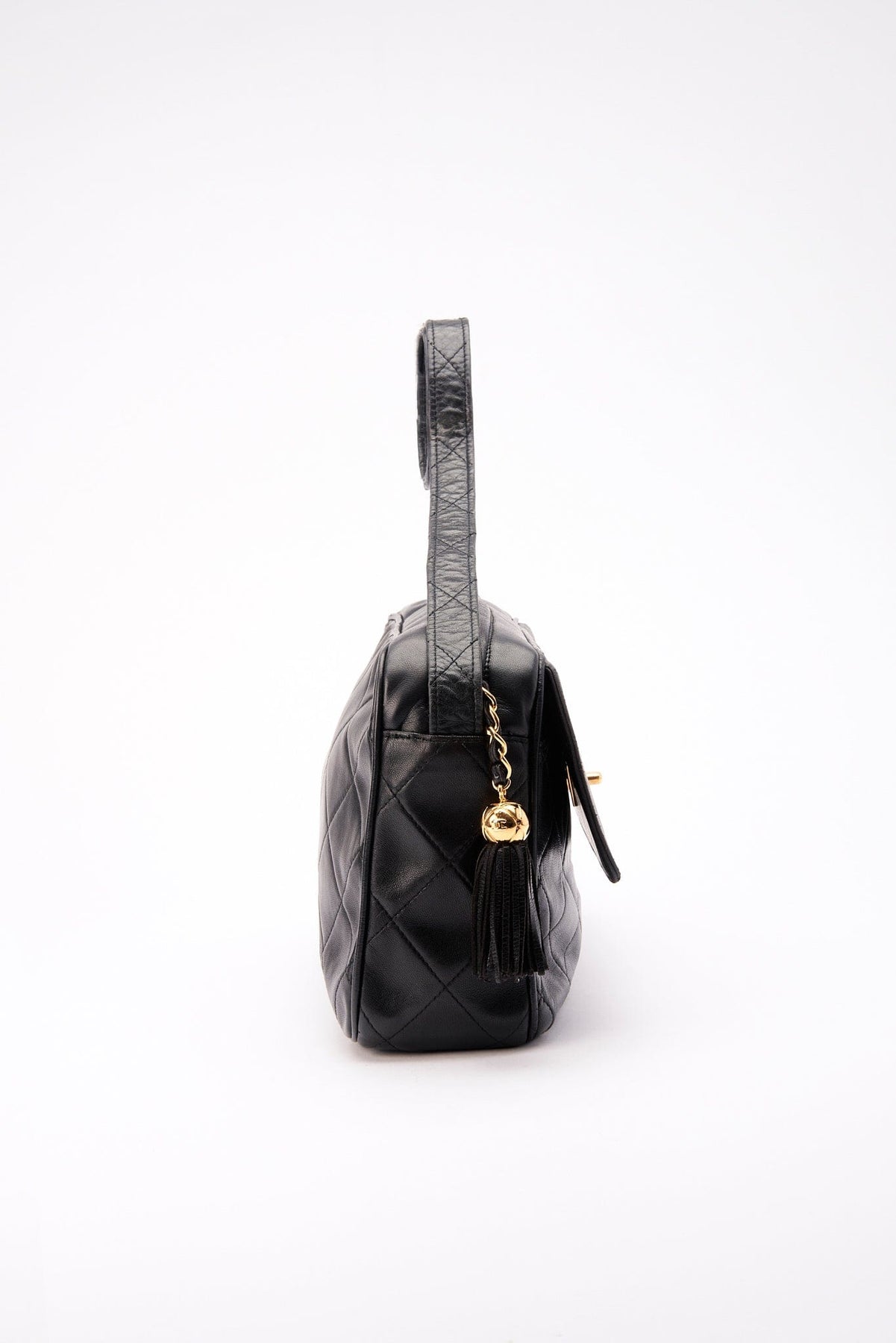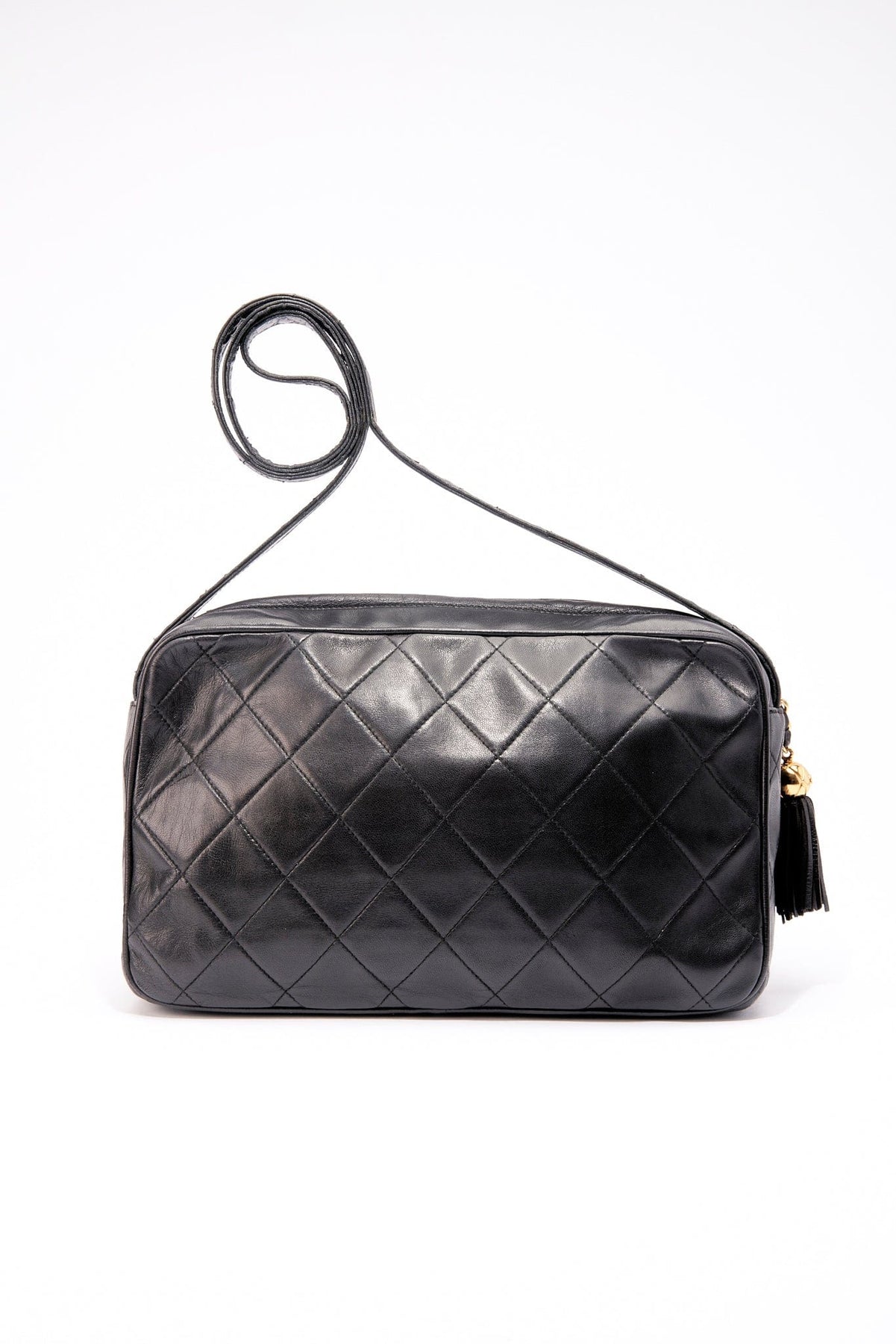 Regular price $2,020.00 Sale price $430.00 Save $1,590.00This Chanel camera bag is crafted from quilted black lambskin, featuring a Chanel CC tassel and 24k gold plates hardware.