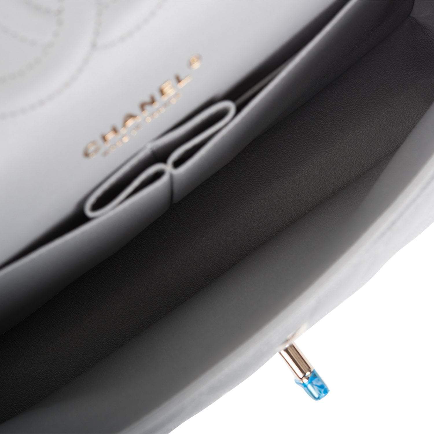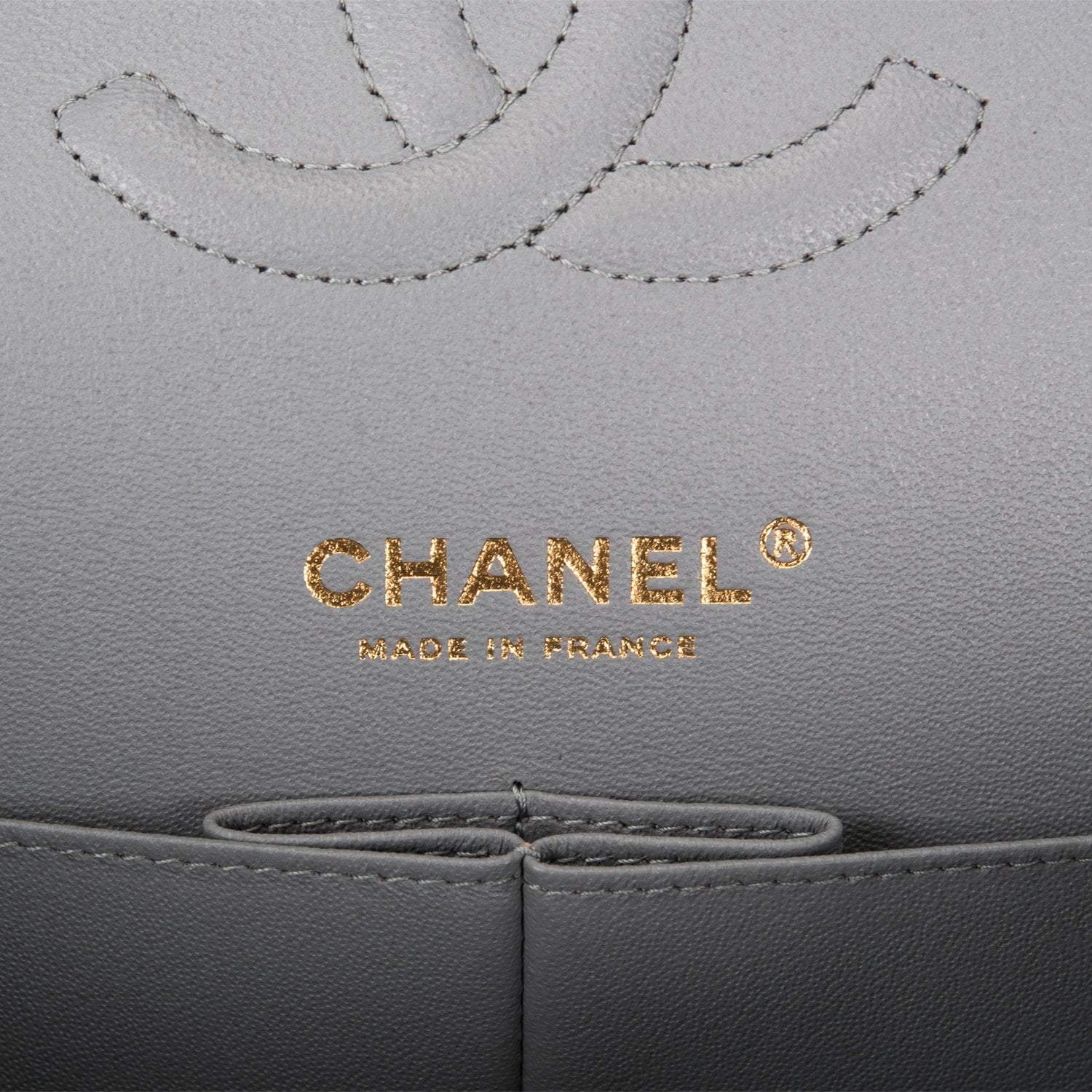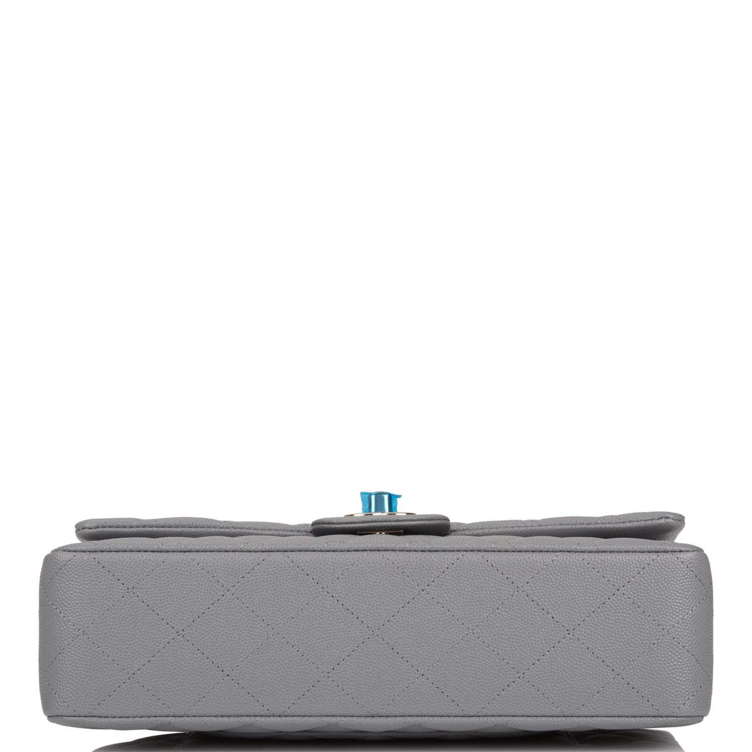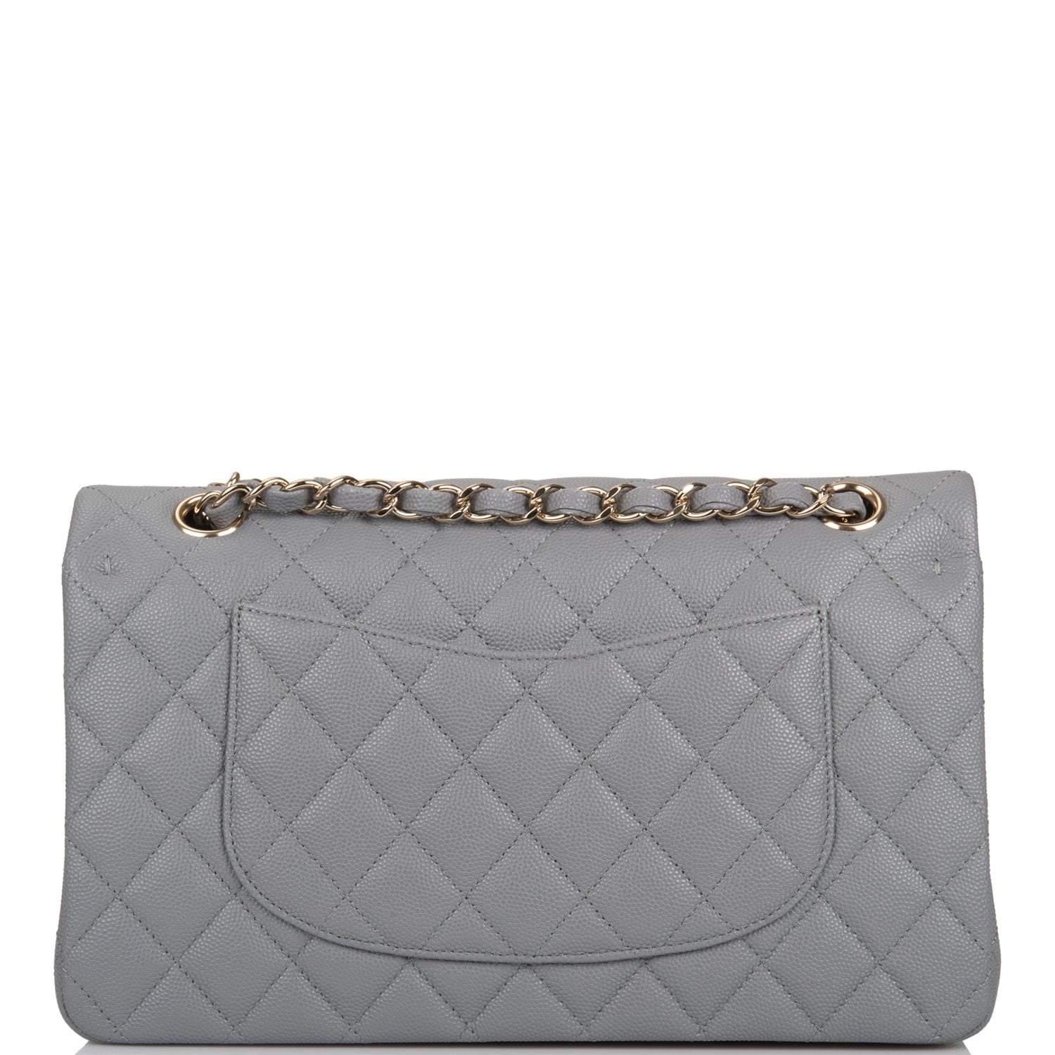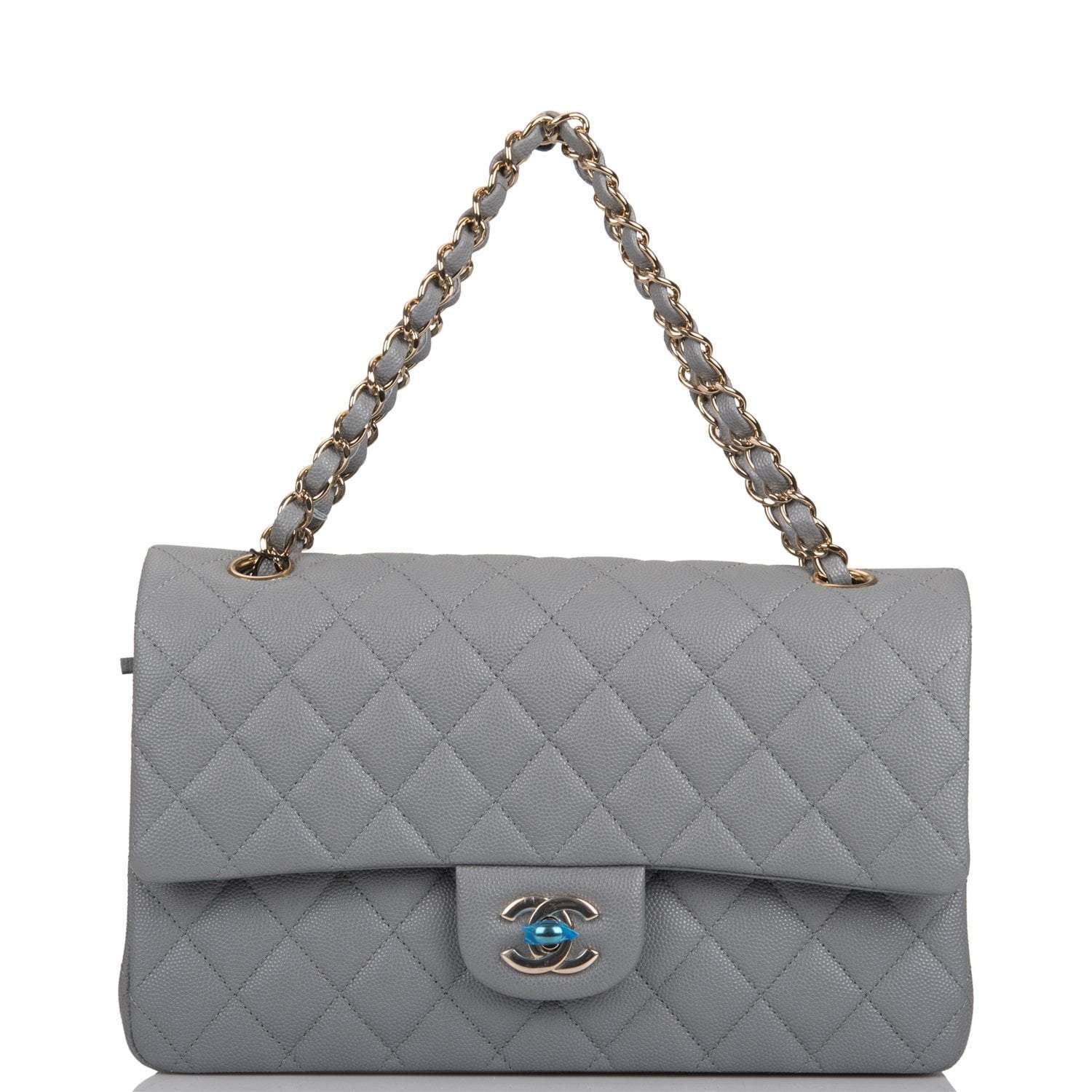 Regular price $1,065.30 Sale price $639.18 Save $426.12This Medium Classic Double Flap bag is in grey caviar leather with light gold tone hardware and features a front flap with signature CC turnlock closure, half moon back pocket, and adjustable interwoven light gold tone chain link and grey leather shoulder strap.