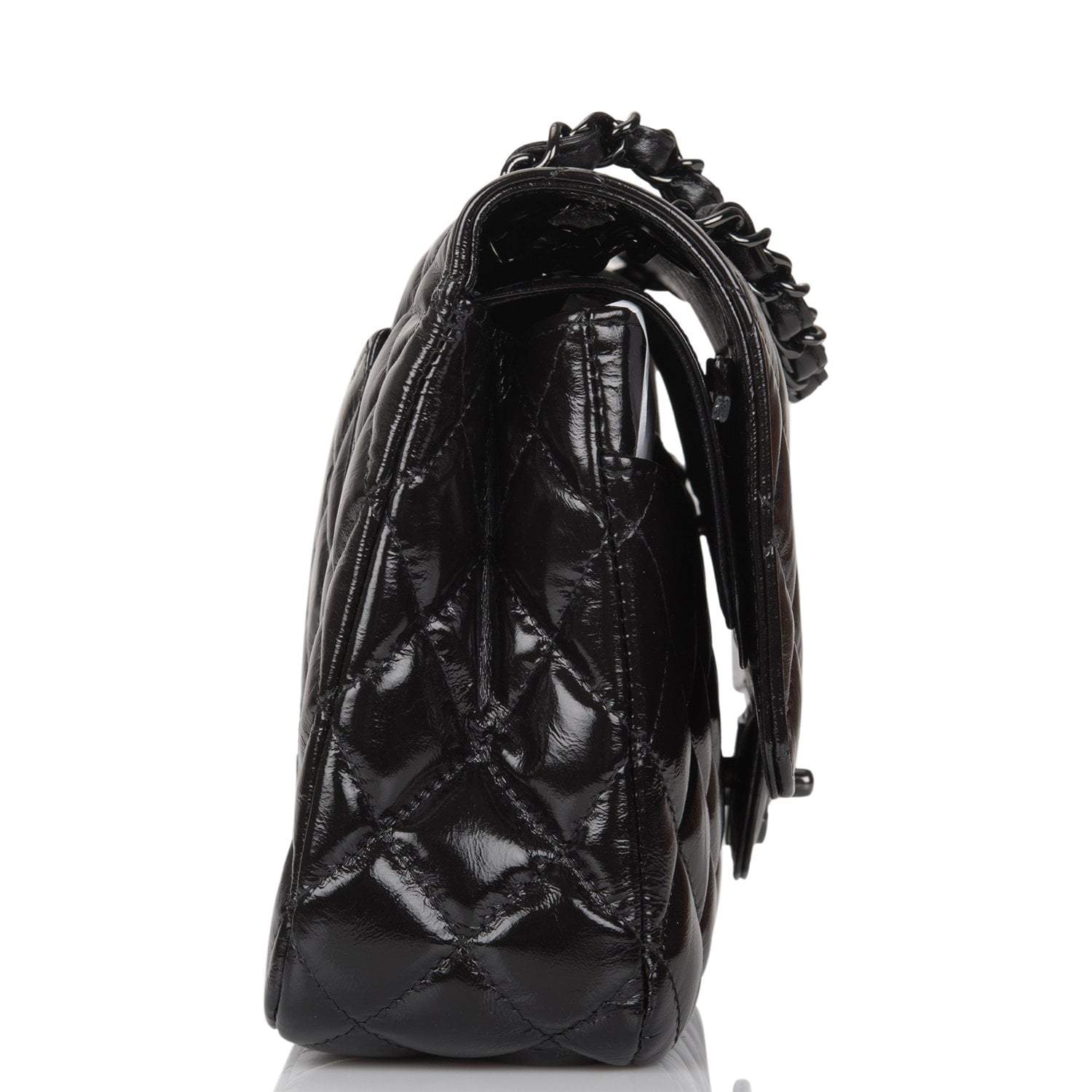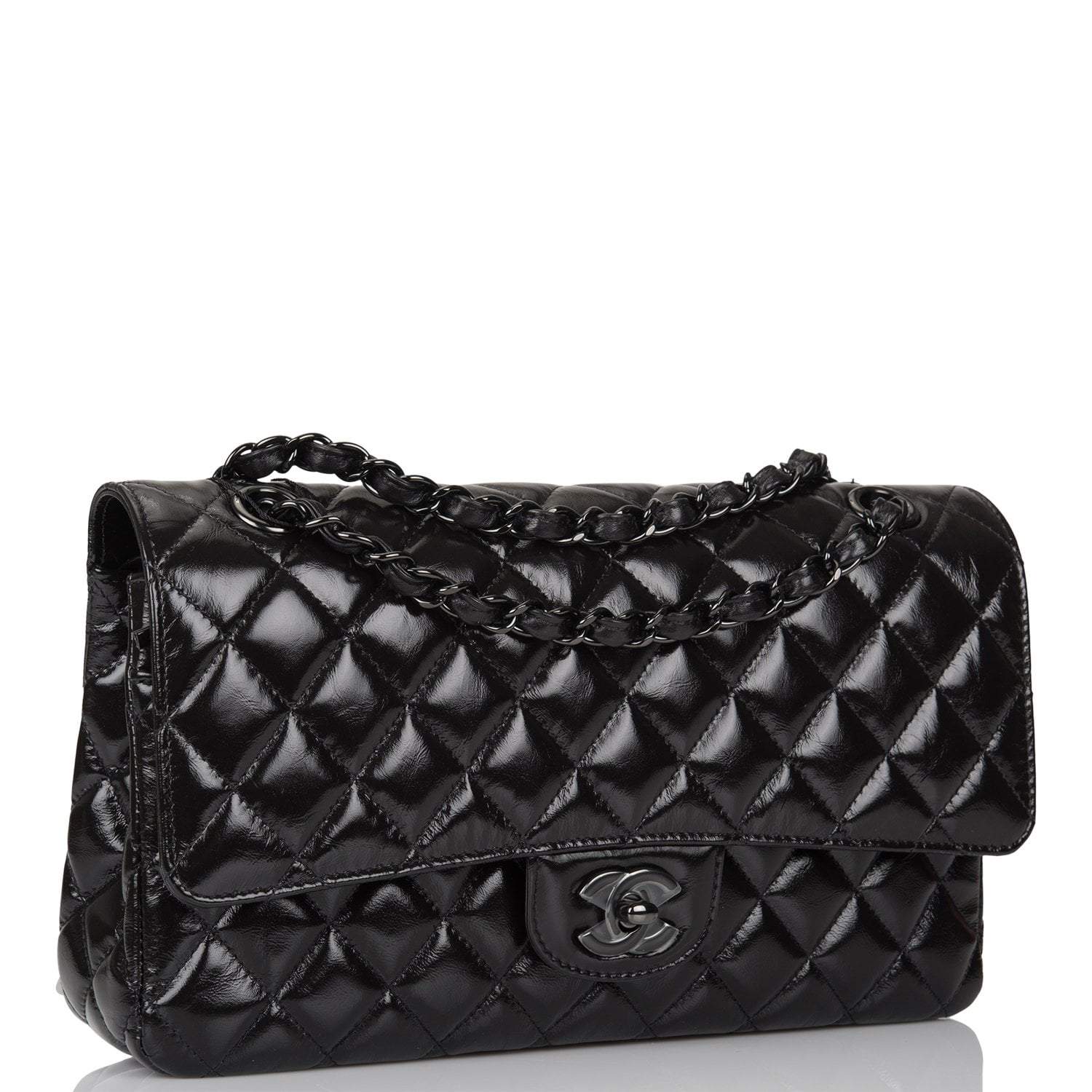 Regular price $938.88 Sale price $563.33 Save $375.55This Medium Classic Double Flap bag is in shiny black crumpled calfskin leather with black hardware and features a front flap with signature CC turnlock closure, half moon back pocket, and adjustable interwoven black chain link and black leather shoulder strap.