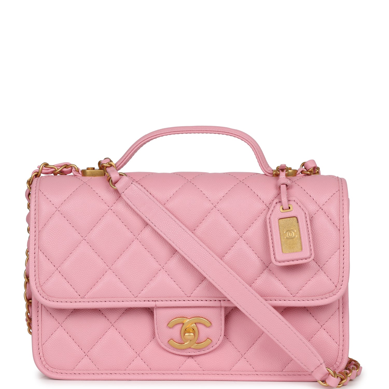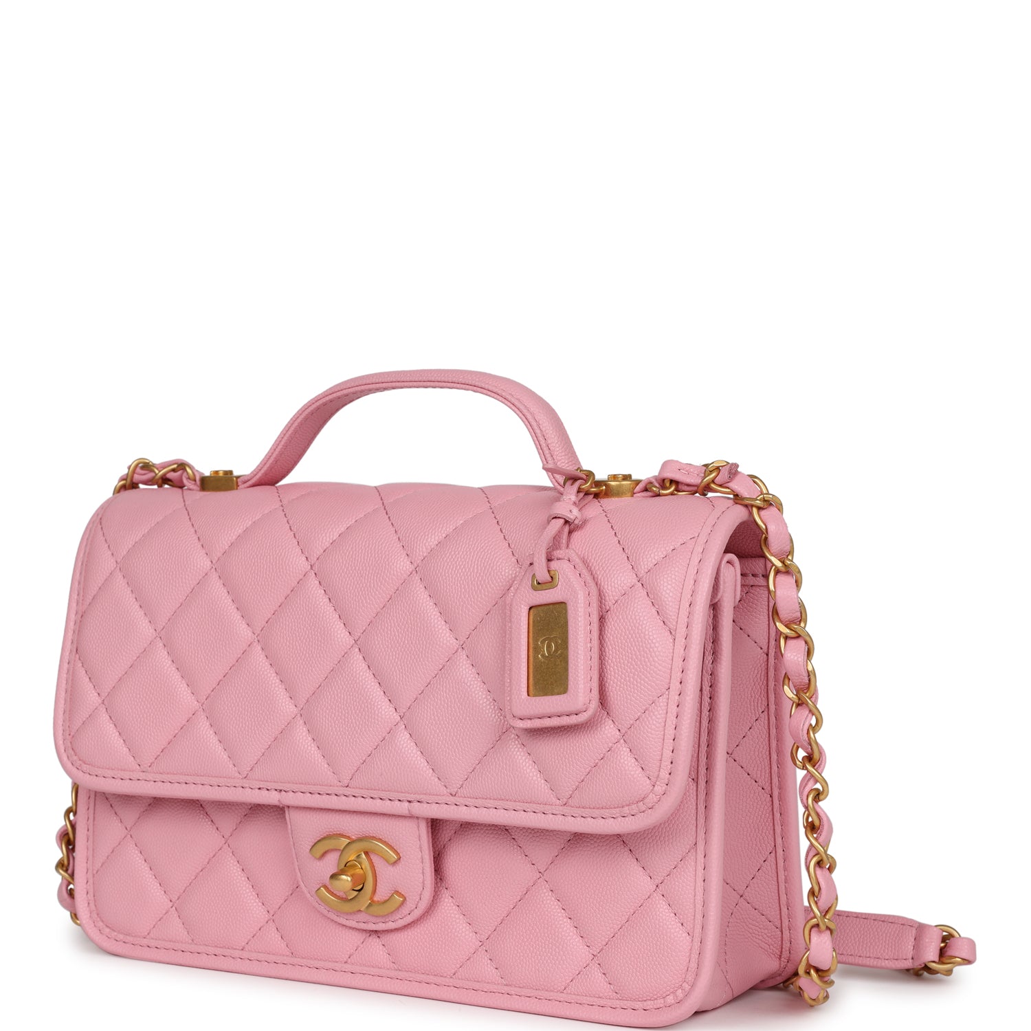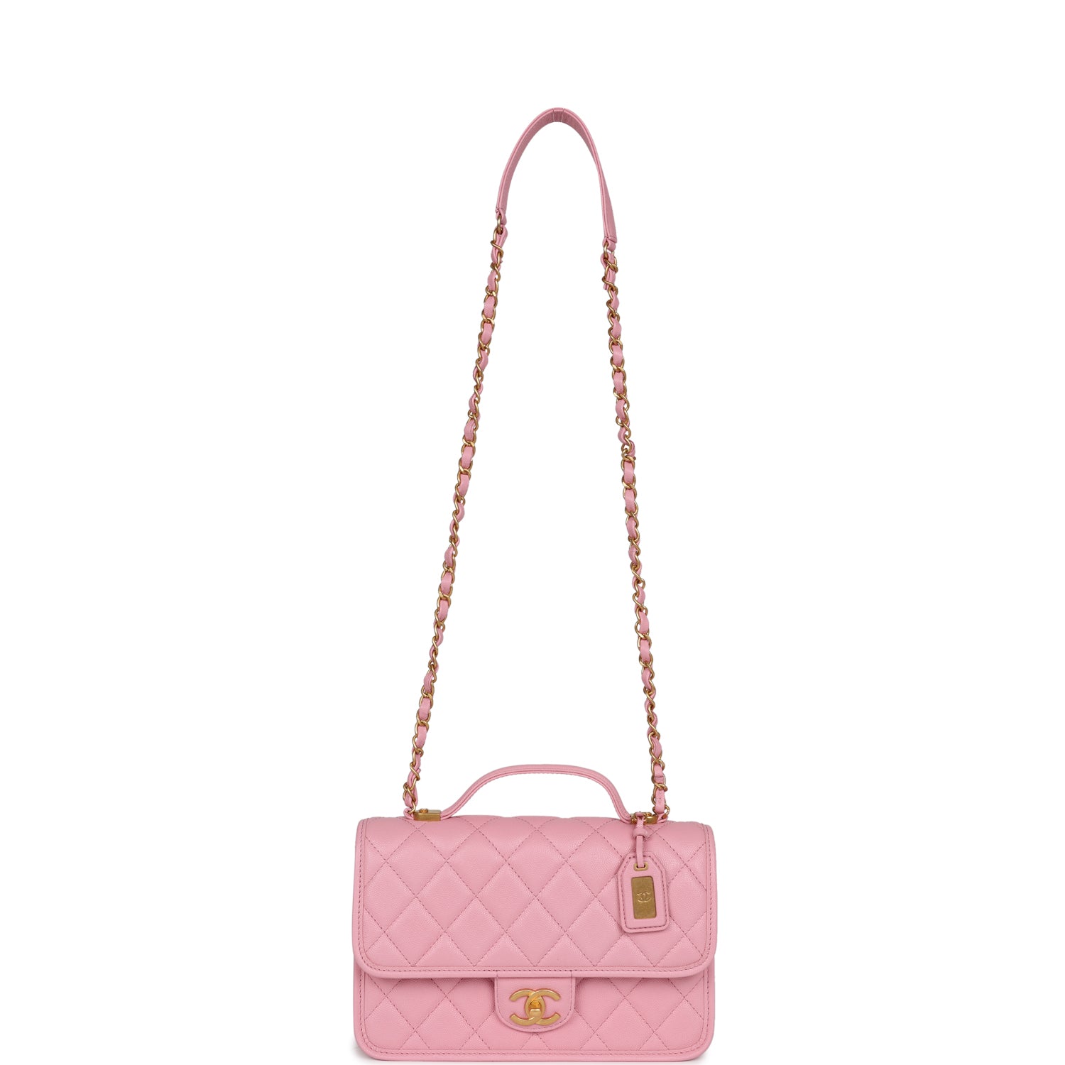 Regular price $1,790.00 Sale price $450.00 Save $1,340.00This Chanel School Memory Bag, is in pink quilted caviar leather with antique gold hardware, front flap with CC turnlock closure, back slip pocket, removable luggage tag, top handle and adjustable interwoven antique gold tone chain link and pink leather shoulder/crossbody strap.