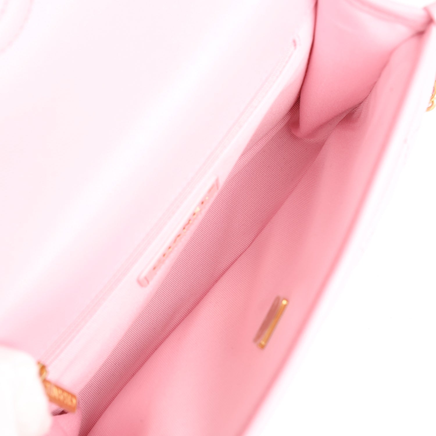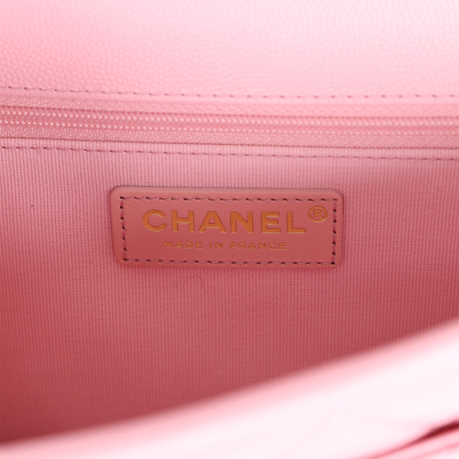 The interior is lined in pink grosgrain fabric with a zip pocket on rear wall.