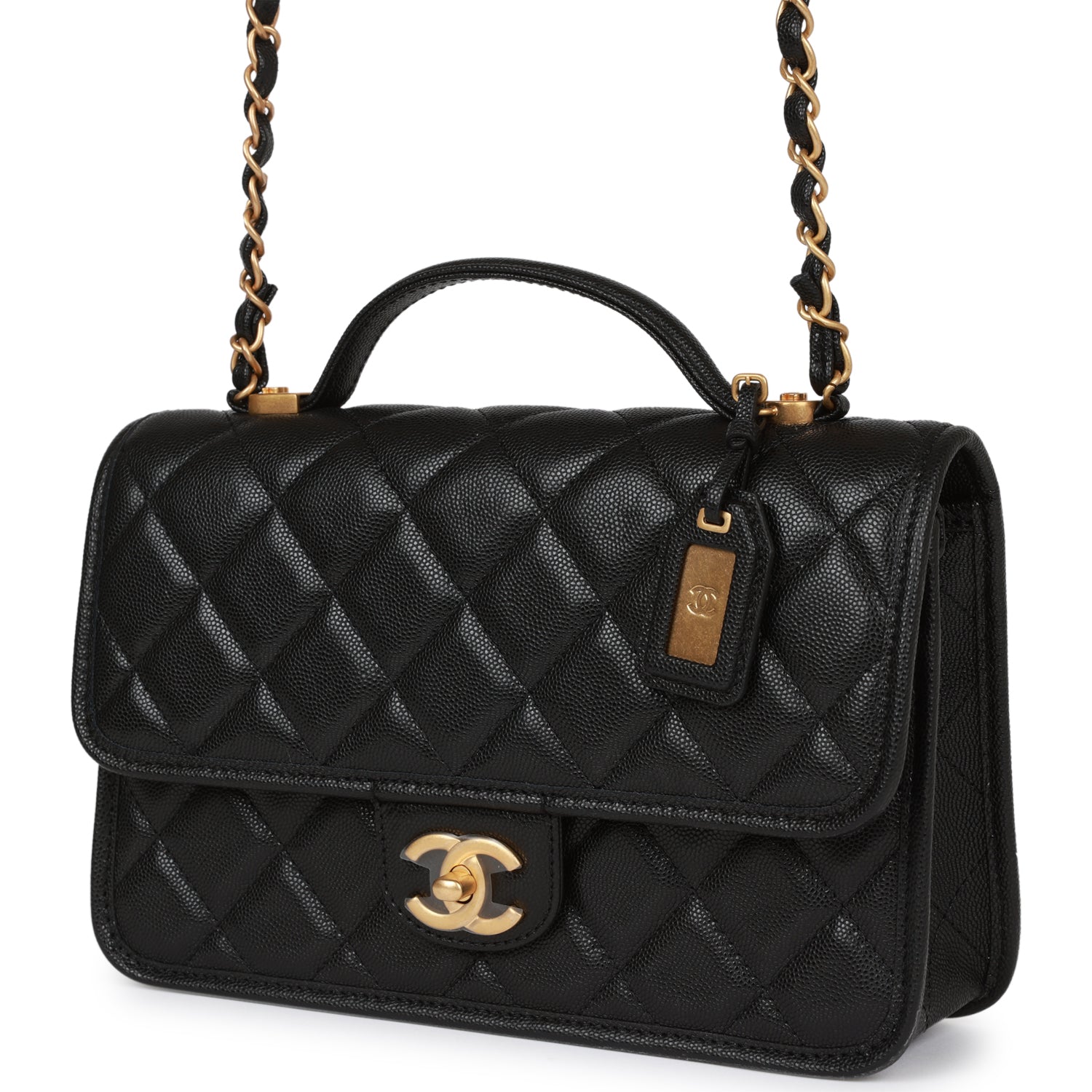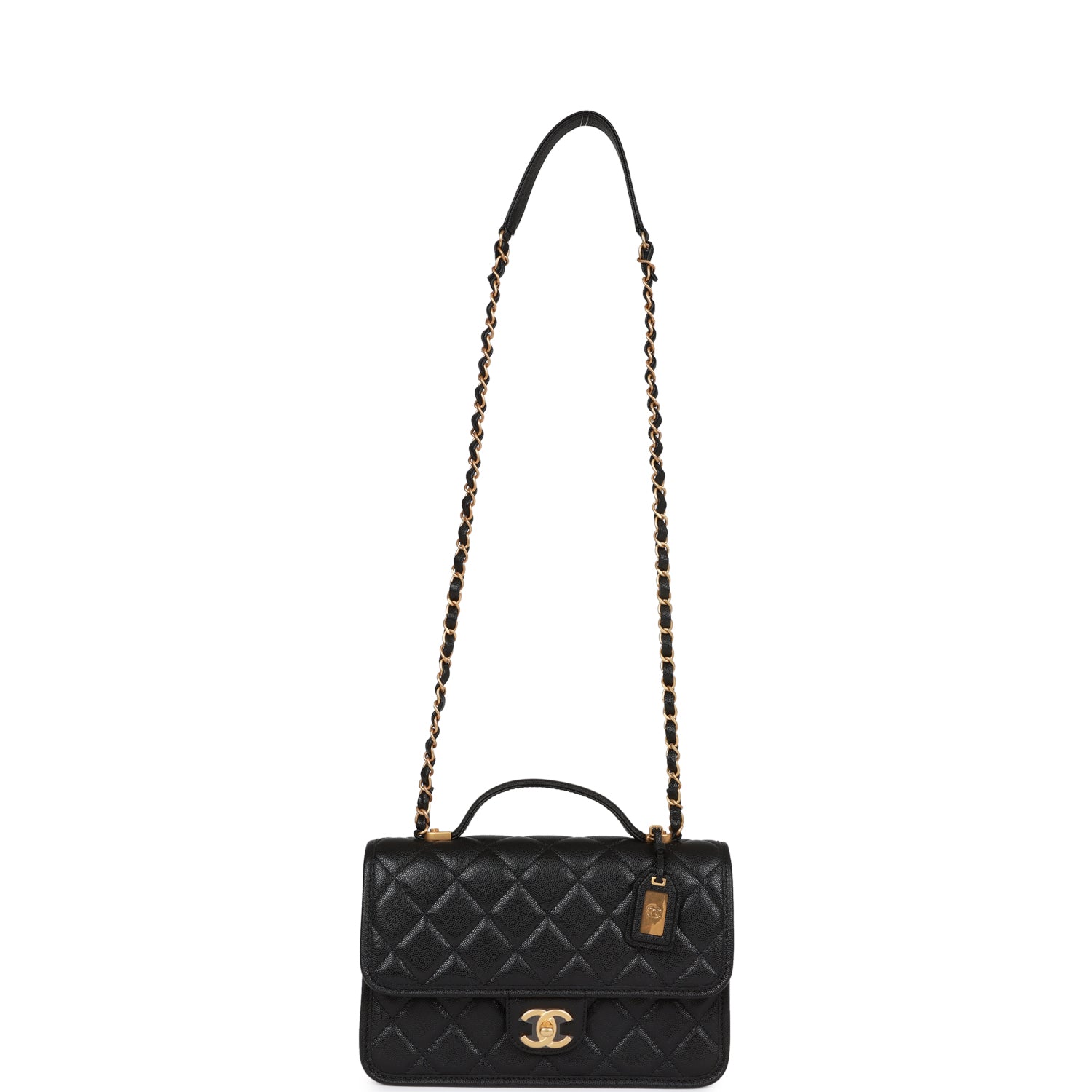 Regular price $1,990.00 Sale price $440.00 Save $1,550.00This Chanel School Memory Bag, is in black quilted caviar leather with antique gold hardware, front flap with CC turnlock closure, back slip pocket, removable luggage tag, top handle and adjustable interwoven antique gold tone chain link and black leather shoulder/crossbody strap