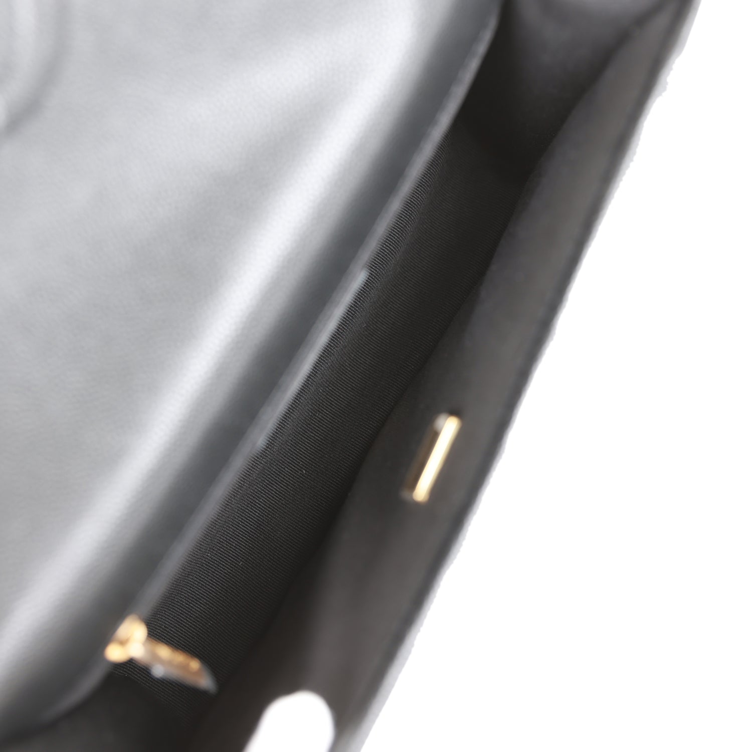 The interior is lined in grey leather with the "love letter" zipper compartment underneath the first flap, an "outer" slit pocket under the second flap, and an interior compartment with two open pockets separated by a "lipstick" compartment.