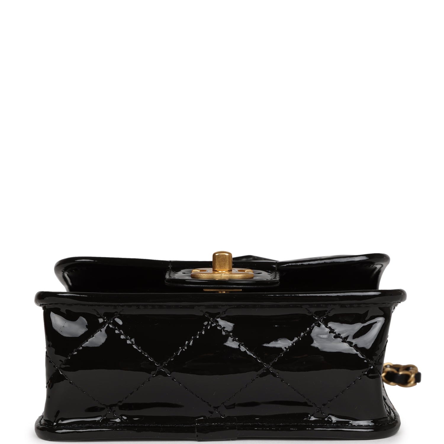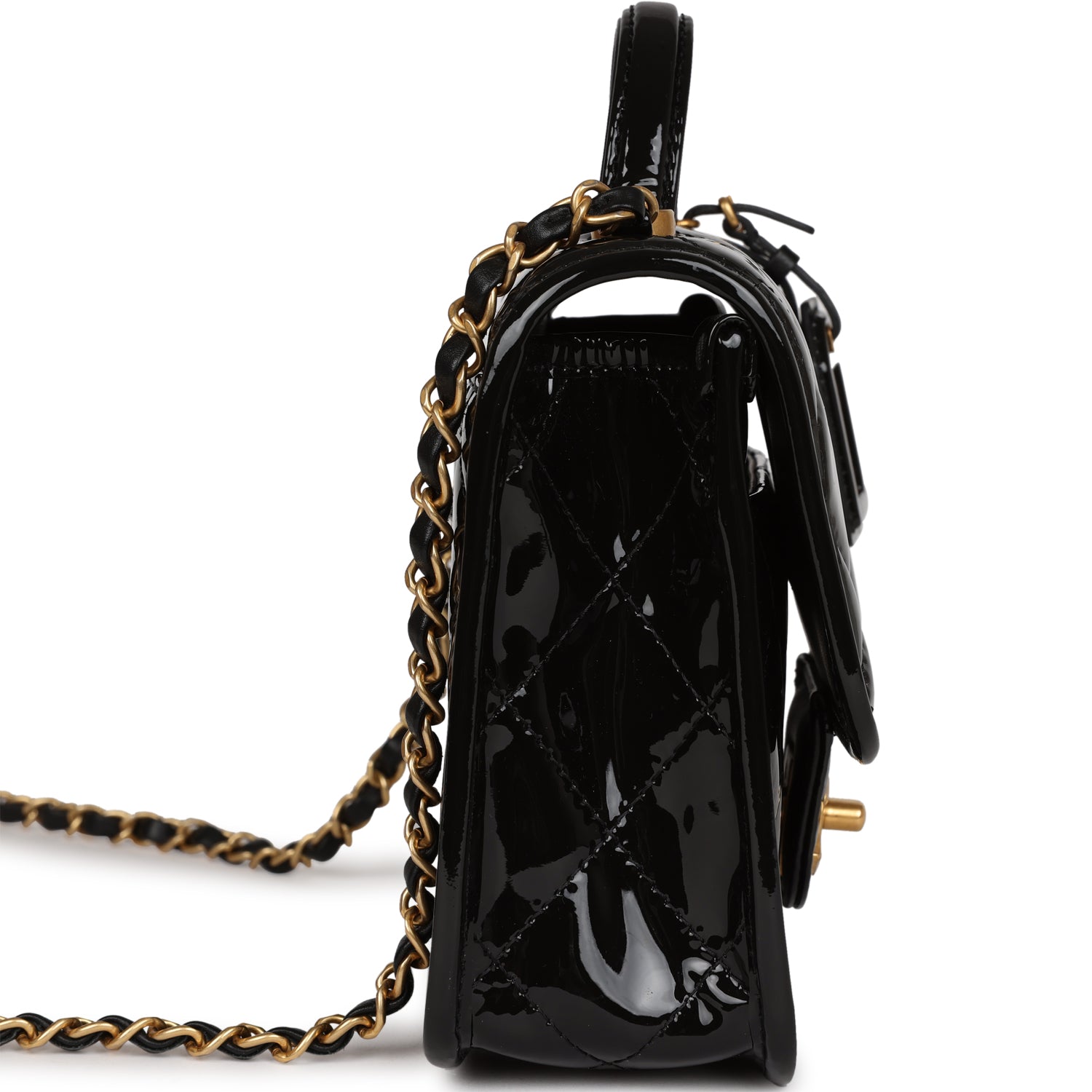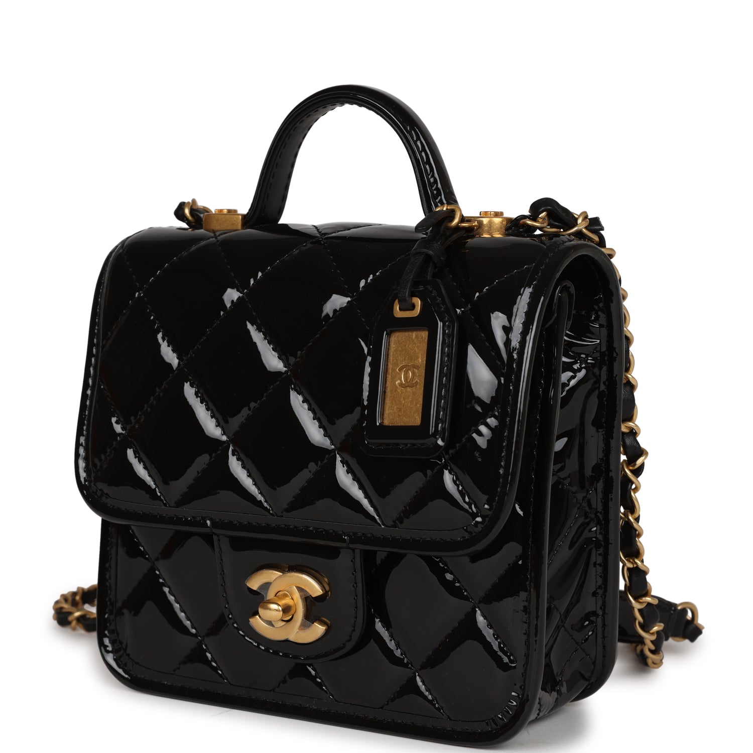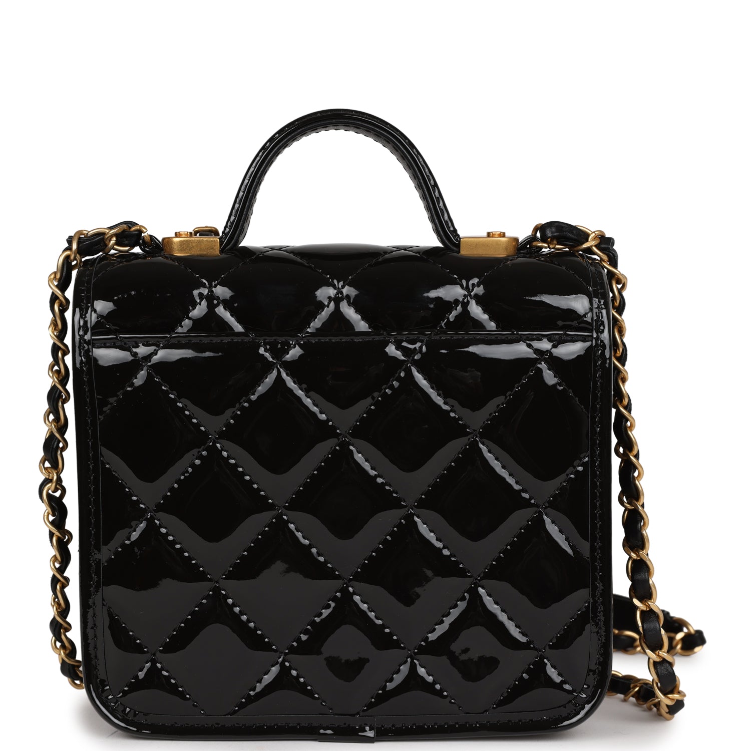 Chanel School Memory Square Top Handle Flap Bag Black Patent Leather Antique Gold Hardware