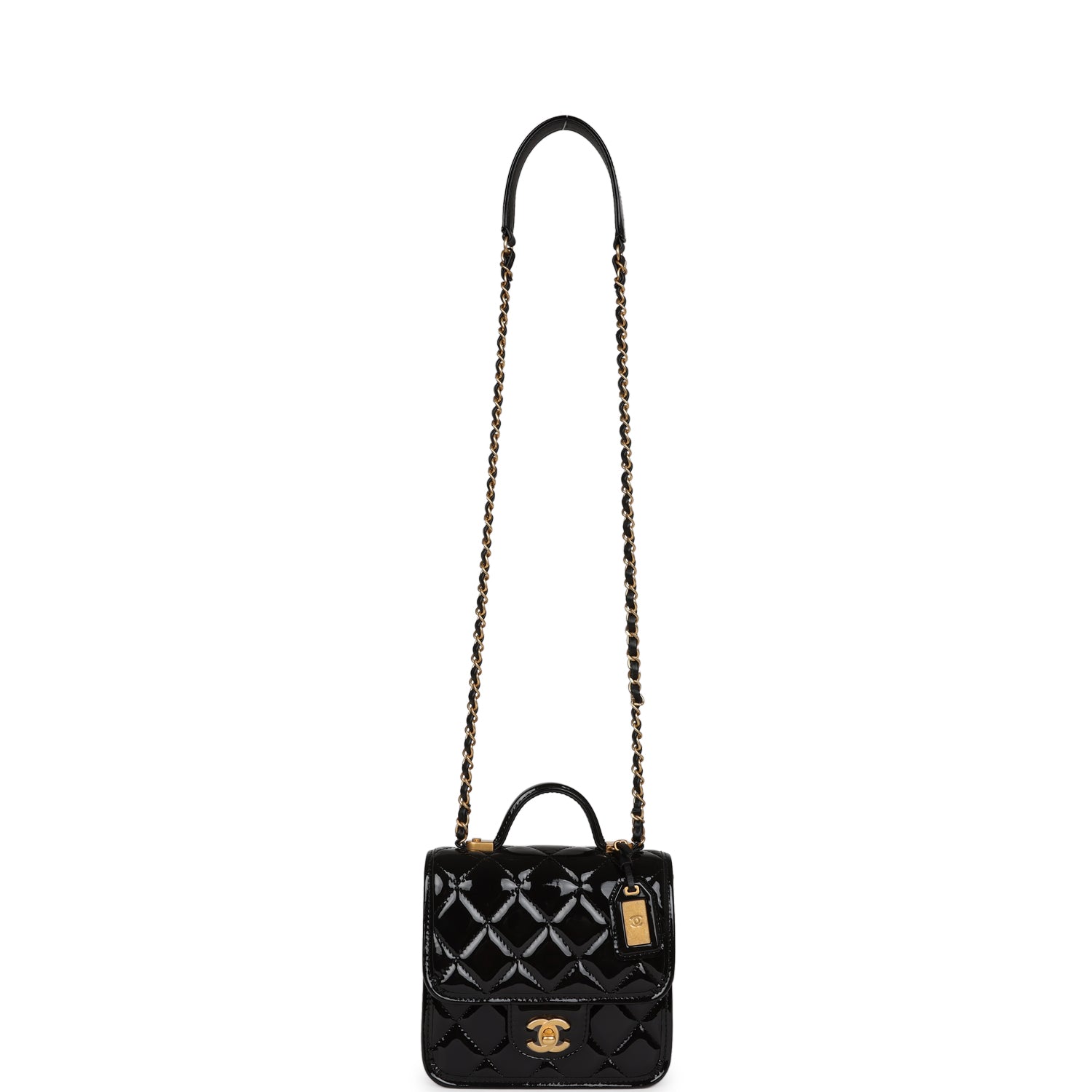 Regular price $1,980.00 Sale price $440.00 Save $1,540.00This School Memory Bag, is in black patent leather with antique gold hardware, front flap with CC turnlock closure, back slip pocket, removable luggage tag, top handle and adjustable interwoven antique gold tone chain link and black leather shoulder/crossbody strap.