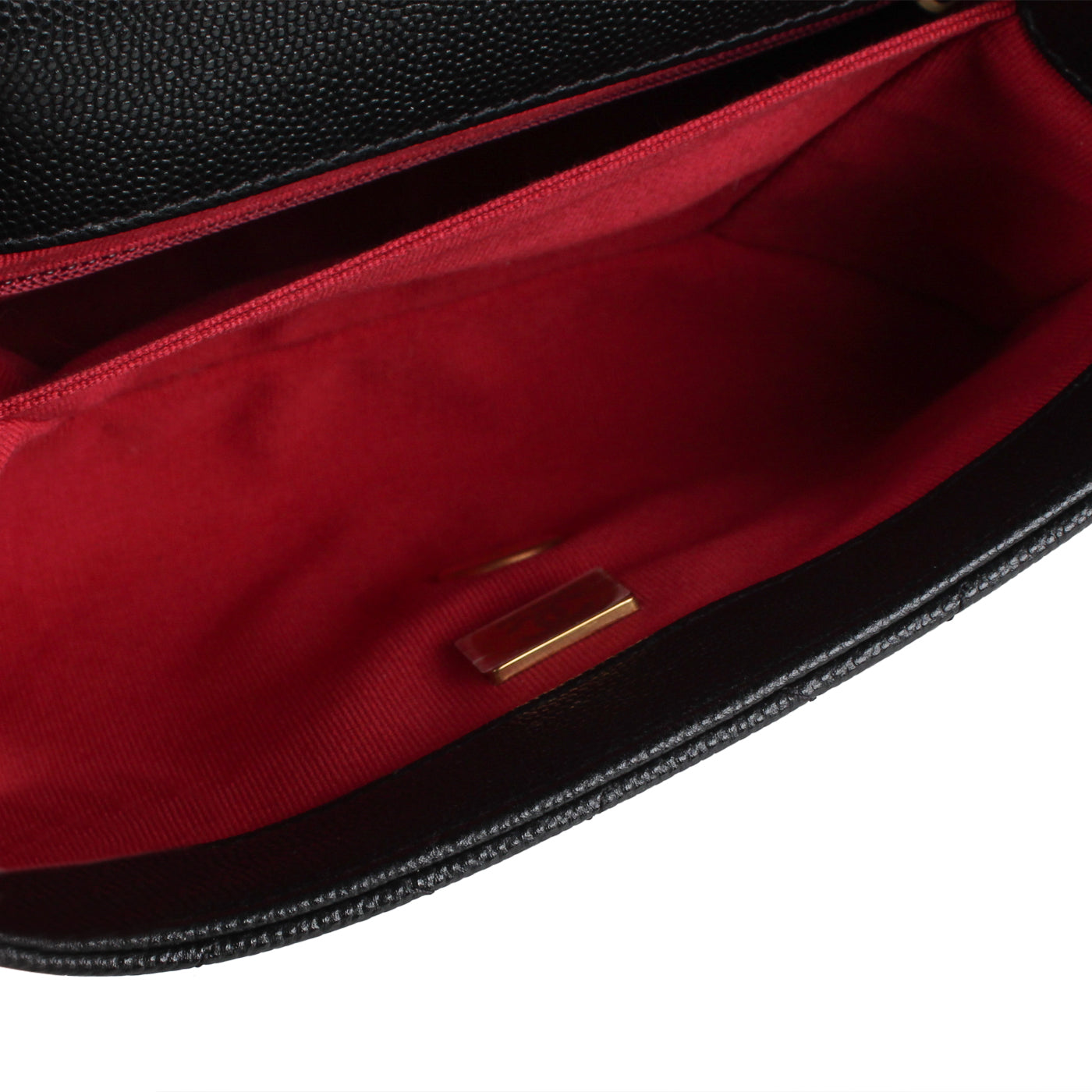 The interior is lined in burgundy leather with the "love letter" zipper compartment underneath the first flap, an "outer" slit pocket under the second flap, and an interior compartment with two open pockets separated by a "lipstick" compartment.