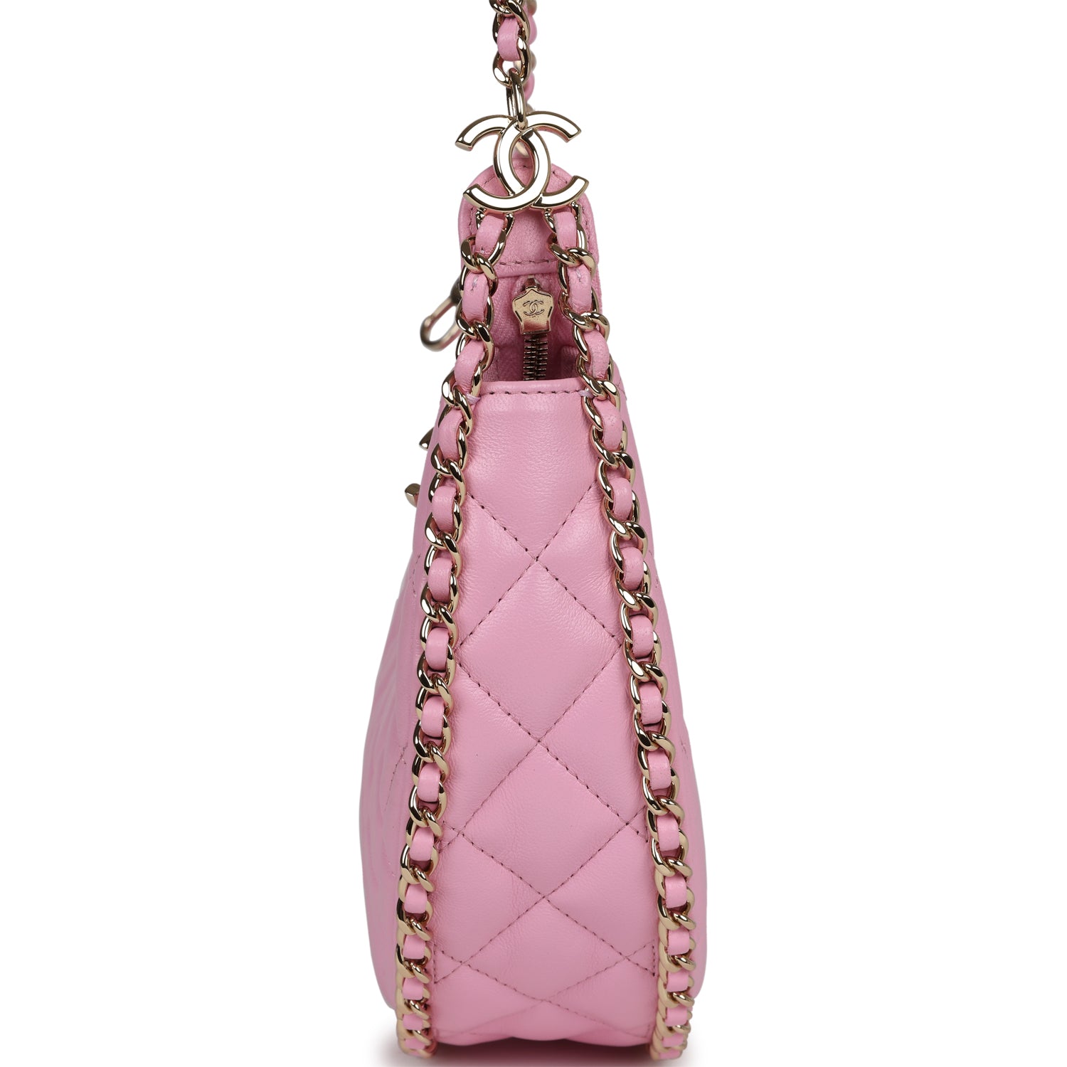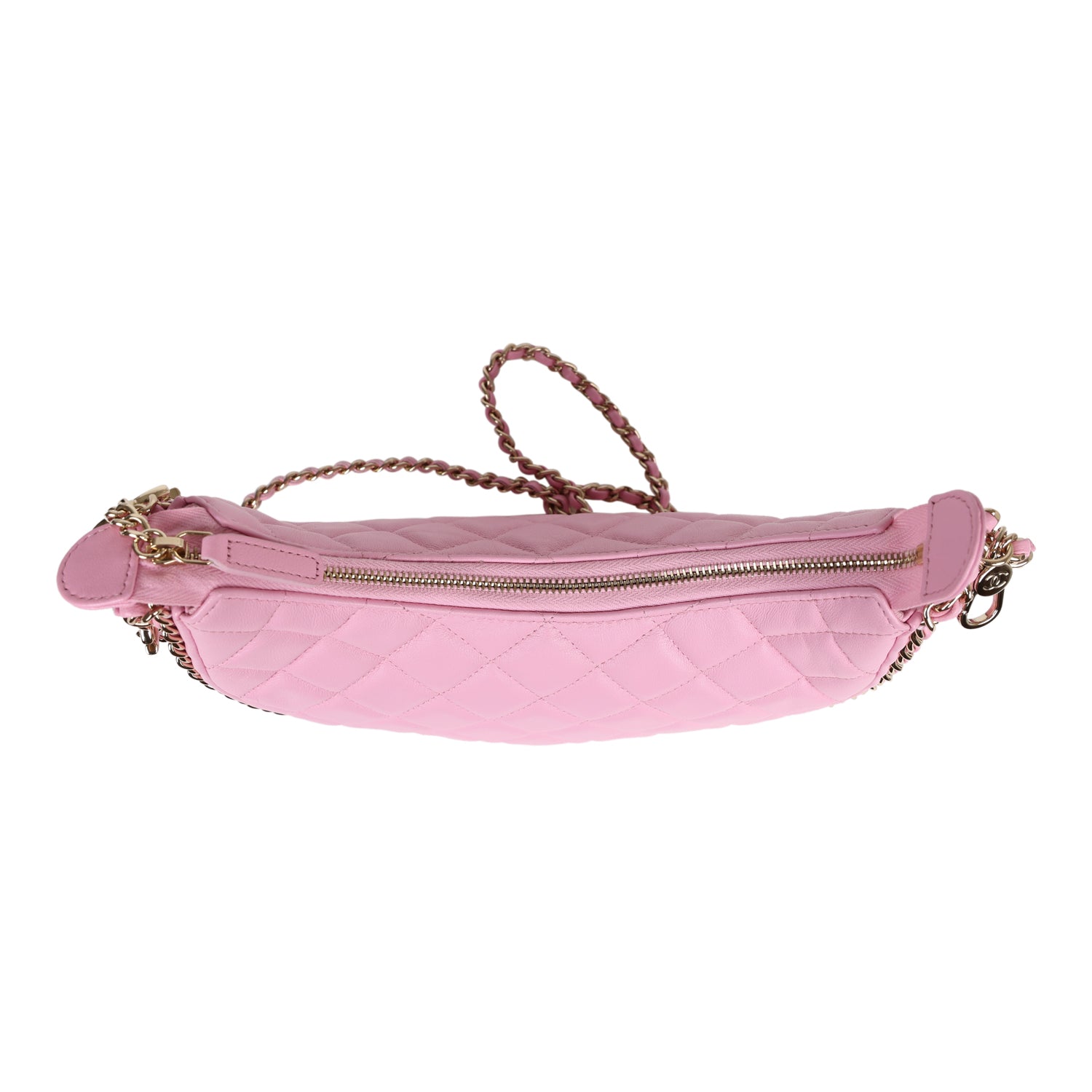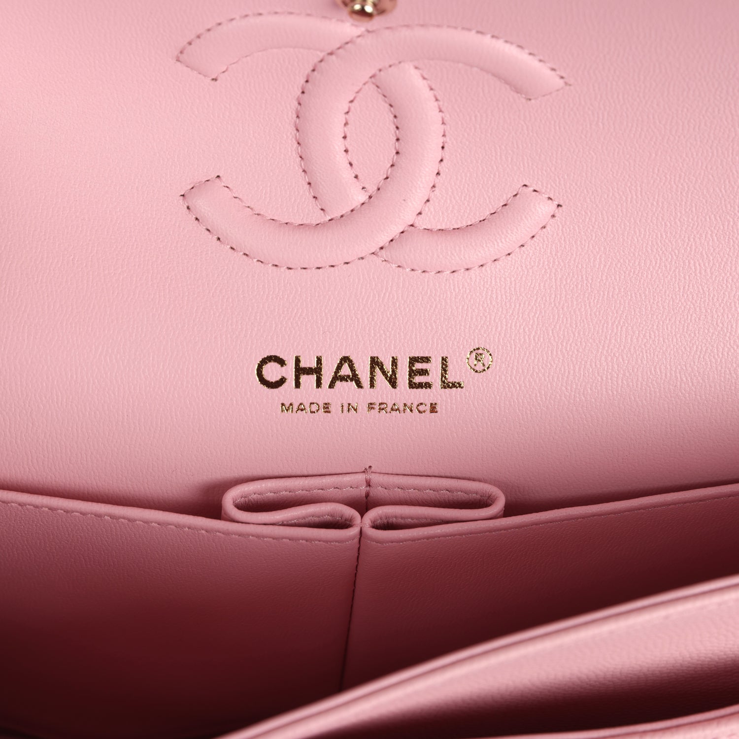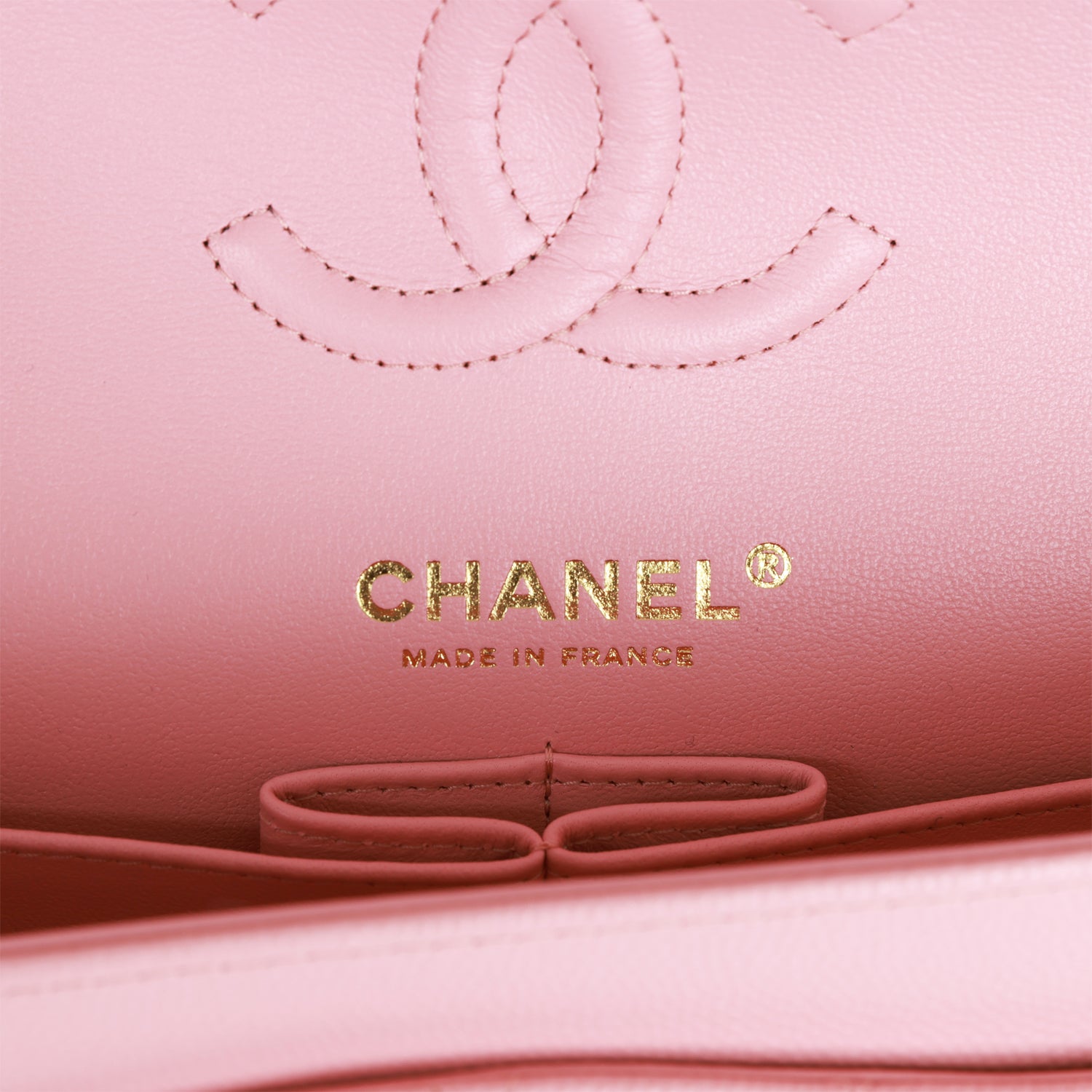 Regular price $18,700.00 Sale price $1,330.00 Save $17,370.00This Small Classic Flap Bag is in pink caviar leather with light gold hardware and features a front flap with CC turnlock closure, halfmoon back pocket and adjustable interwoven light gold tone chain link and pink leather shoulder/crossbody strap.