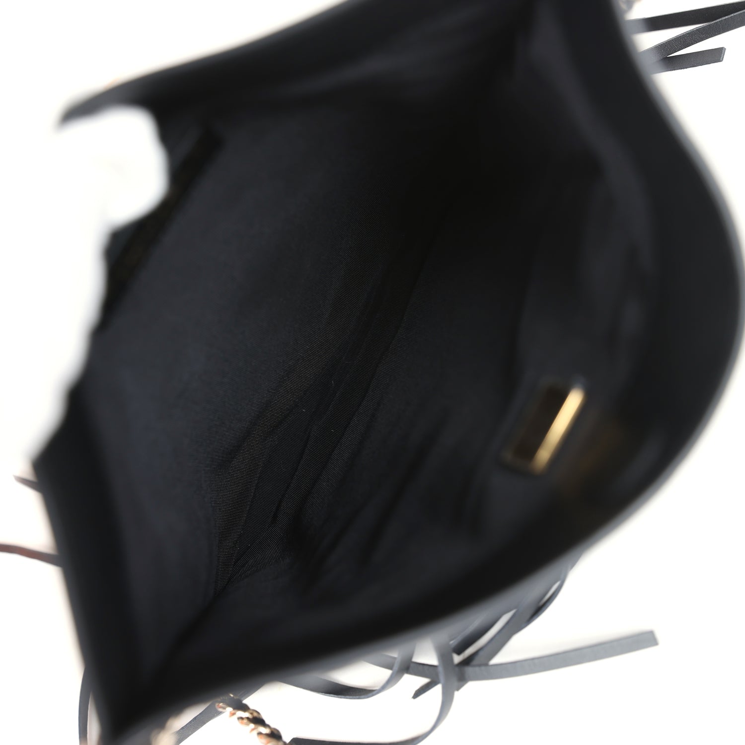 The interior is lined in black leather with the "love letter" zipper compartment underneath the first flap, an "outer" slit pocket under the second flap, and an interior compartment with two open pockets separated by a "lipstick" compartment.