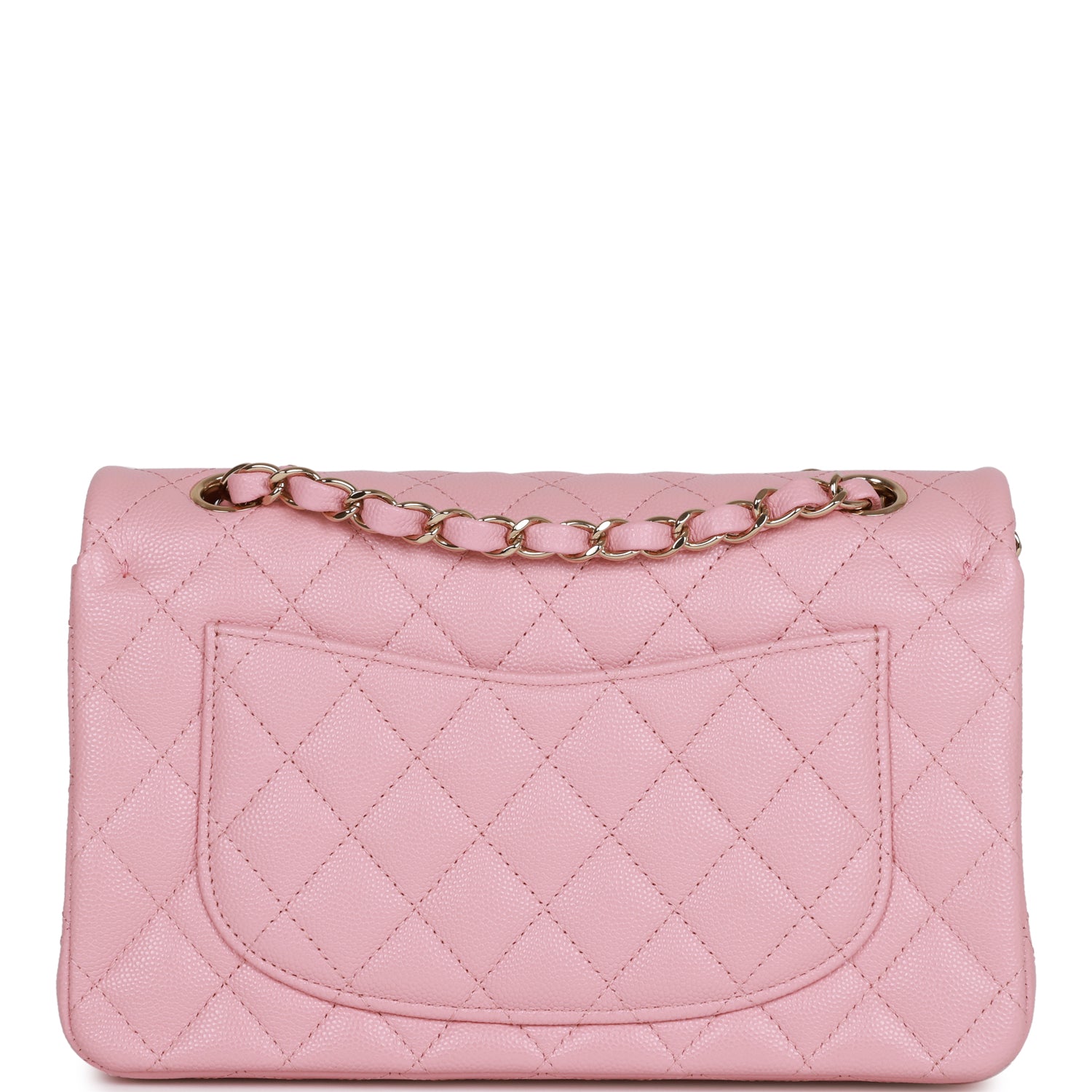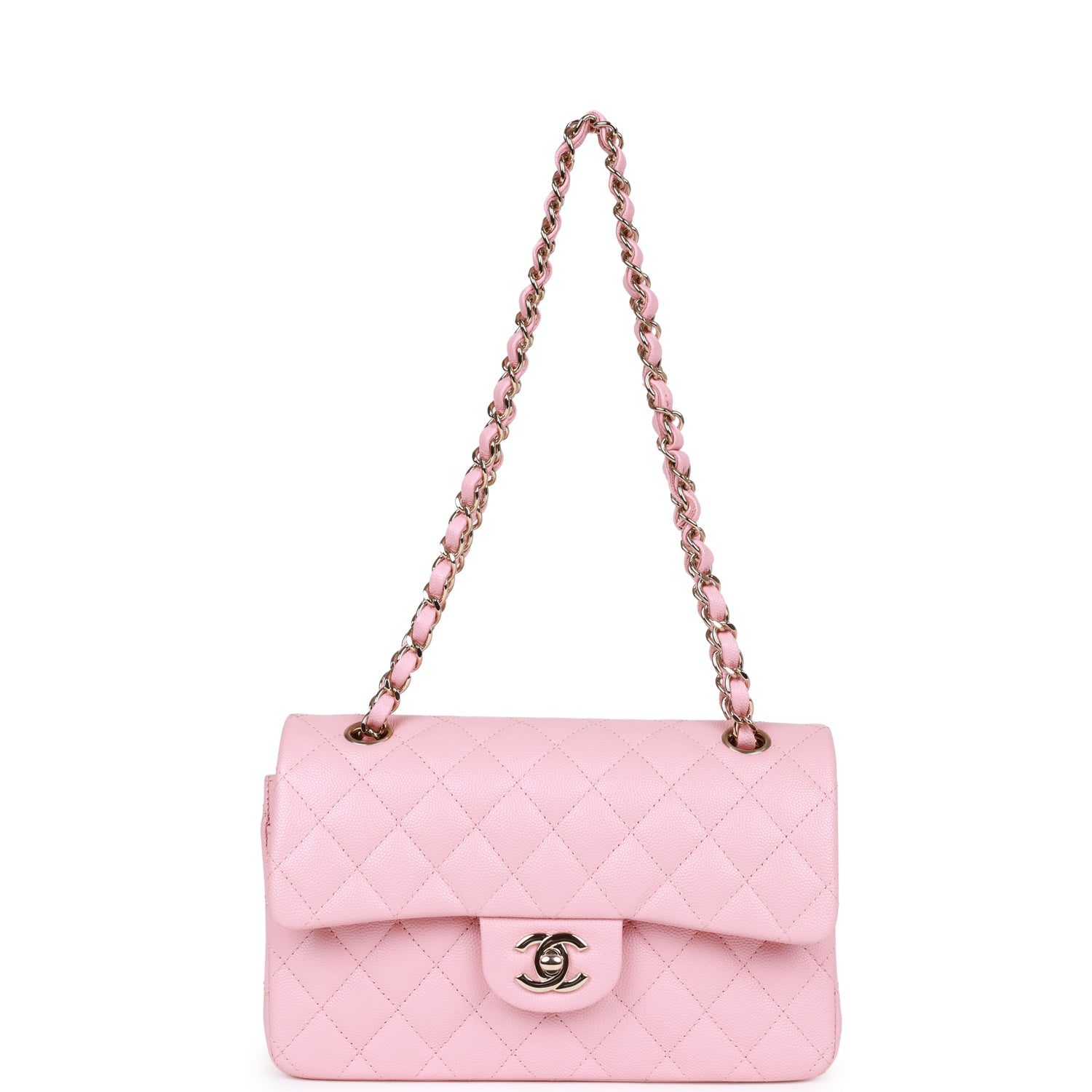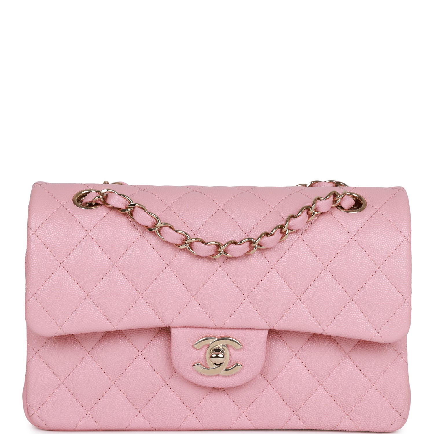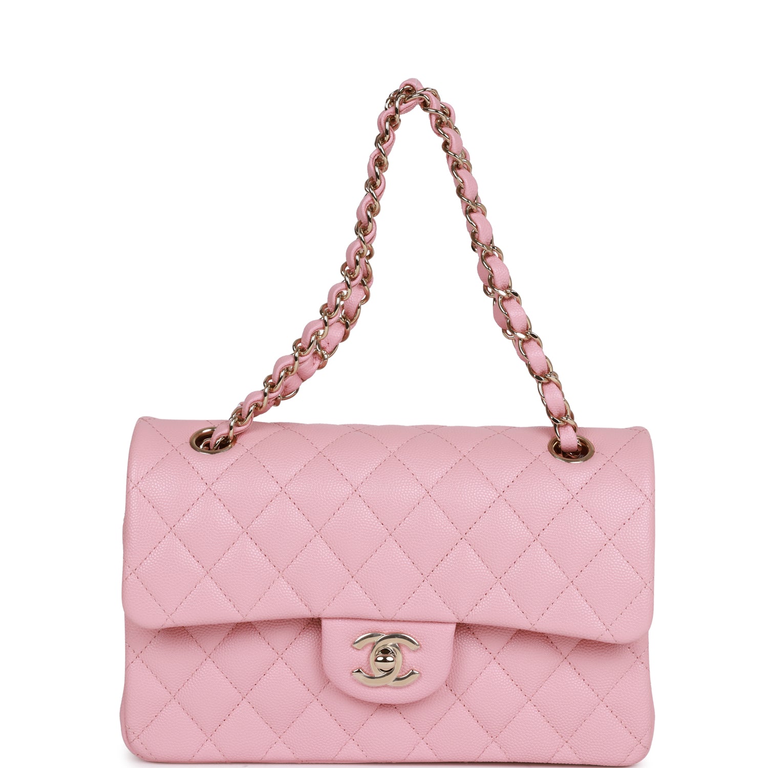 Regular price $17,630.00 Sale price $1,130.00 Save $16,500.00This Small Classic Flap Bag is in pink caviar leather with light gold hardware and features a front flap with CC turnlock closure, halfmoon back pocket and adjustable interwoven light gold tone chain link and pink leather shoulder/crossbody strap.