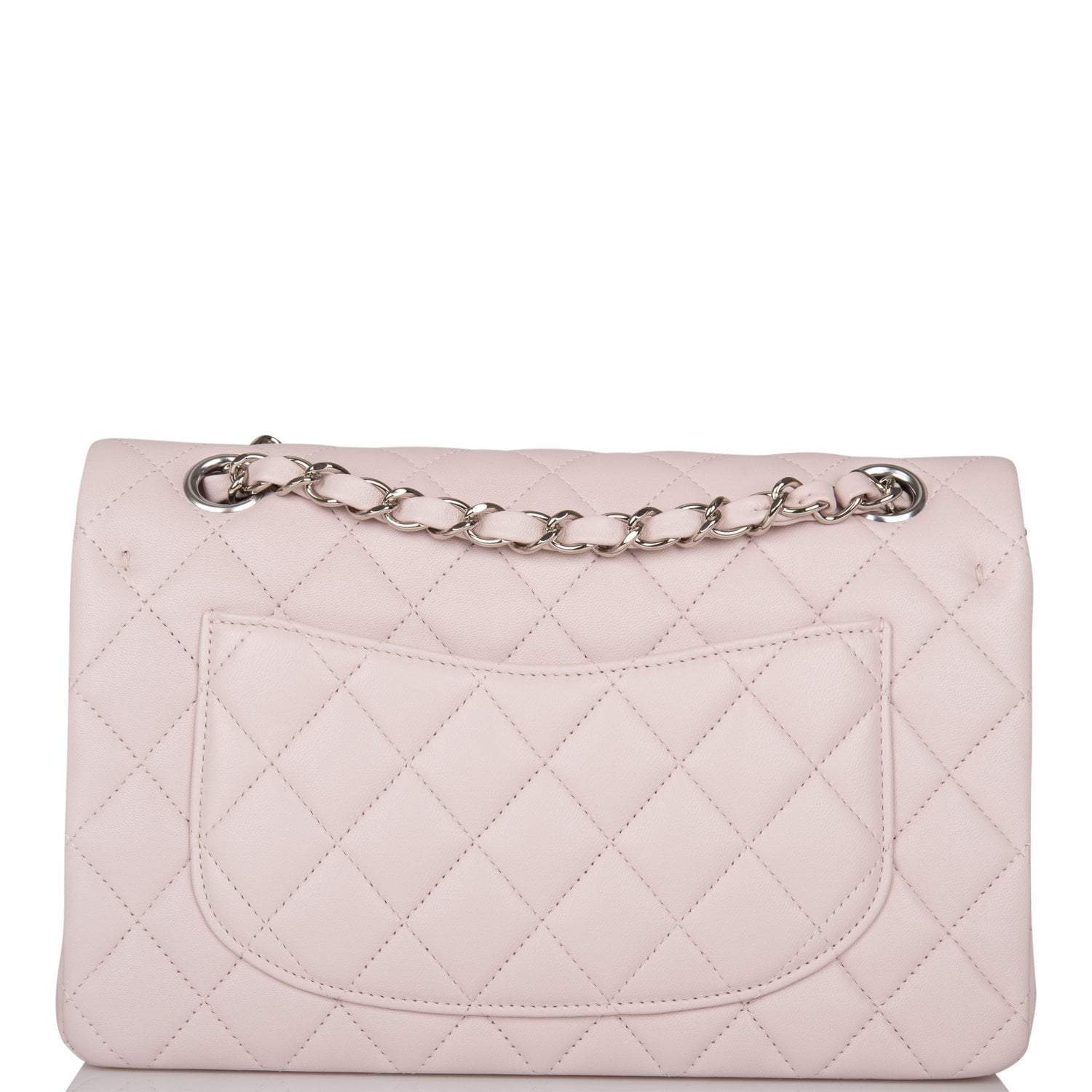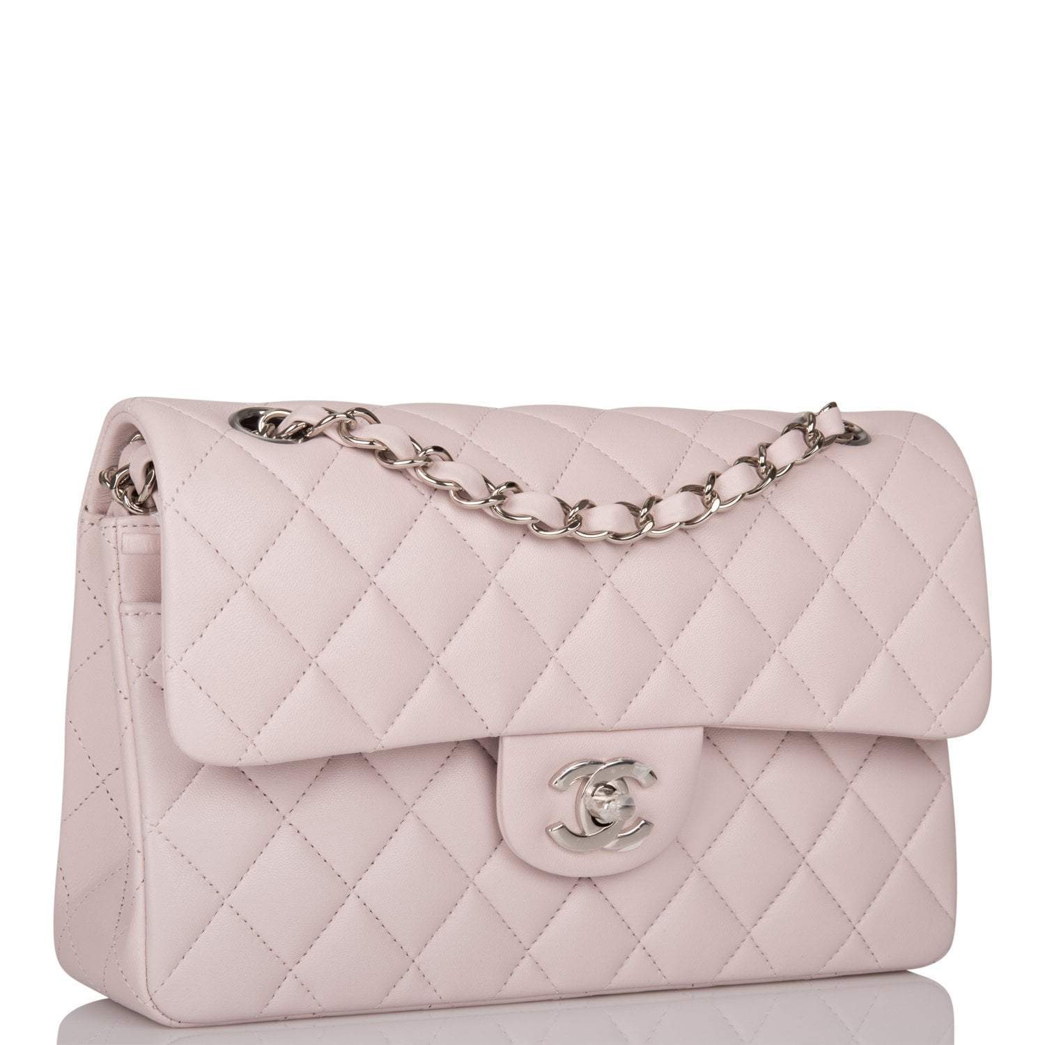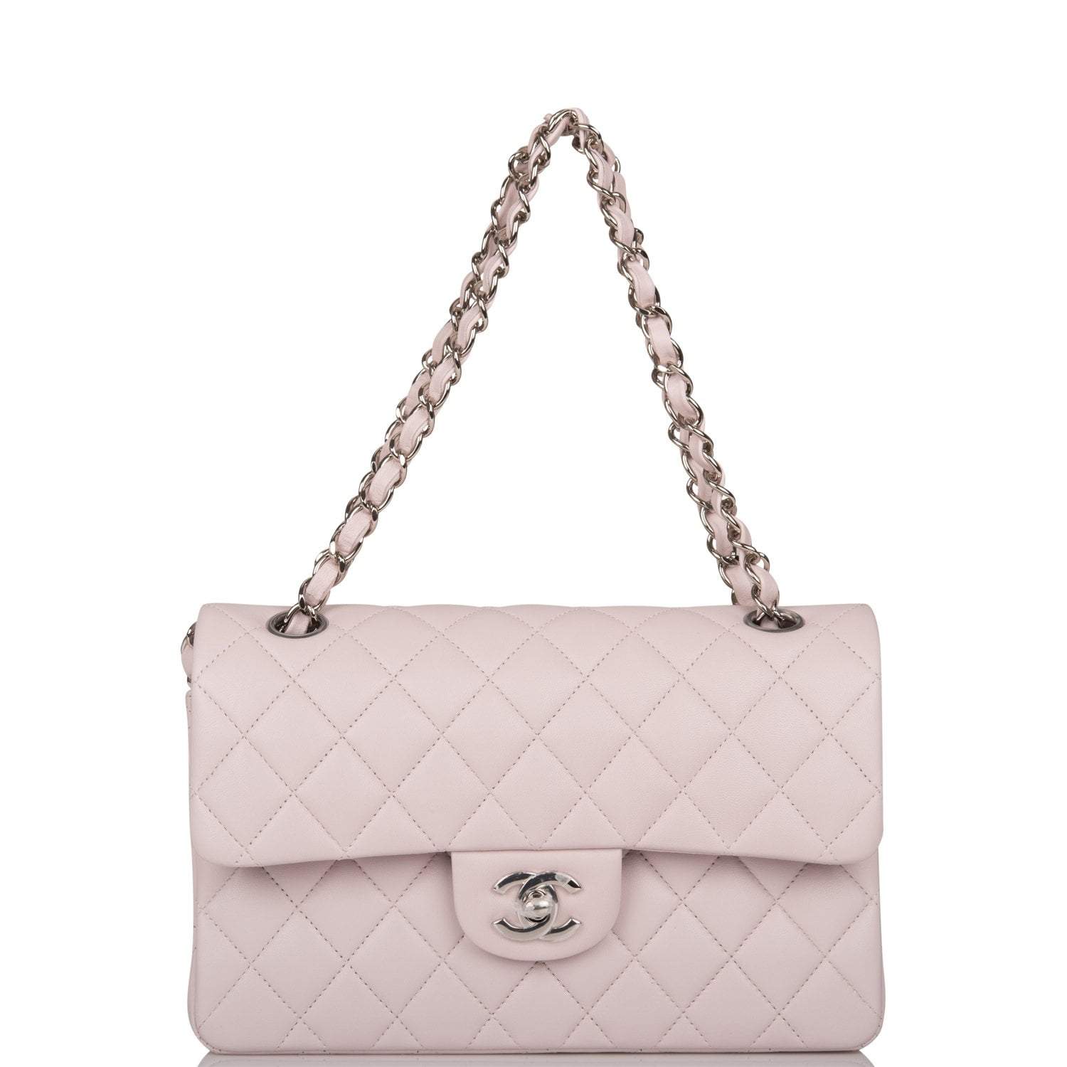 Regular price $1,095.26 Sale price $657.16 Save $438.10This Small Classic Double Flap bag is in light purple lambskin leather with silver tone hardware and features a front flap with signature CC turnlock closure, half moon back pocket, and adjustable interwoven silver tone chain link and light purple leather shoulder strap.