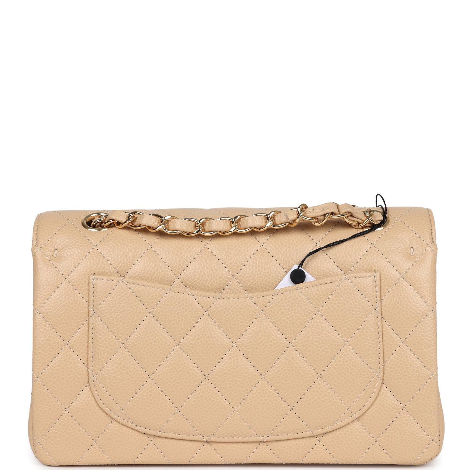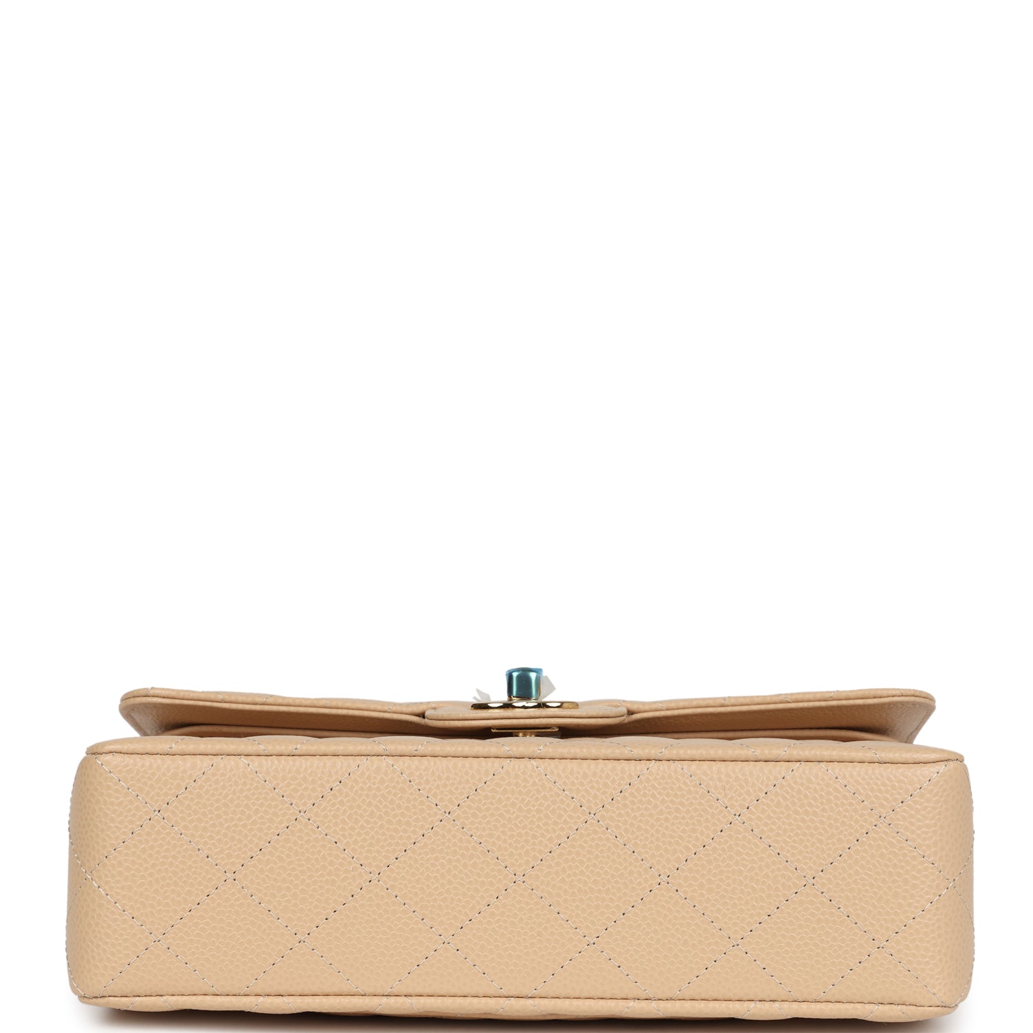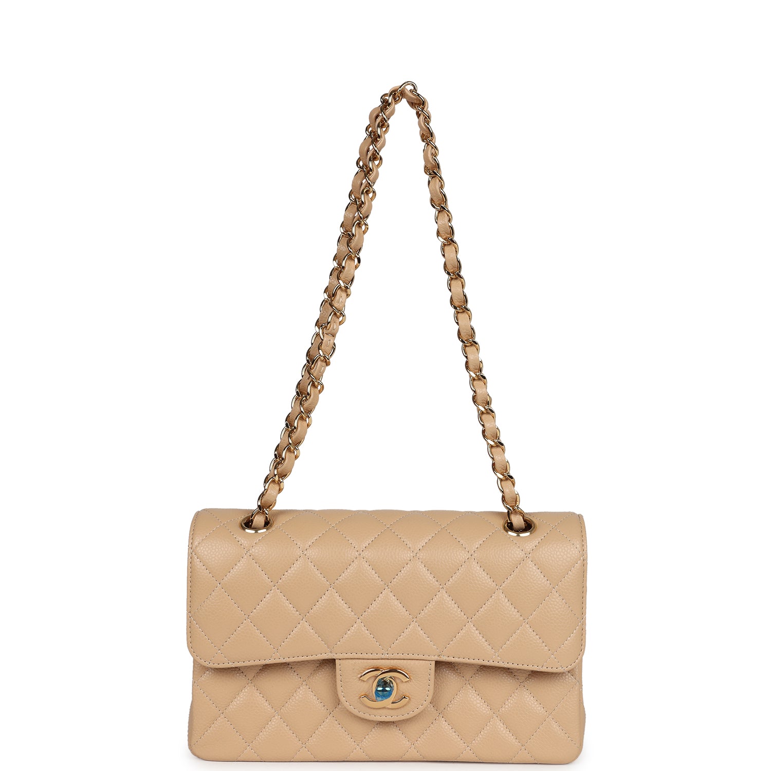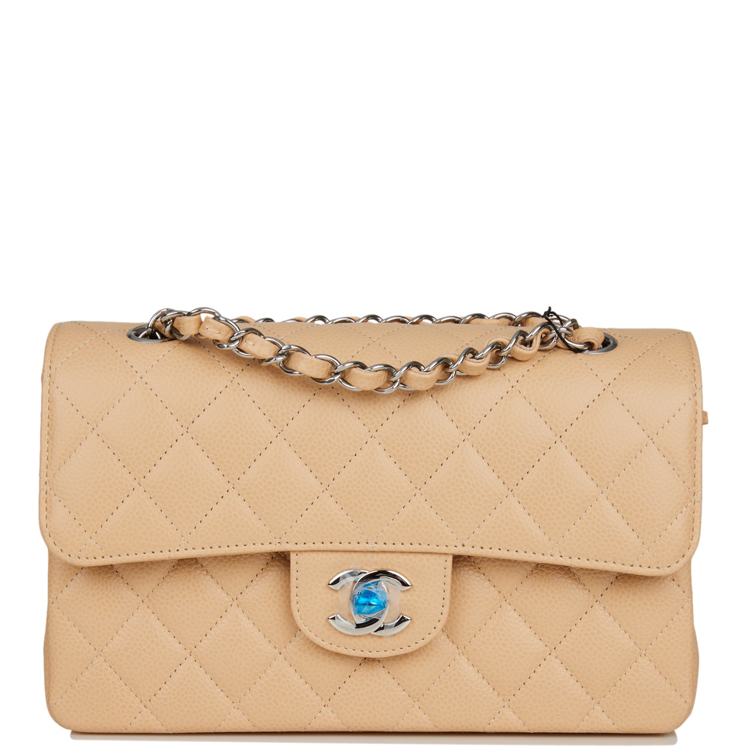 Regular price $2,150.00 Sale price $440.00 Save $1,710.00This Small Classic Double Flap bag is in beige caviar leather with silver tone hardware and features a front flap with signature CC turnlock closure, half moon back pocket, and adjustable interwoven silver tone chain link and beige leather shoulder strap.