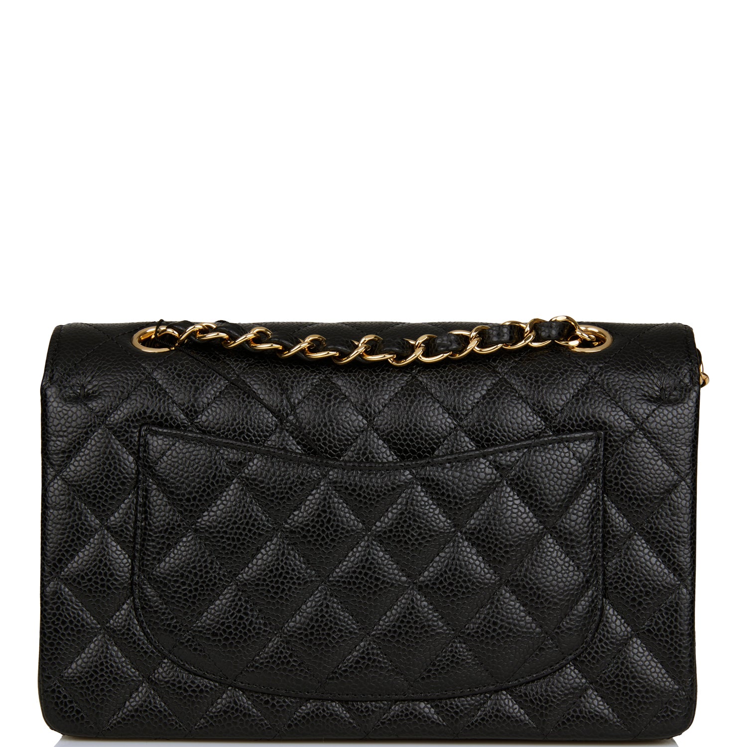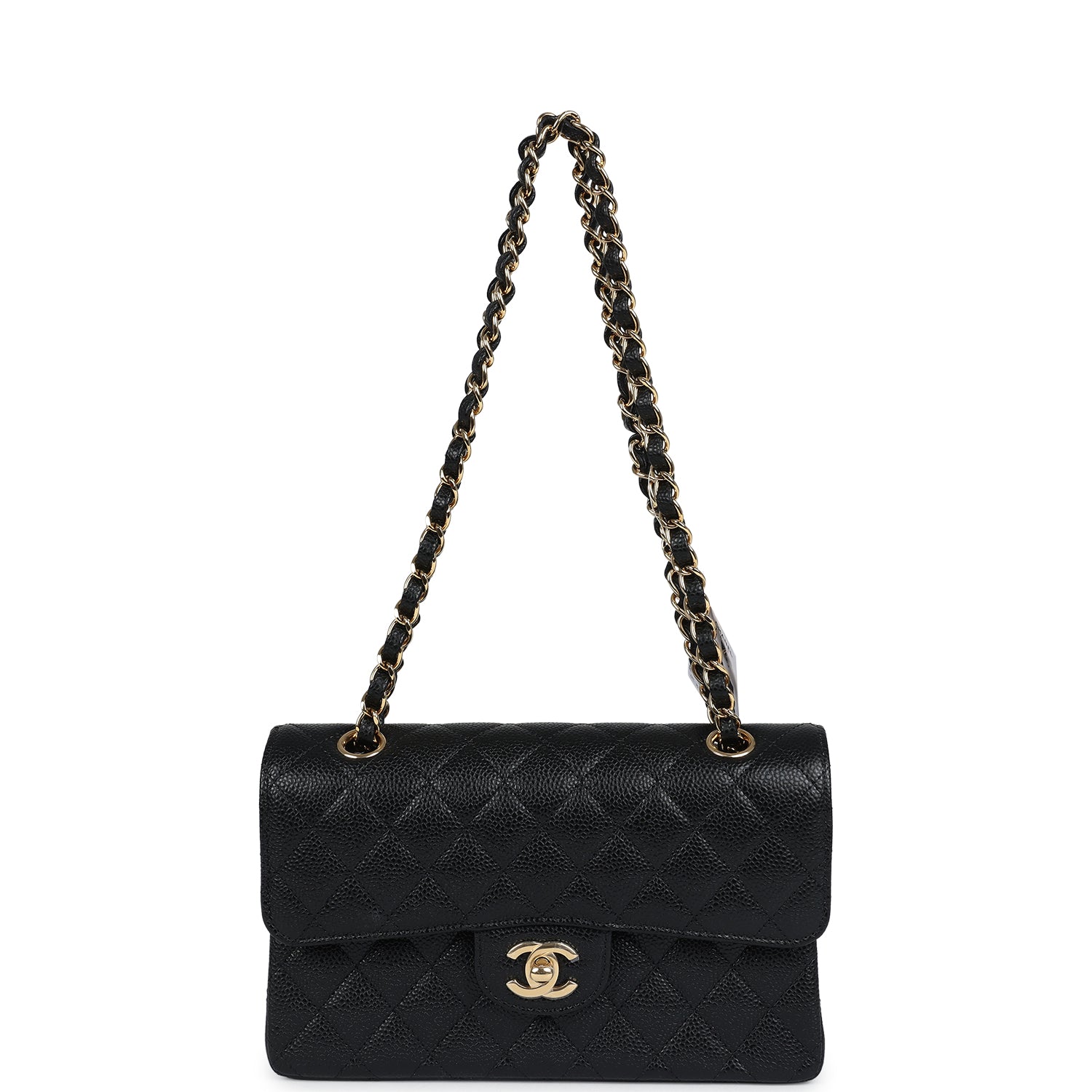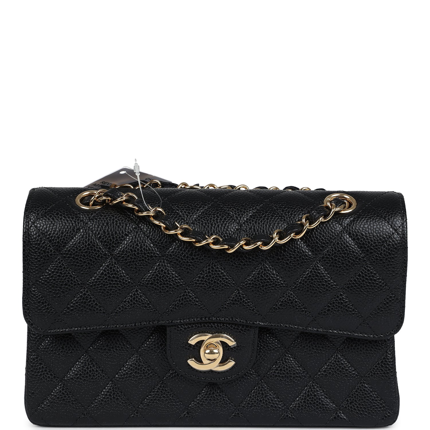 Regular price $2,290.00 Sale price $700.00 Save $1,590.00Small Classic Double Flap bag is in black caviar leather with gold tone hardware and features a front flap with signature CC turnlock closure, half moon back pocket, and adjustable interwoven gold tone chain link and black leather shoulder strap.