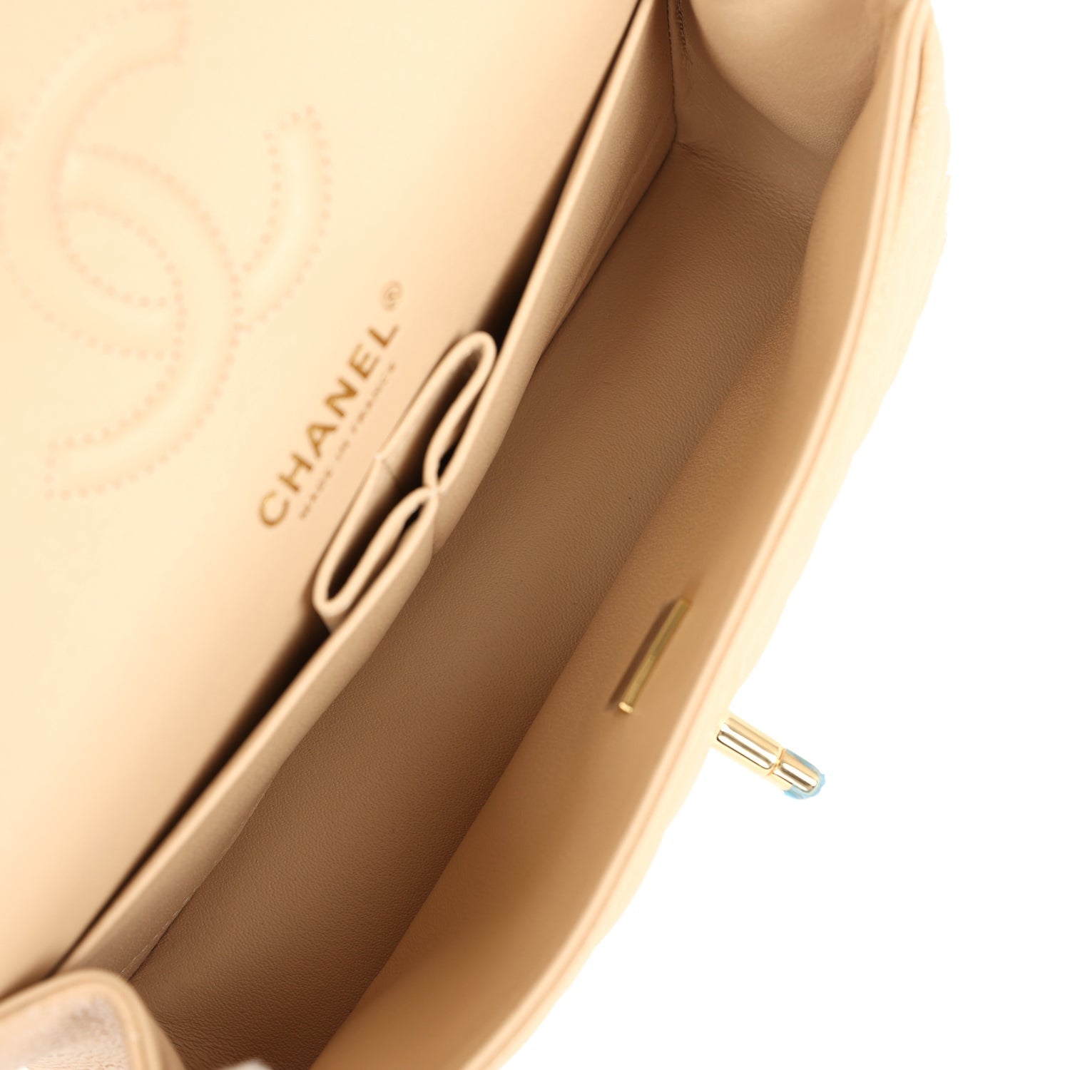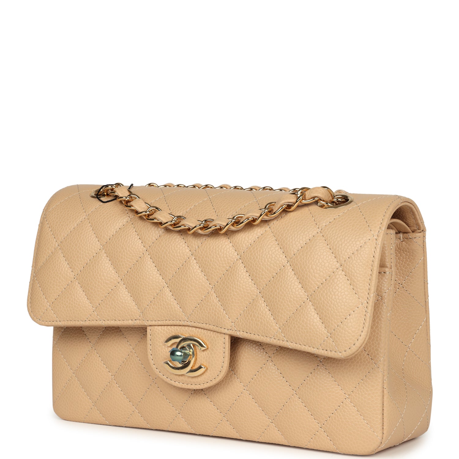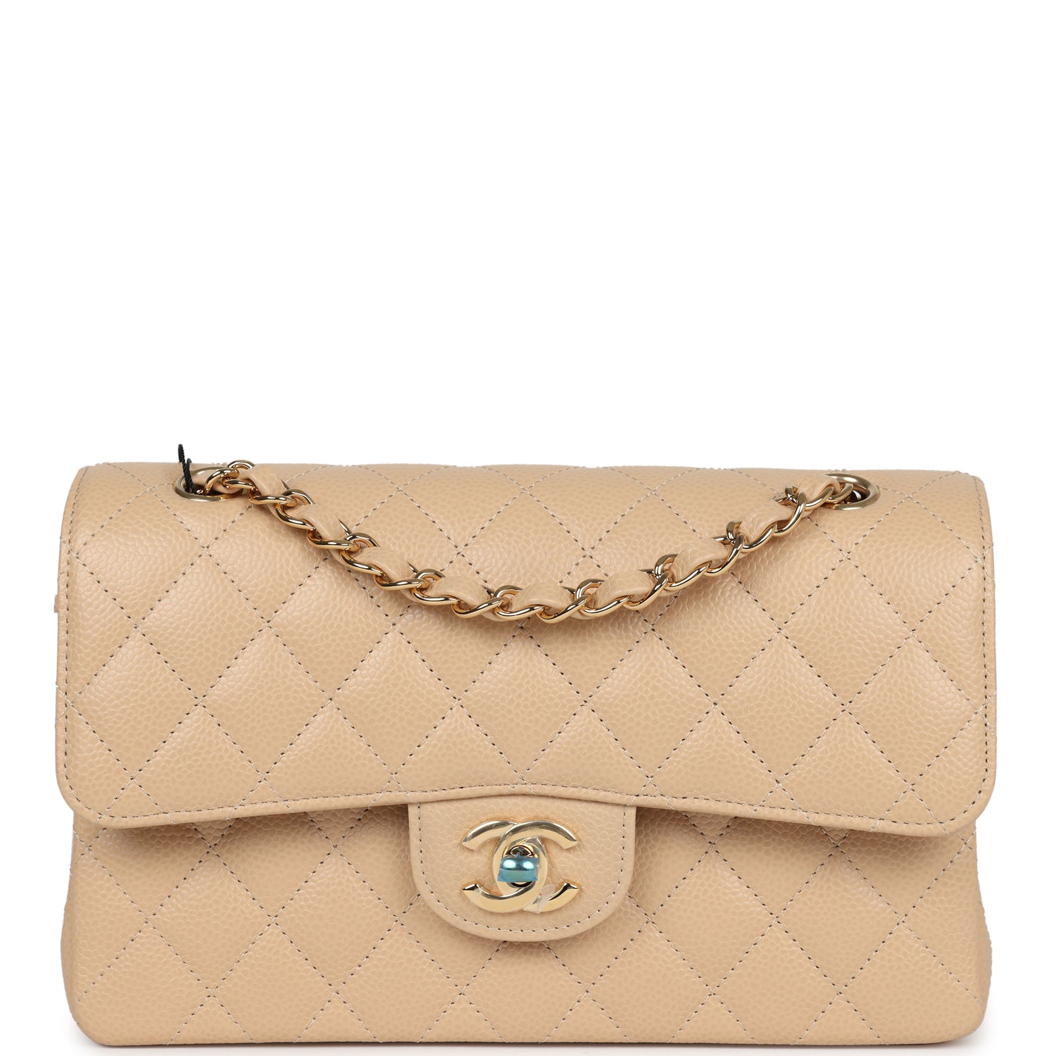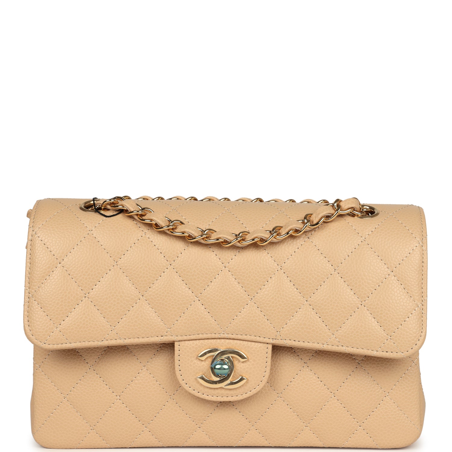 Regular price $1,960.00 Sale price $430.00 Save $1,530.00This Small Classic Double Flap bag is in beige clair lambskin leather with silver tone hardware and features a front flap with signature CC turnlock closure, half moon back pocket, and adjustable interwoven silver tone chain link and beige leather shoulder strap.