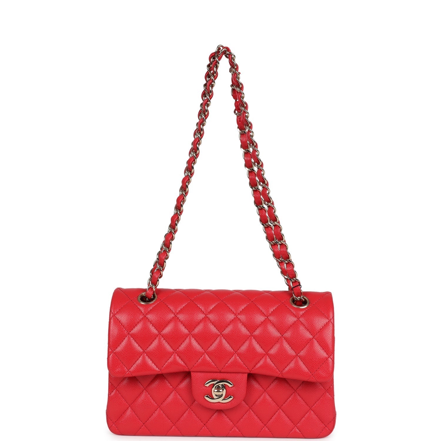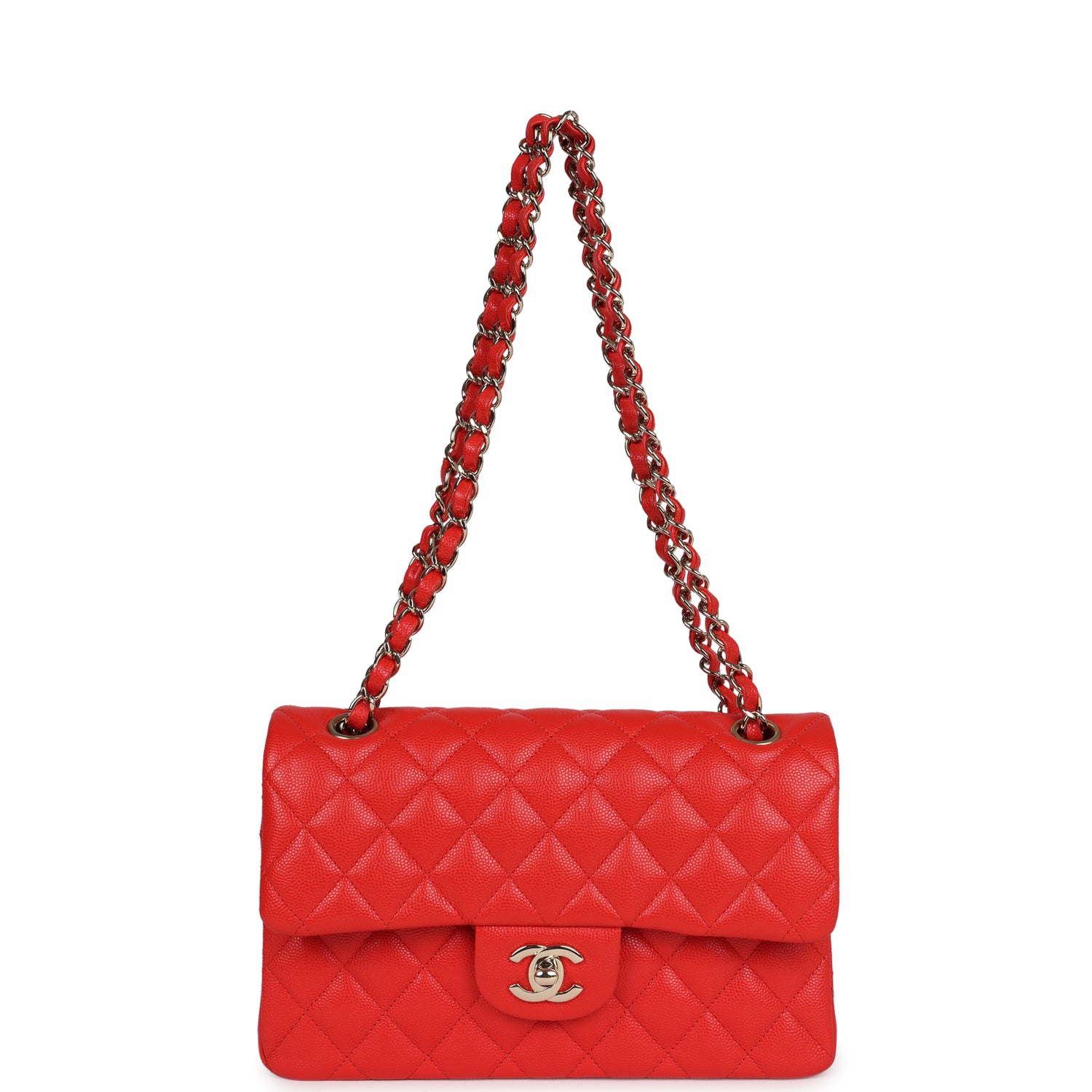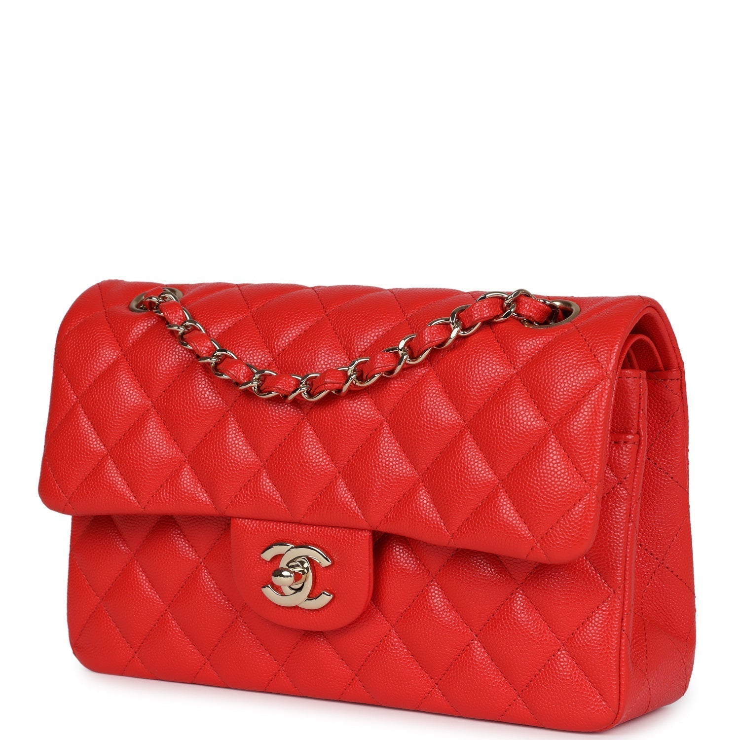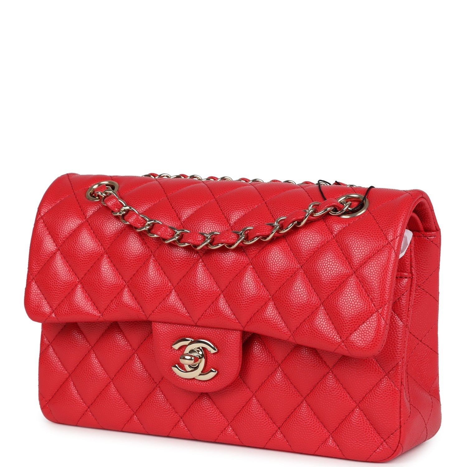 Regular price $1,800.00 Sale price $450.00 Save $1,350.00This small Classic Double Flap bag is in red shiny caviar leather with light gold tone hardware and features a front flap with signature CC turnlock closure, half moon back pocket, and adjustable interwoven light gold tone chain link and red leather shoulder/crossbody strap.