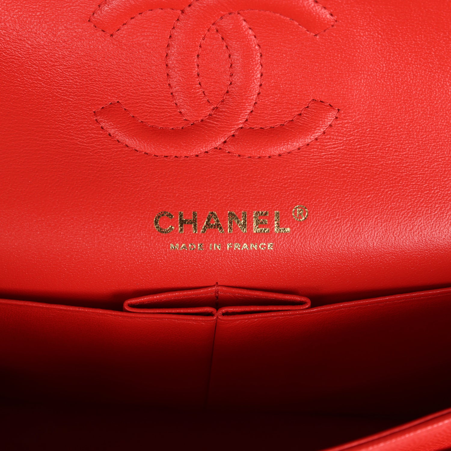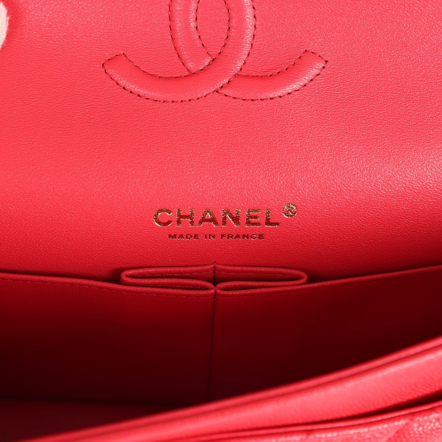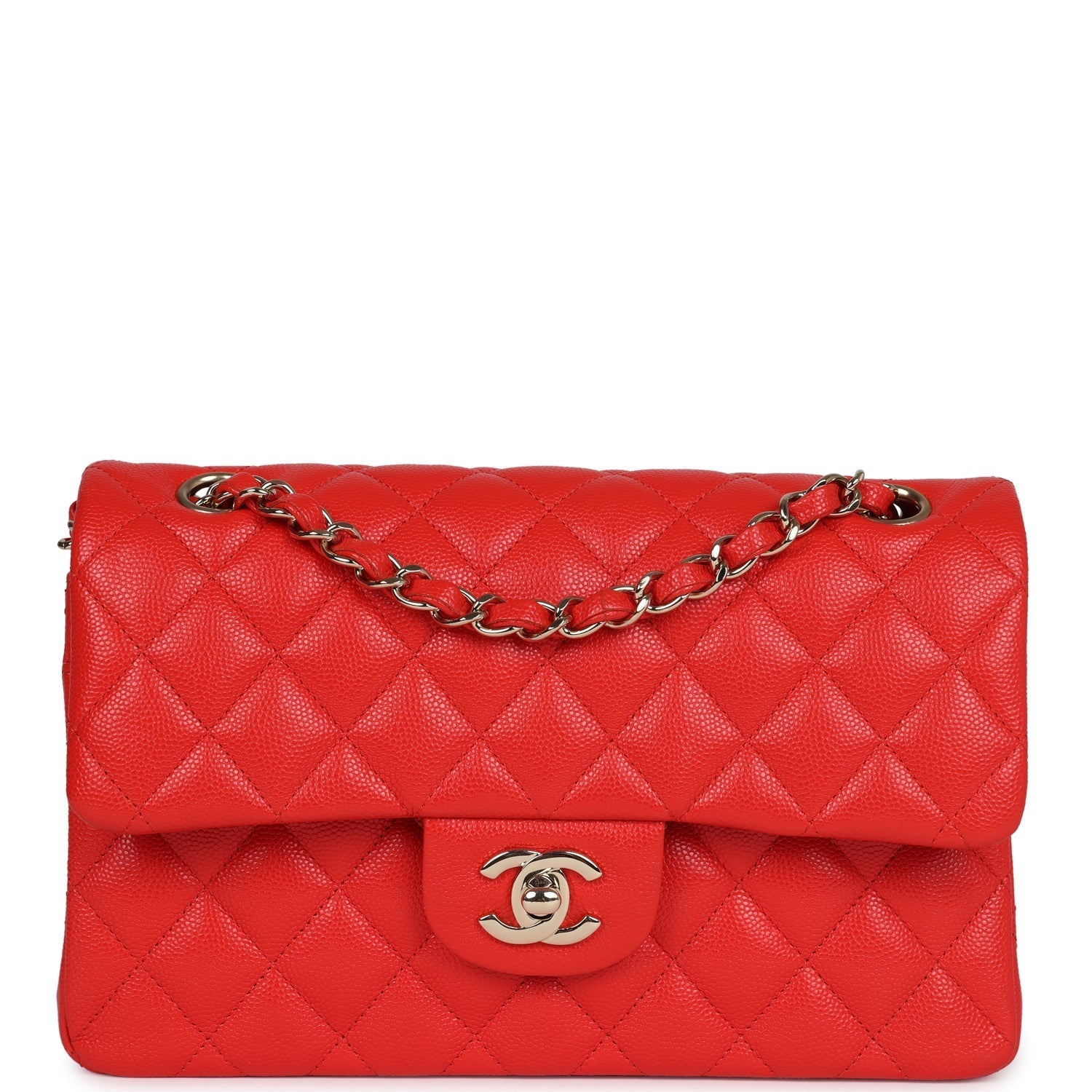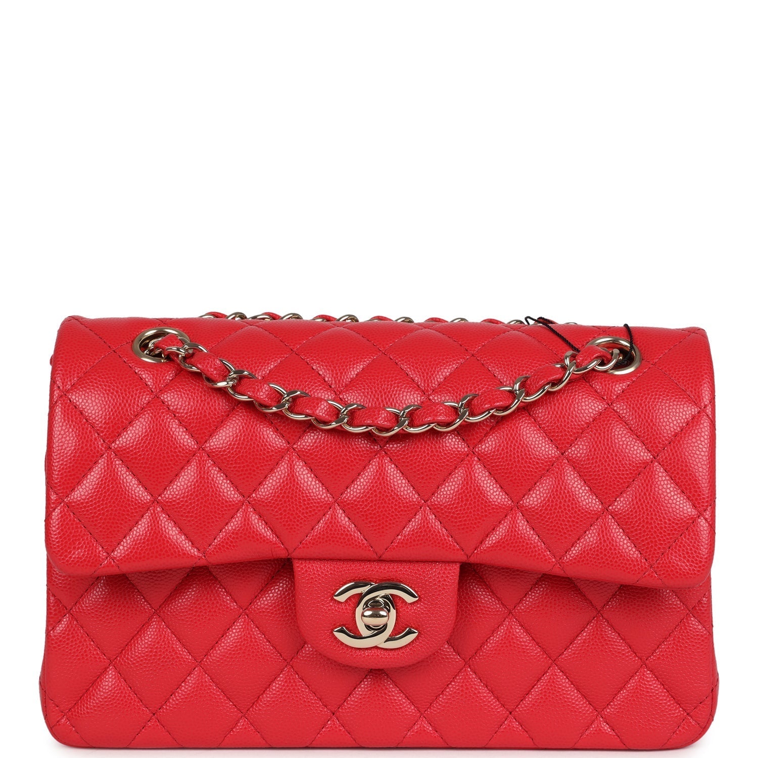 Regular price $1,800.00 Sale price $450.00 Save $1,350.00This small Classic Double Flap bag is in red shiny caviar leather with light gold tone hardware and features a front flap with signature CC turnlock closure, half moon back pocket, and adjustable interwoven light gold tone chain link and red leather shoulder/crossbody strap.