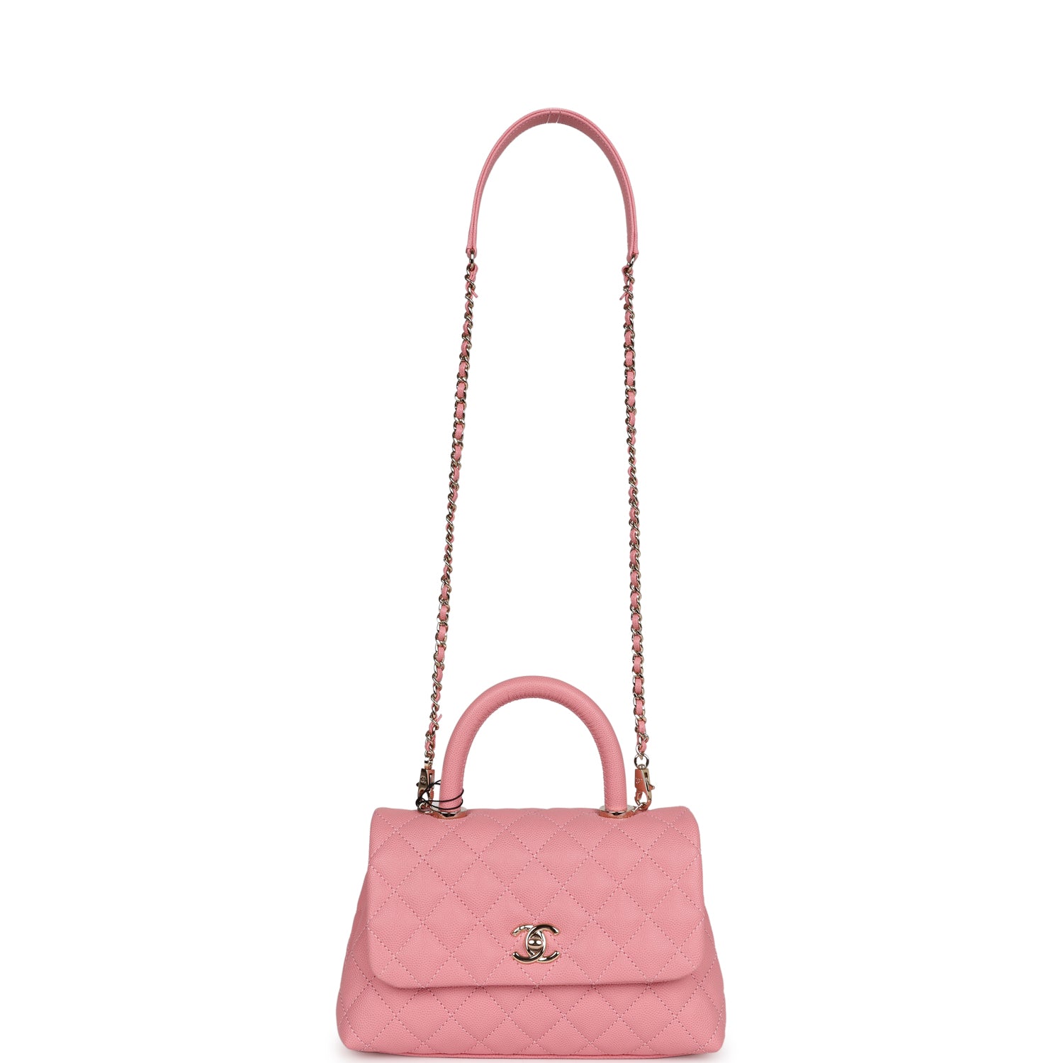 Regular price $1,630.00 Sale price $440.00 Save $1,190.00This Small Coco Handle Flap bag is of Light Pink caviar with light gold tone hardware and has the signature diamond quilting in a trapezoidal shape with signature CC interlocking closure, top handle, and long light gold tone and pink leather chain.