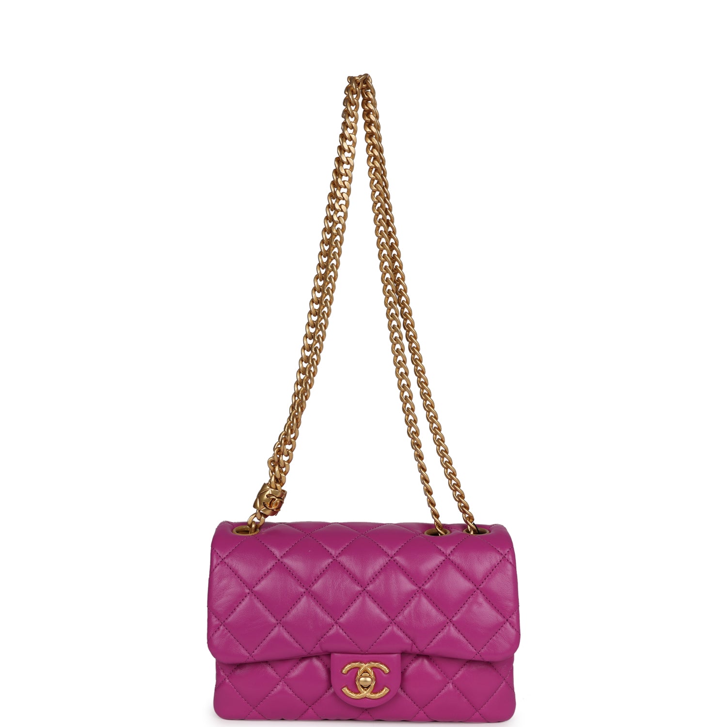 Regular price $2,320.00 Sale price $450.00 Save $1,870.00This Chanel Small Crush Flap Bag is in Purple Quilted Shiny Aged Calfskin with Brushed Gold Hardware, features a trio-accordion style shape, tonal stitching, and CC turnlock closure, and a brushed gold tone chainlink crush adjustable shoulder/crossbody strap.