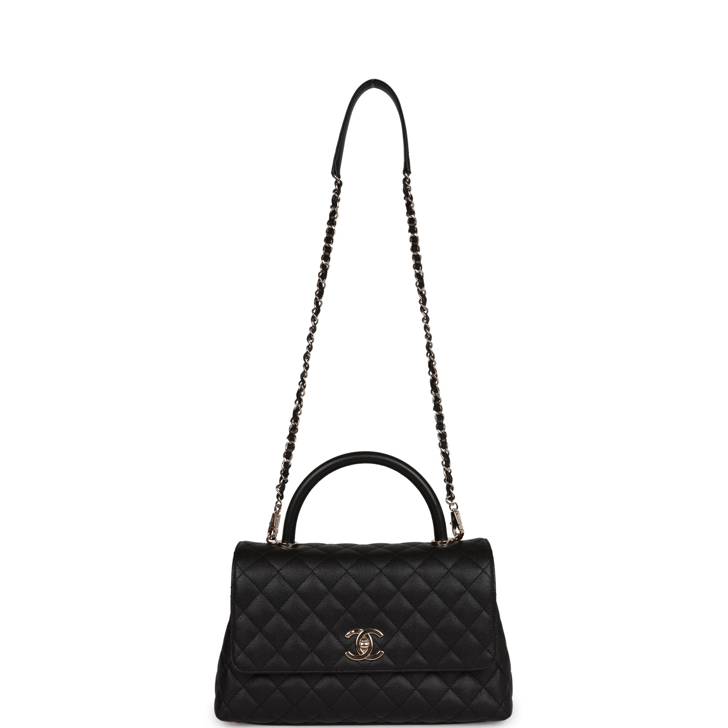 Regular price $1,970.00 Sale price $440.00 Save $1,530.00This Small Coco Top Handle Flap bag is of light blue caviar leather with light gold tone hardware and has the signature diamond quilting in a trapezoidal shape with signature CC interlocking closure, a leather top handle, and a single removable interwoven light gold tone and blue leather chainlink shoulder strap.