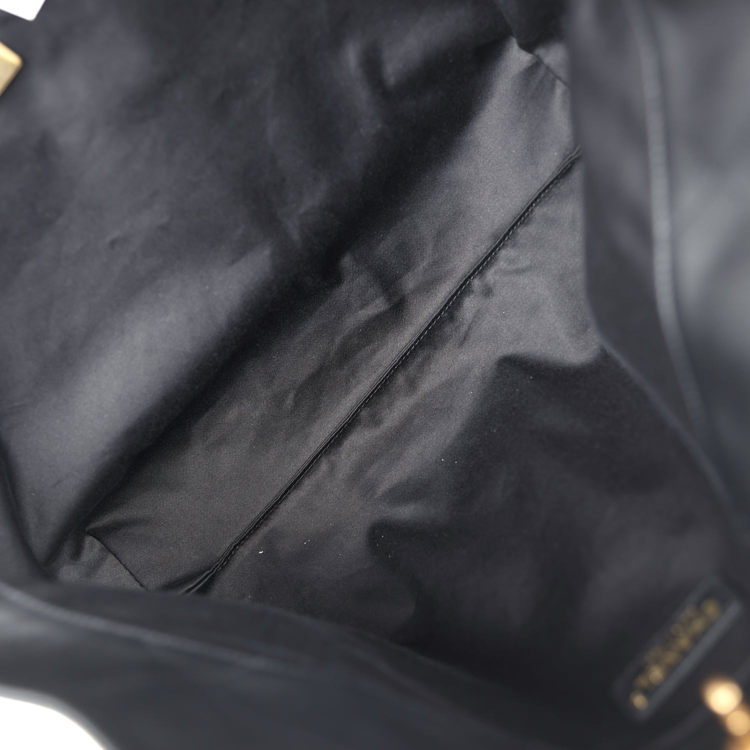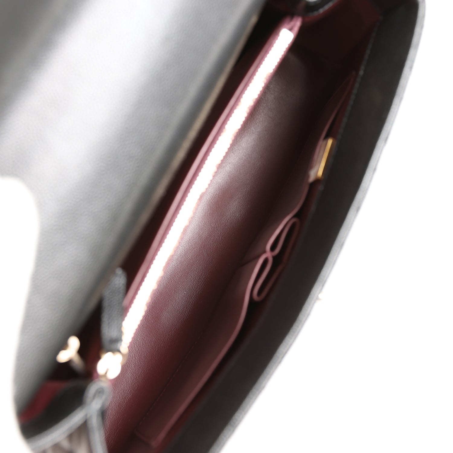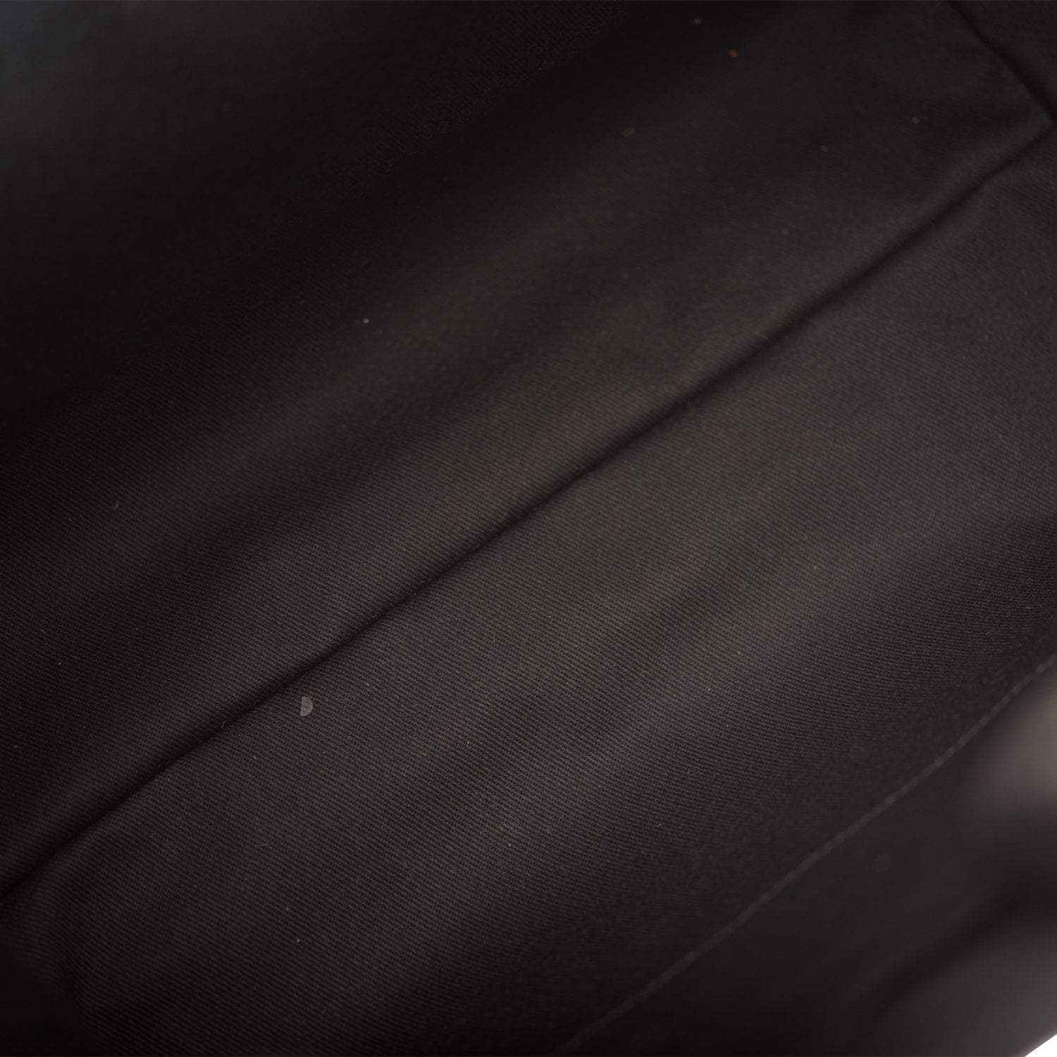 The interior is lined in black lambskin and gross grain fabric with a zippered pocket on the rear wall with leather zipper pull, one small slip pocket in front, one middle slip pocket, and one zippered pocket on back wall with leather zipper pull.