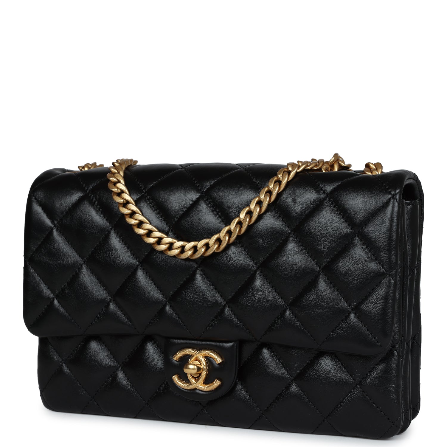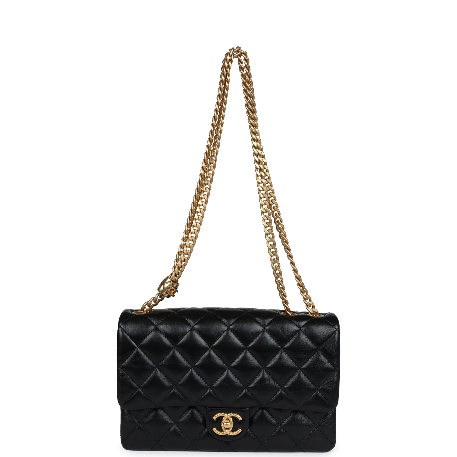 Regular price $1,840.00 Sale price $440.00 Save $1,400.00This Chanel Small Crush Flap Bag is in Black Quilted Shiny Aged Calfskin with Brushed Gold Hardware, features a trio-accordion style shape, tonal stitching, and CC turnlock closure, and a brushed gold tone chainlink crush adjustable shoulder/crossbody strap.