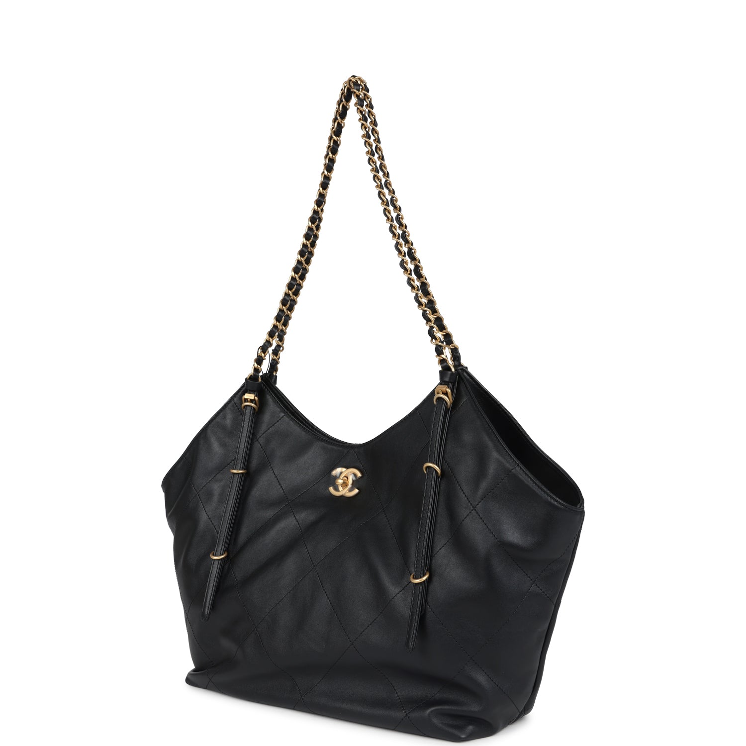 Regular price $2,290.00 Sale price $430.00 Save $1,860.00This Chanel Small Coco Shopping Tote bag is in black calfskin leather with antique gold hardware featuring large flat diamond quilt leather, a front cc turnlock closure, a removable pouch, and interwoven antique gold tone chain link and black leather shoulder straps.