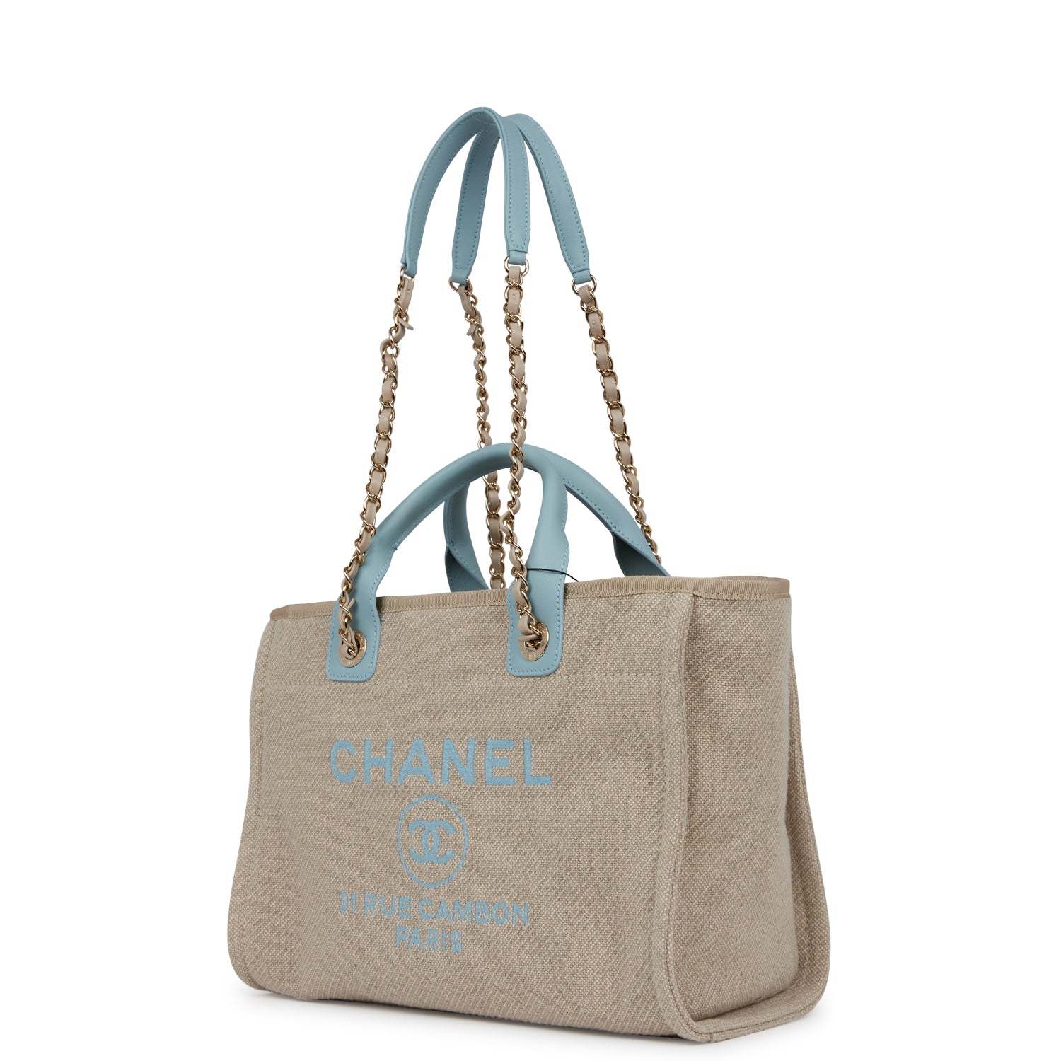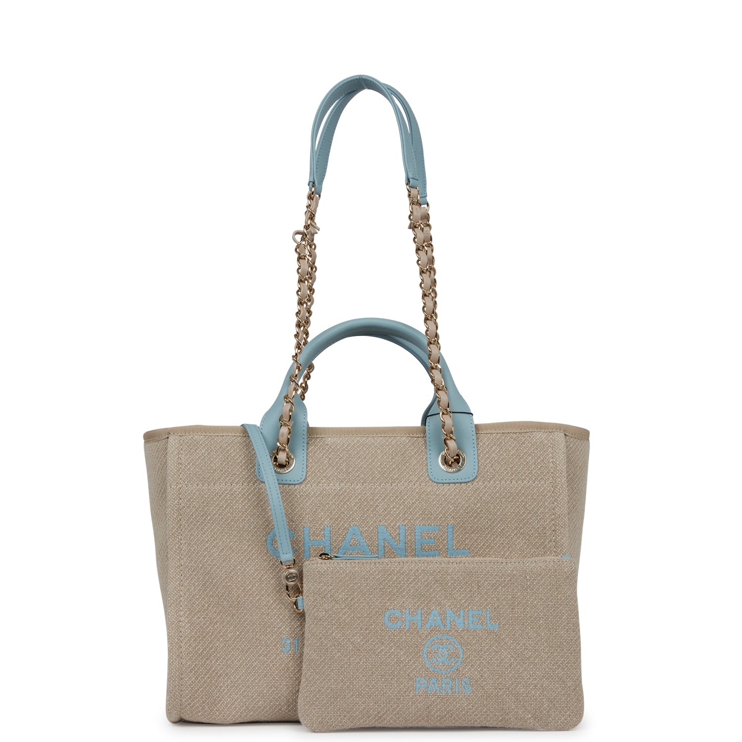 Regular price $2,370.00 Sale price $440.00 Save $1,930.00This small Deauville bag is made of beige boucle fabric with light gold tone hardware; featuring a large CC signature and Chanel logo on the front, removable pouch and interwoven light gold tone chain link and blue leather shoulder straps.