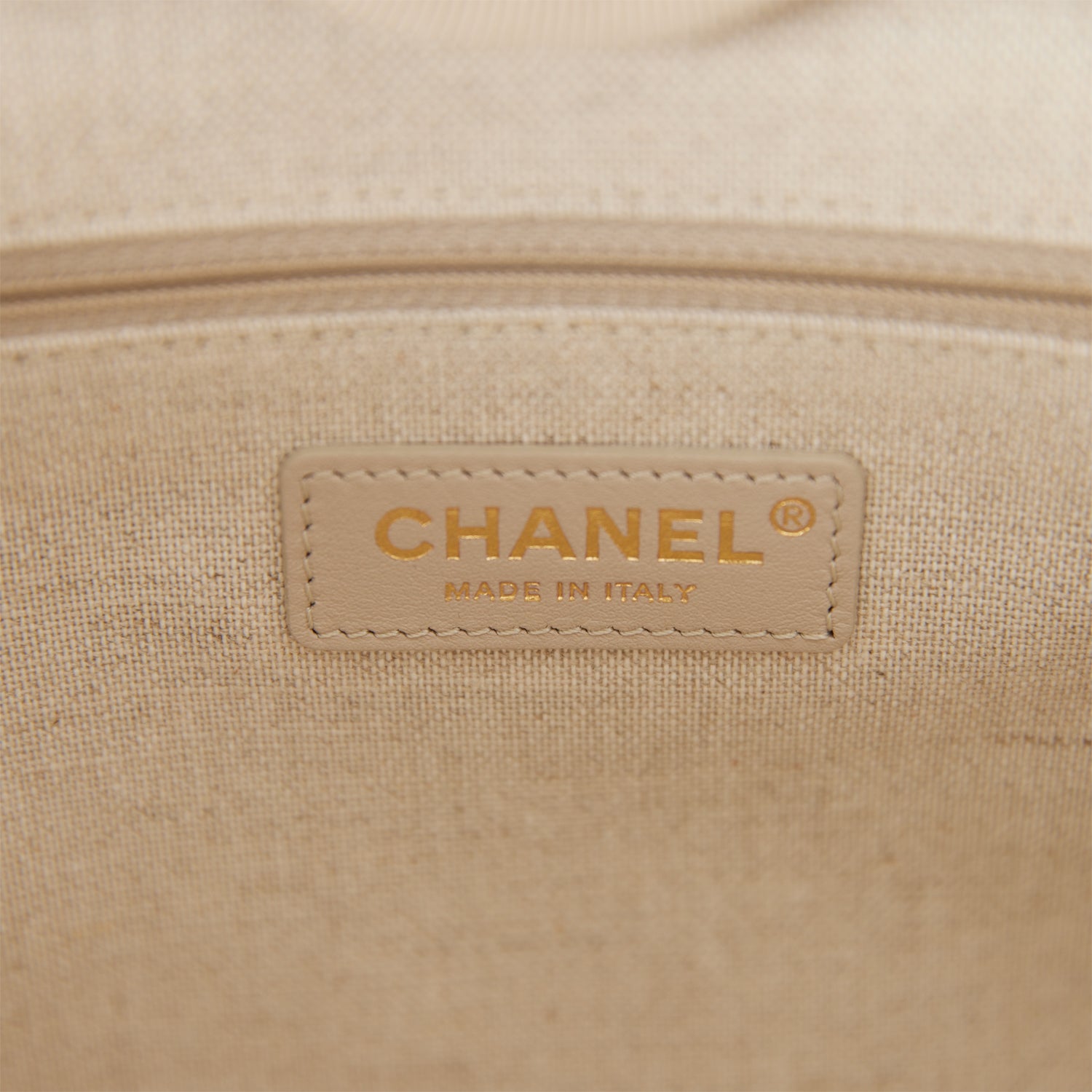 Regular price $2,260.00 Sale price $440.00 Save $1,820.00This small Deauville Shopping Tote is of dark beige canvas with light gold tone hardware, featuring a large CC signature and Chanel logo on the front, removable pouch and interwoven light gold tone chainlink and beige leather shoulder straps and two leather top handles.
