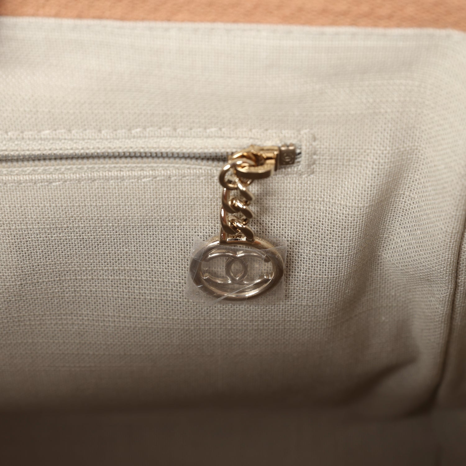 The interior is lined in beige linen fabric and has two open pockets on the front wall and a zipper pocket with a Chanel pull on the rear wall.