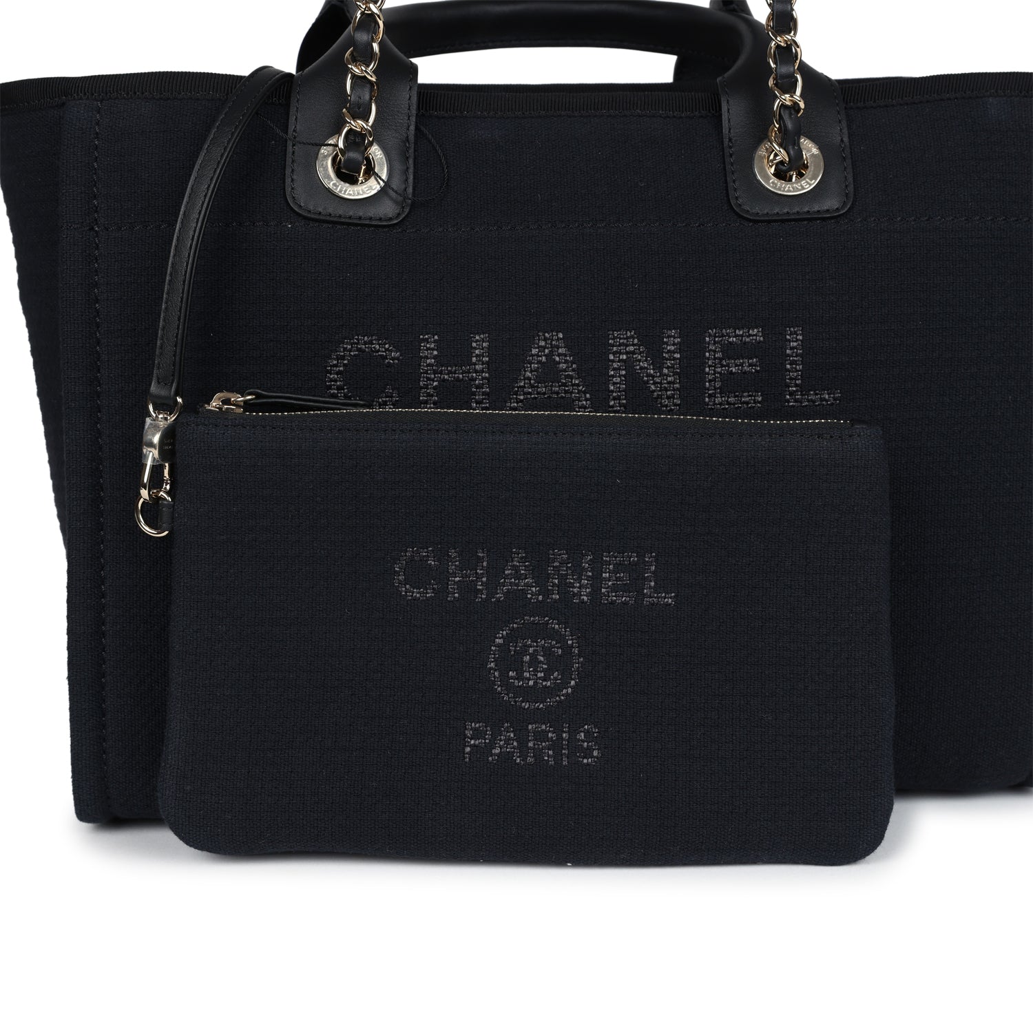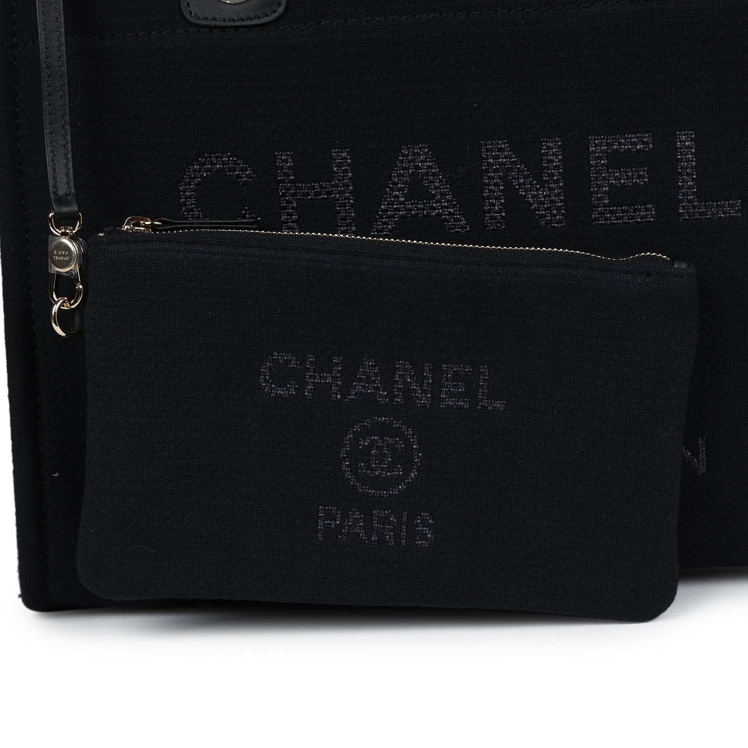 Regular price $2,170.00 Sale price $430.00 Save $1,740.00This small Deauville Shopping Tote is in black canvas with light gold tone hardware, featuring a large CC signature and Chanel logo on the front, removable pouch and interwoven light gold tone chainlink and black leather shoulder straps and two leather top handles.