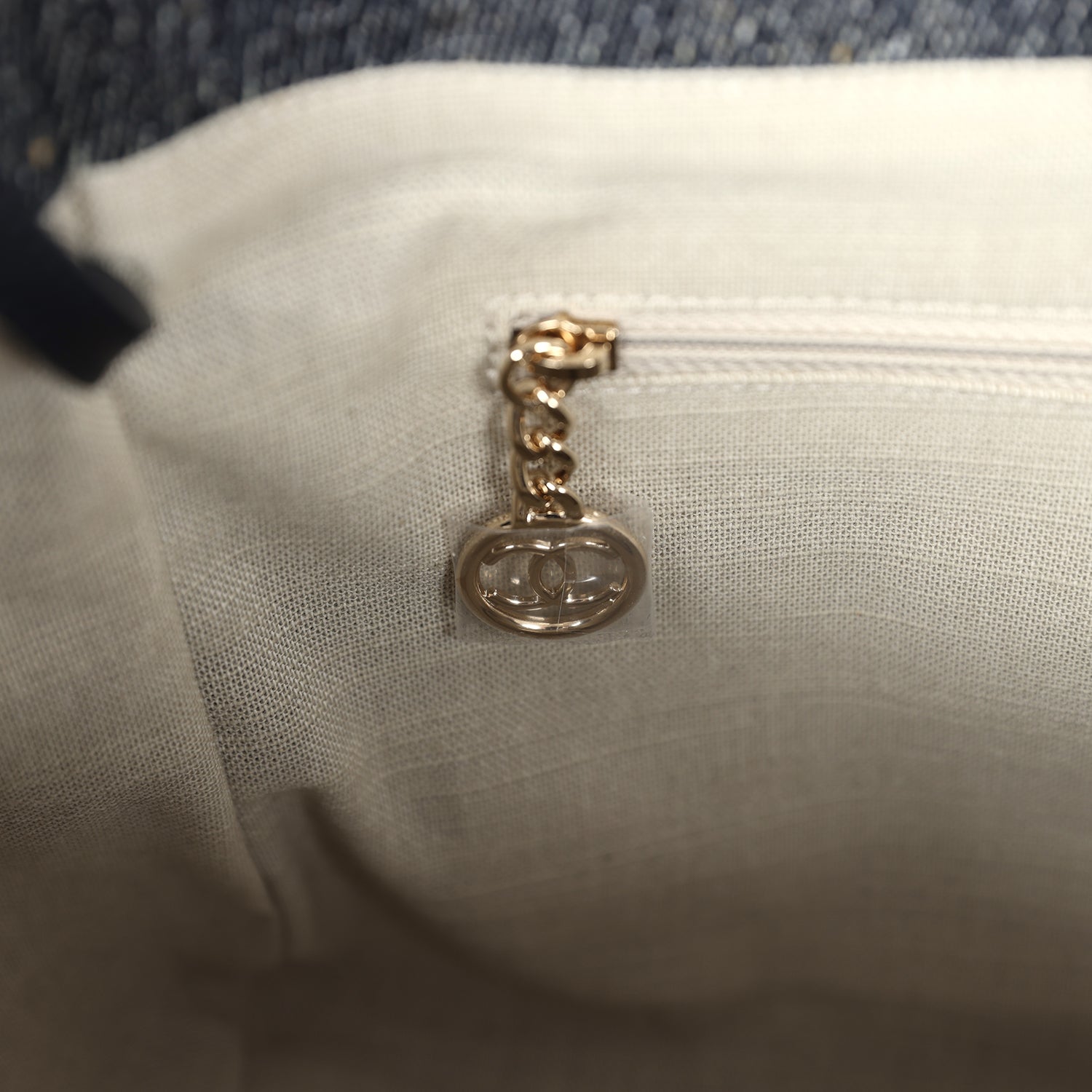 Regular price $2,320.00 Sale price $440.00 Save $1,880.00This small Chanel Deauville shopping bag is in dark blue and white denim with light gold hardware, featuring a large CC signature and Chanel logo on the front, removable pouch, two rolled top handles, and two interwoven light gold chain link and dark blue leather shoulder straps.