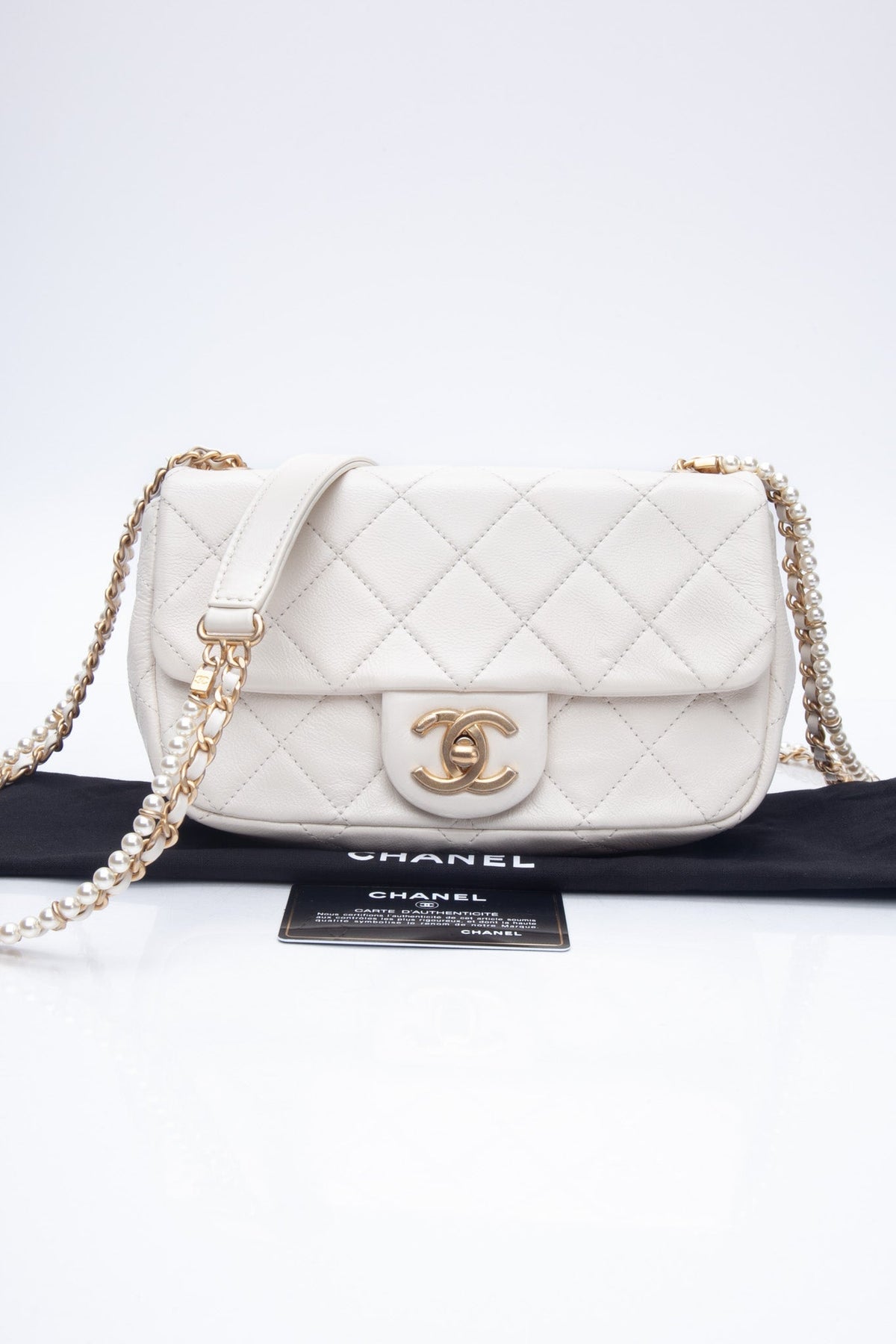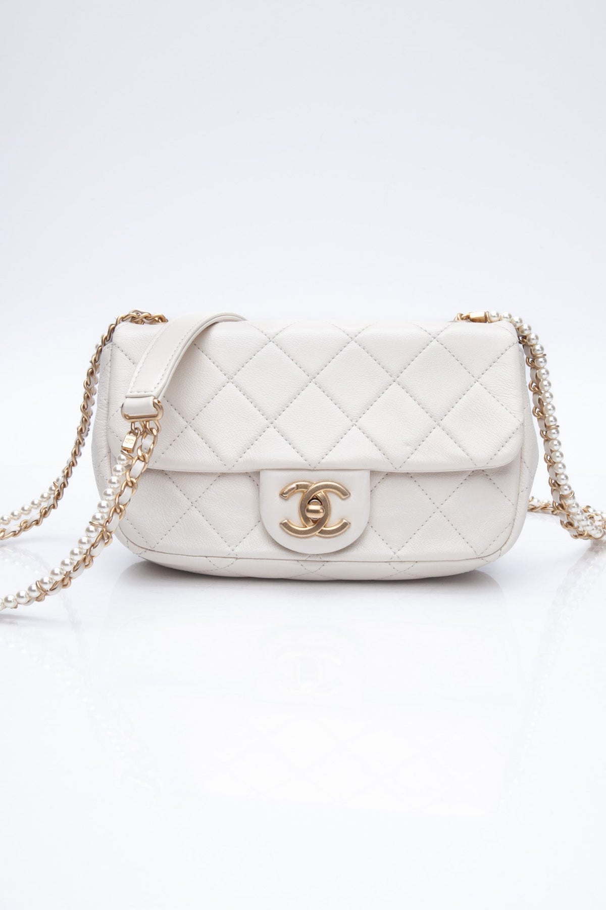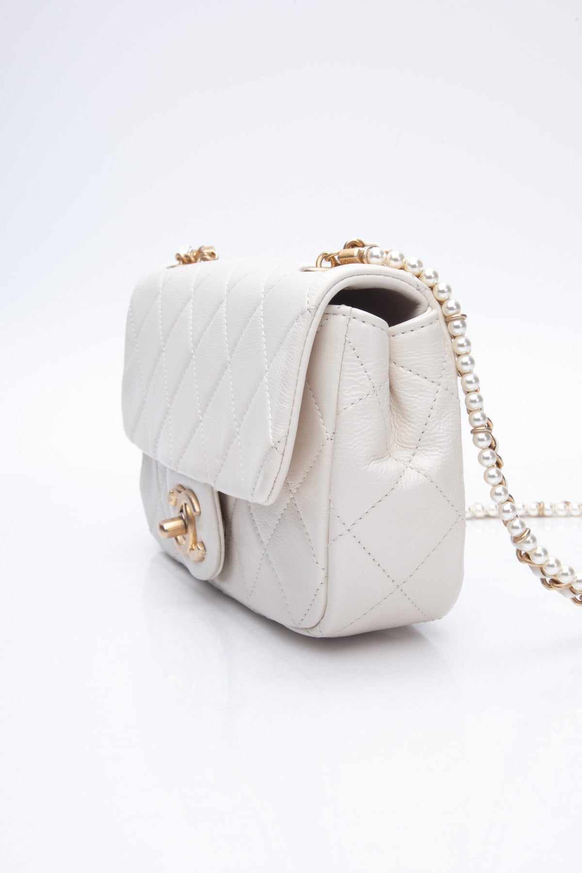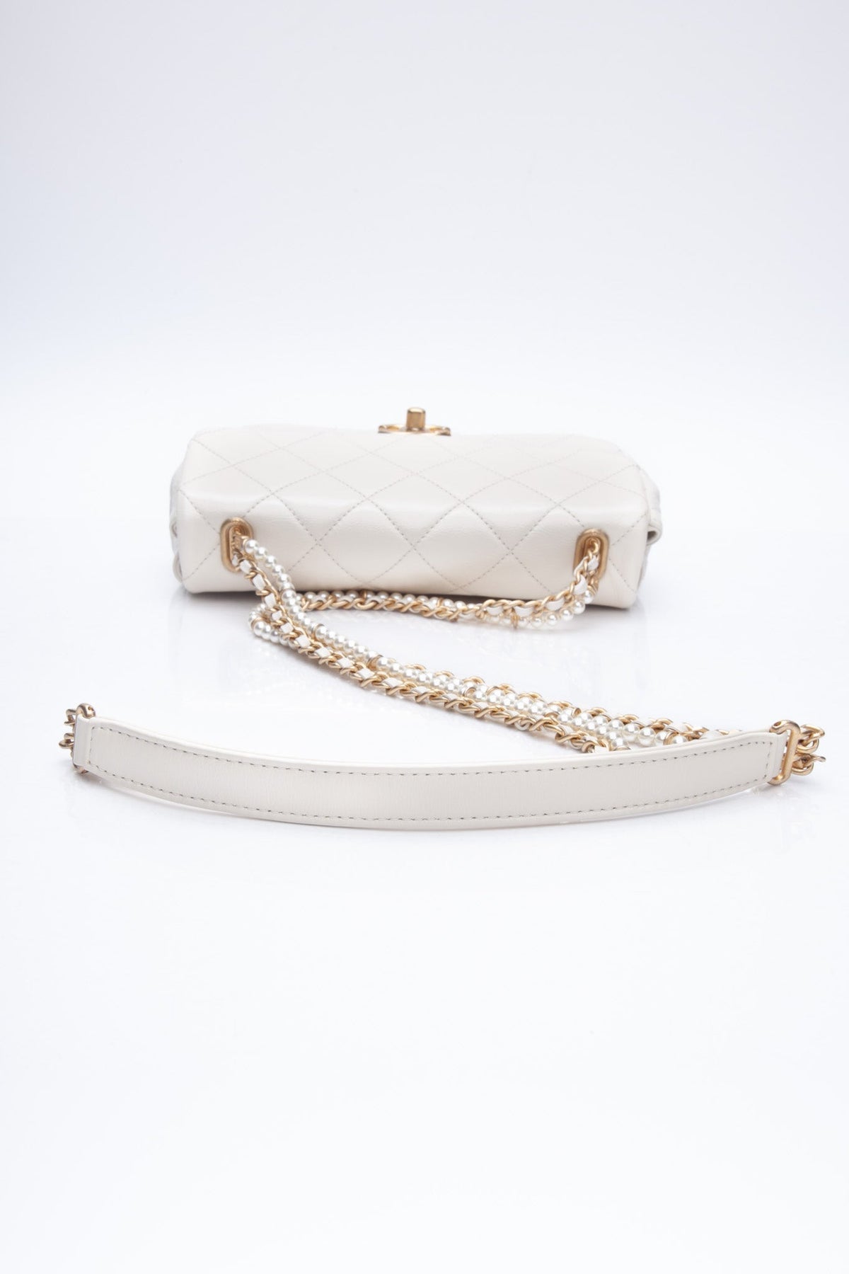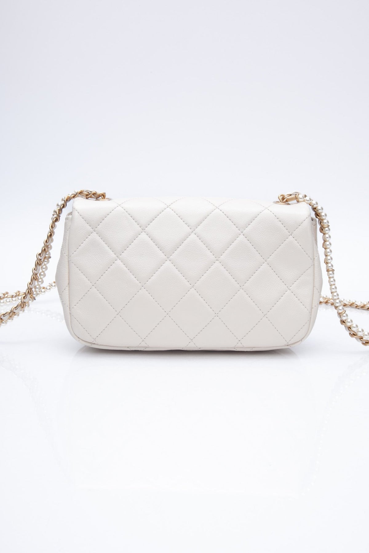 CHANEL Small Cream Crystal Pearls Chain Quilted Calfskin Flap Bag