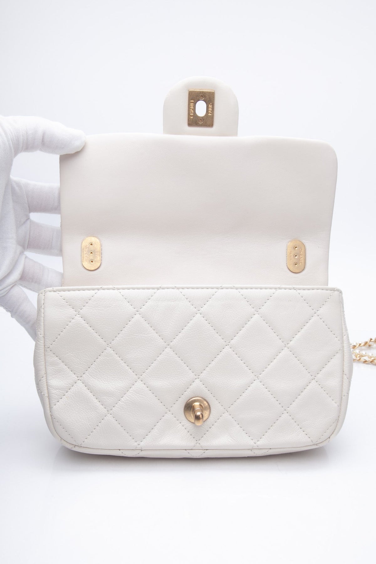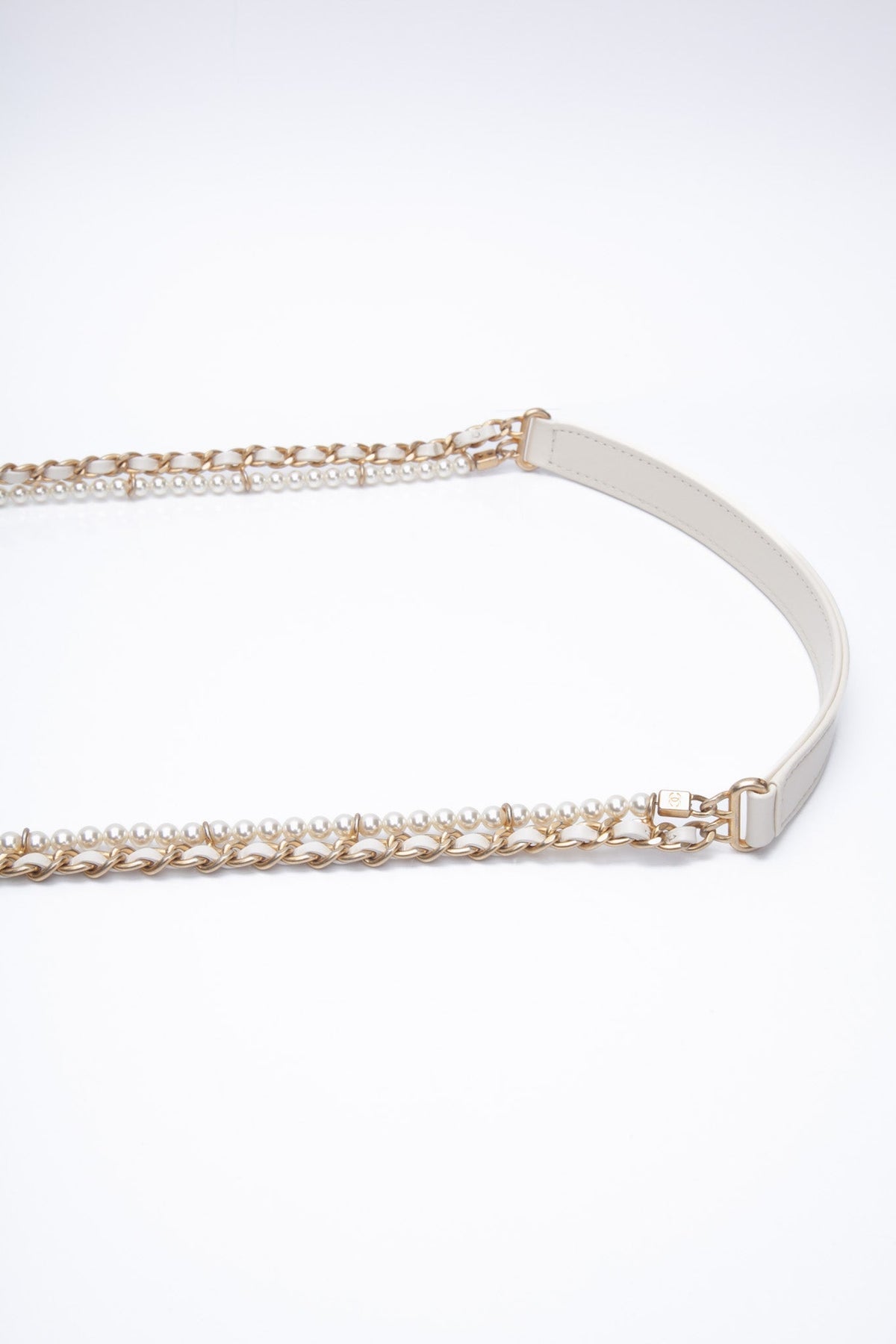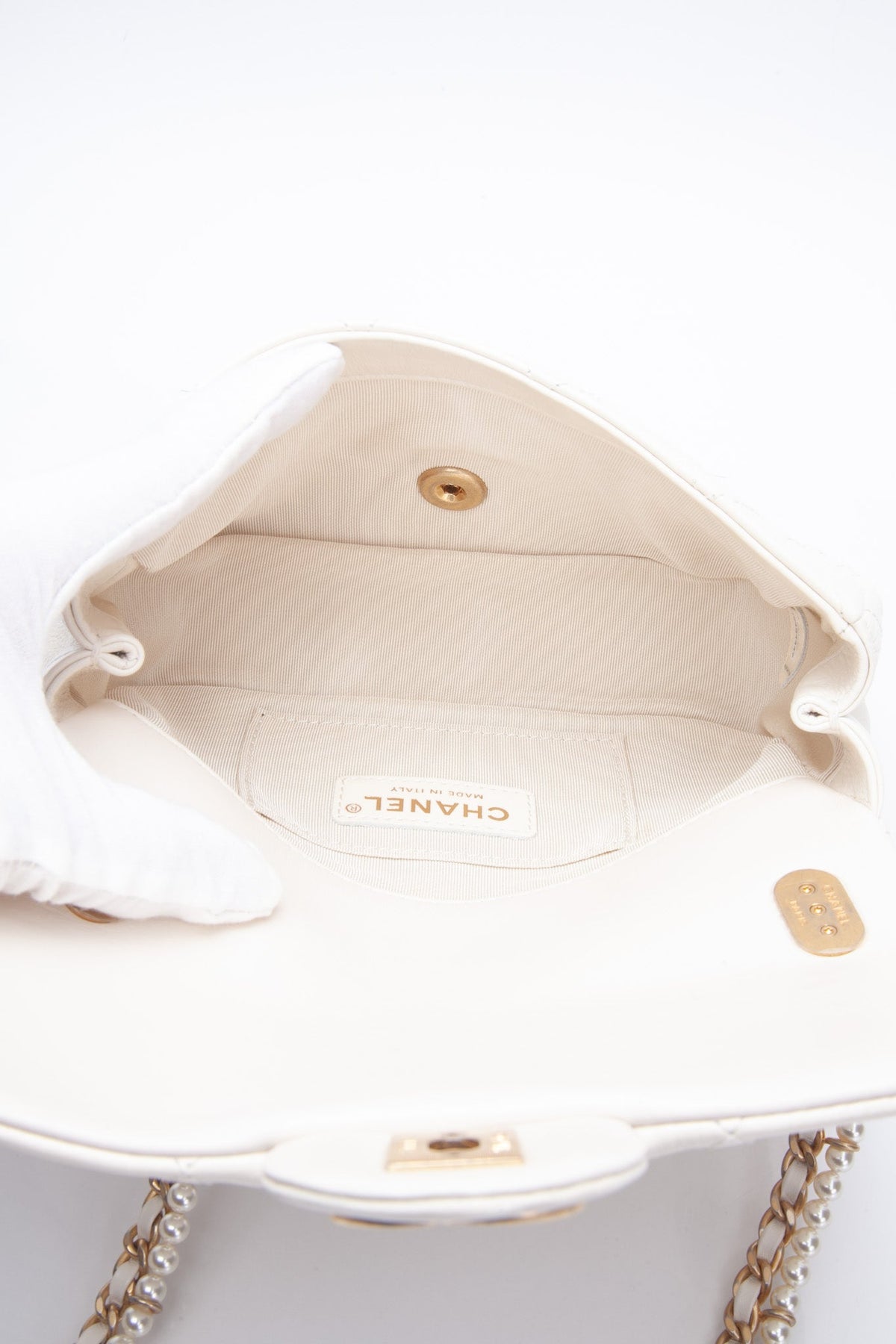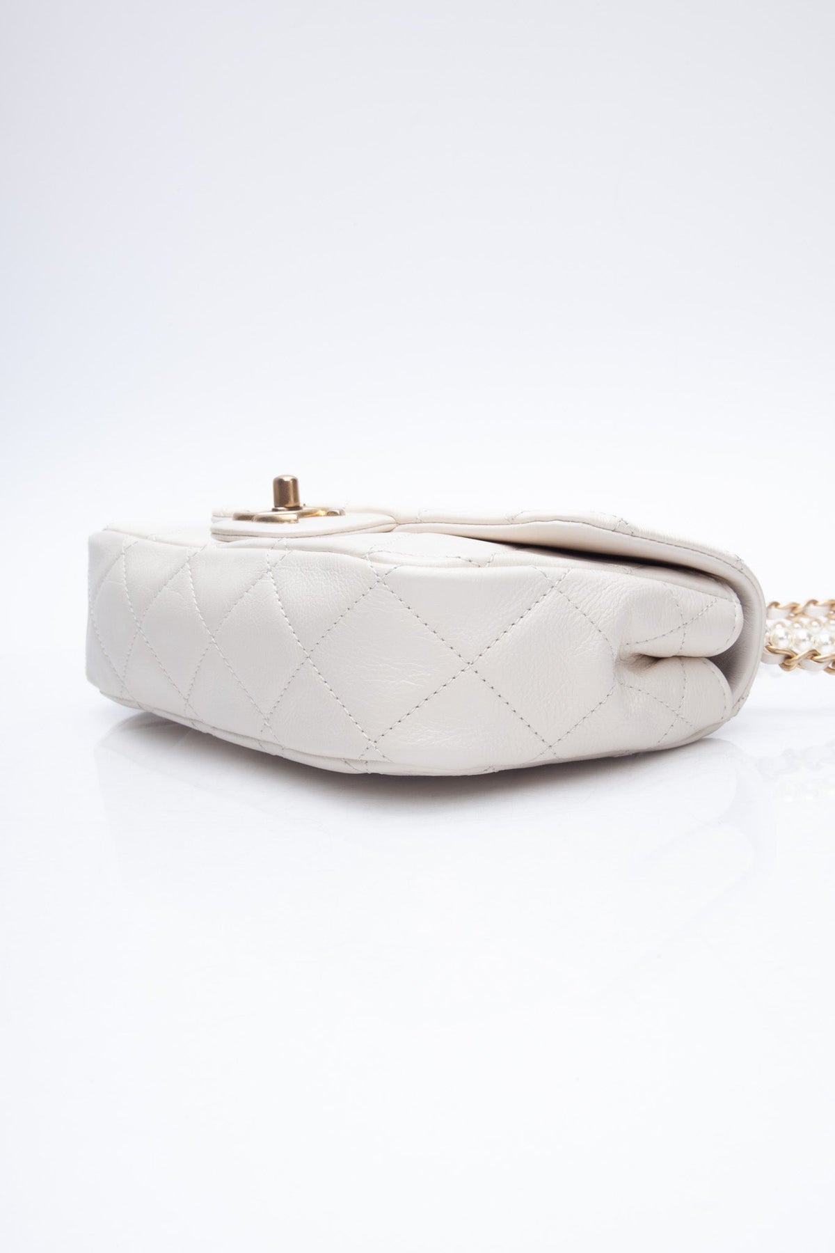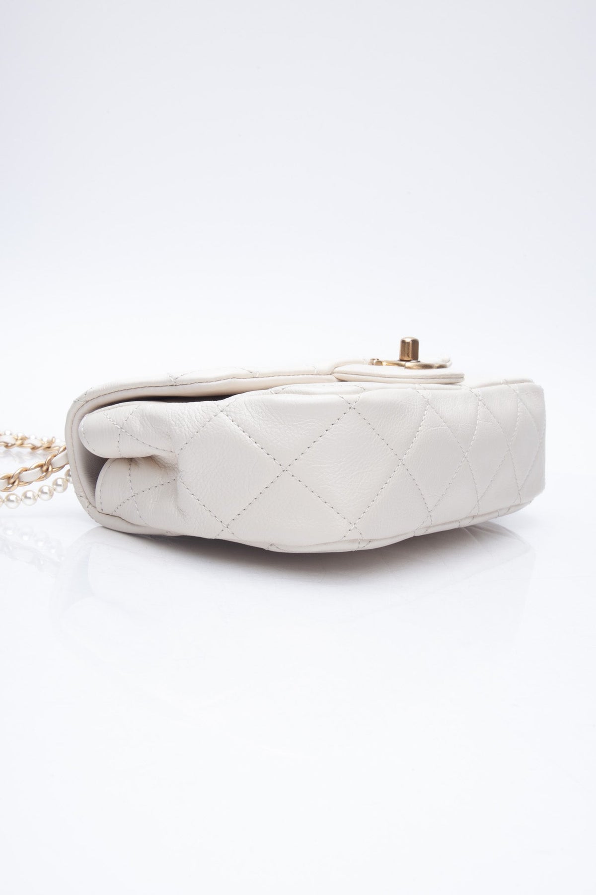 CHANEL Small Cream Crystal Pearls Chain Quilted Calfskin Flap Bag
