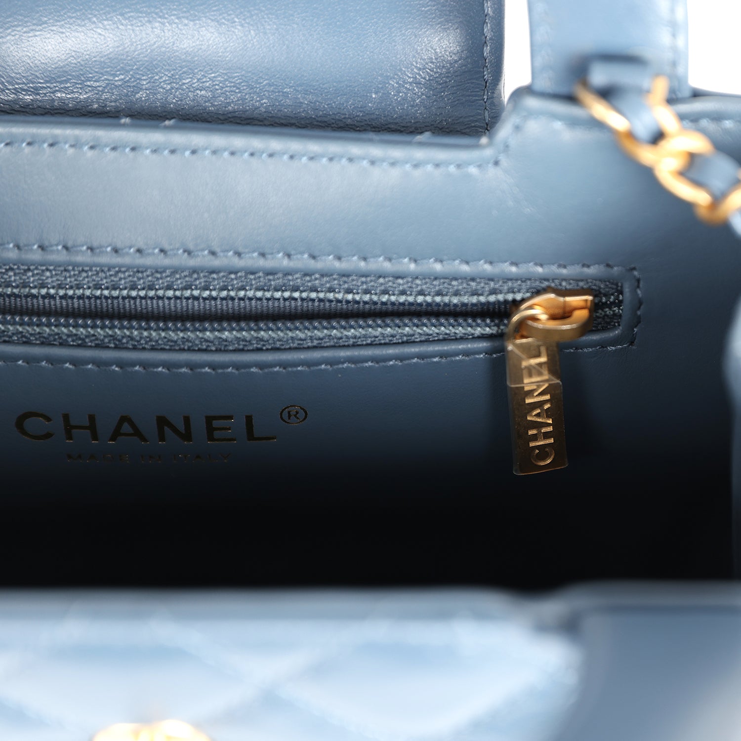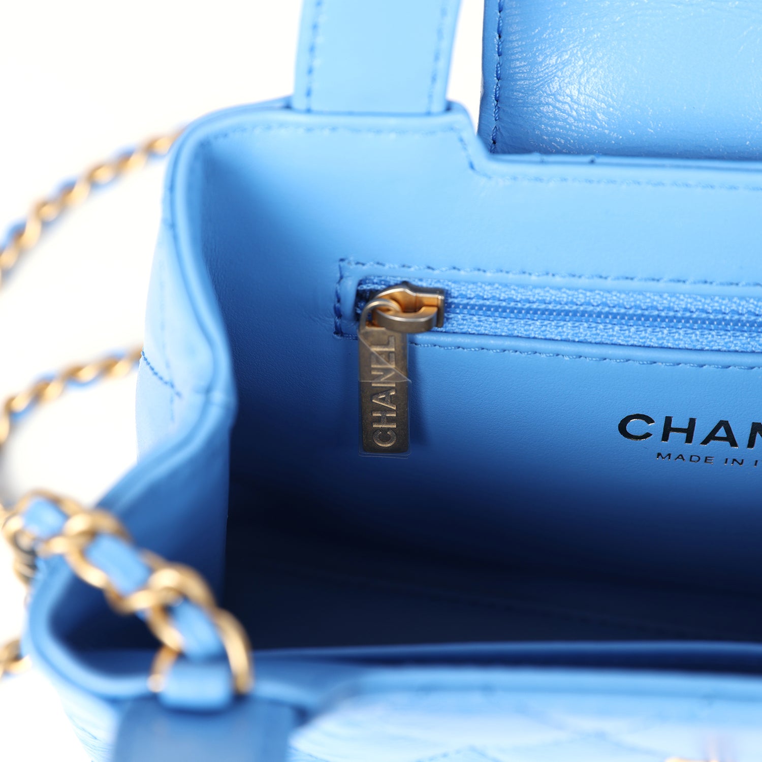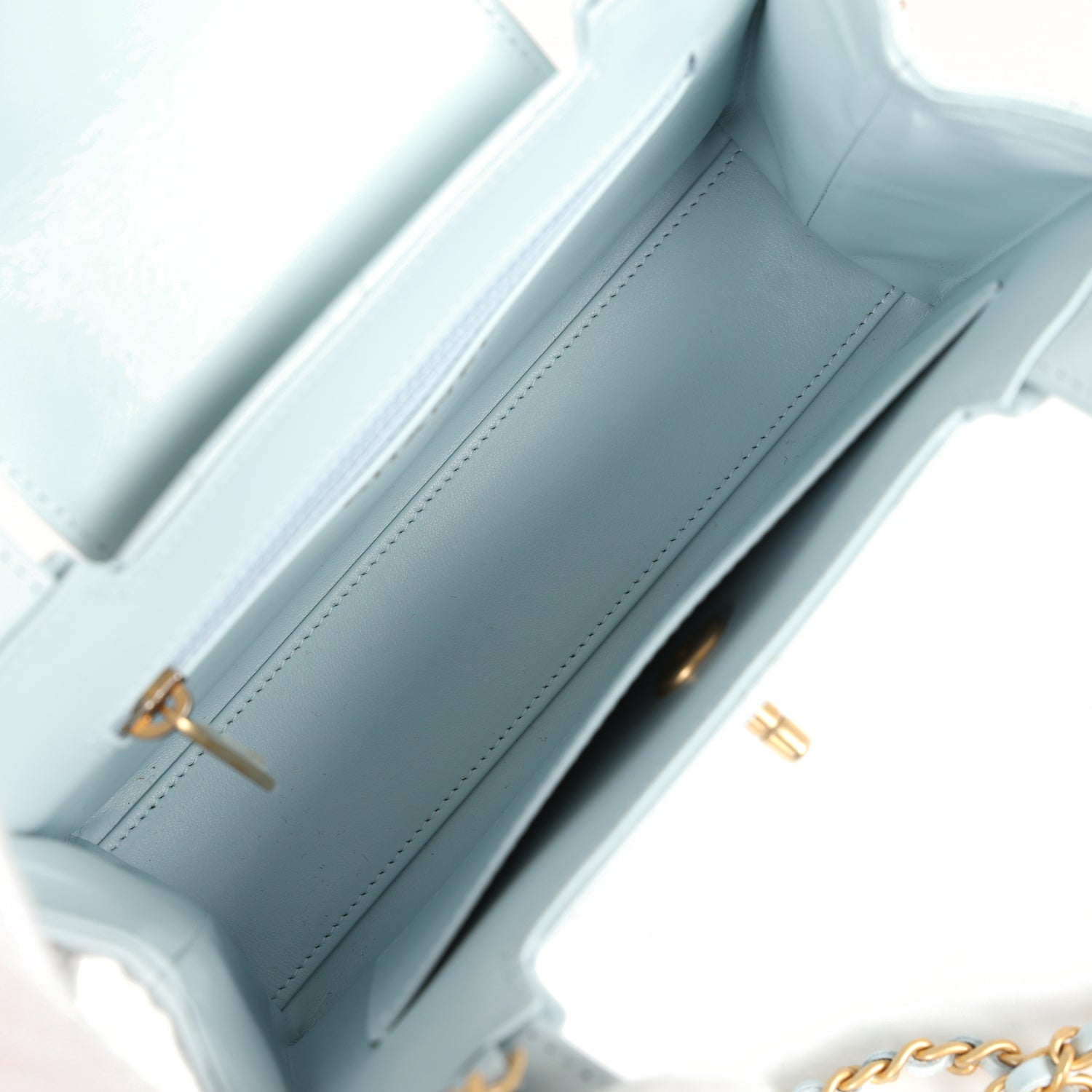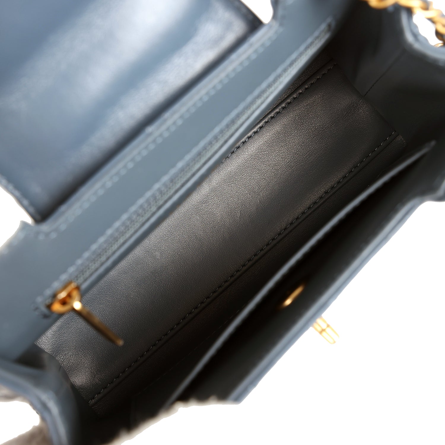 The interior is lined in light blue leather with one zip pocket on the rear wall and one center divide slip pocket.