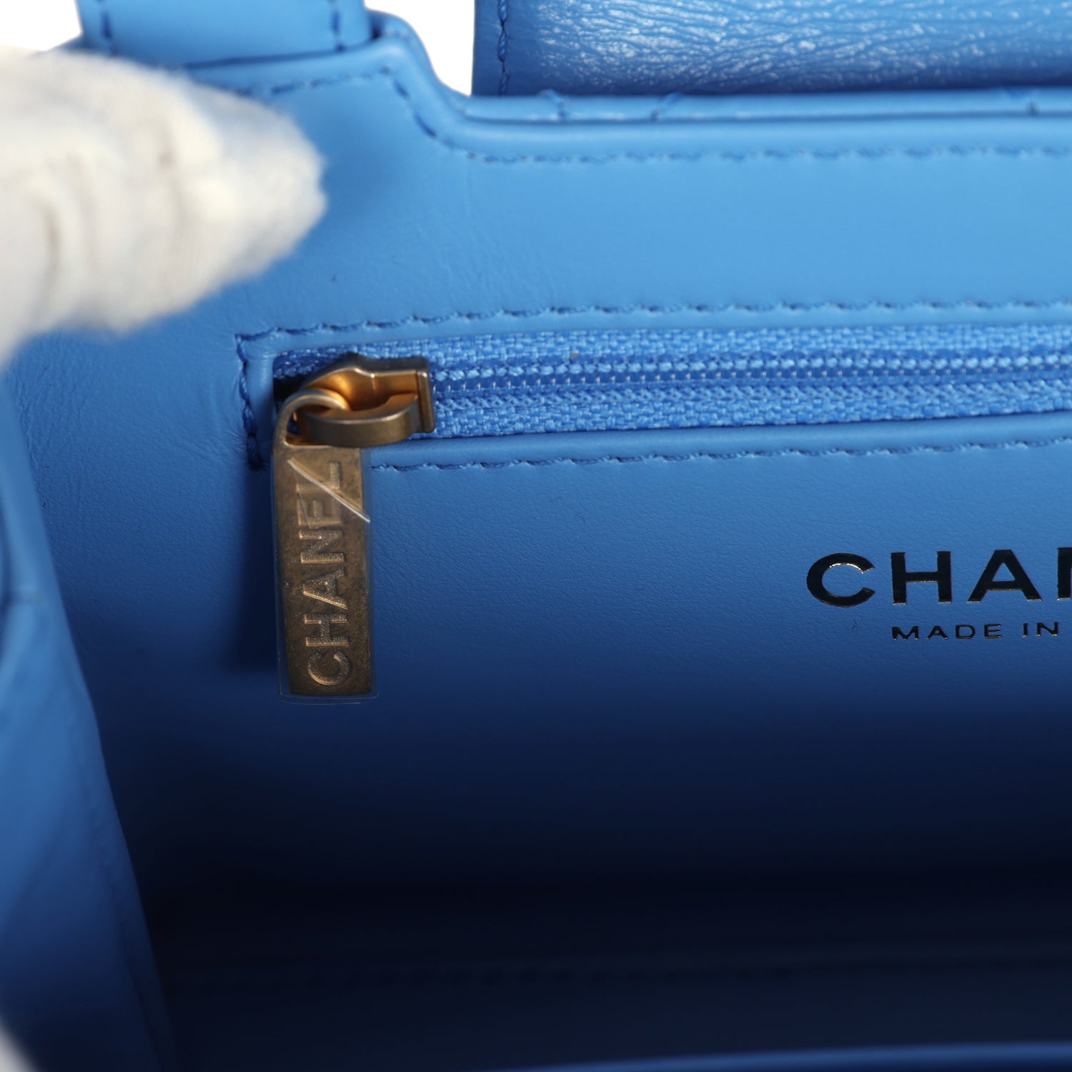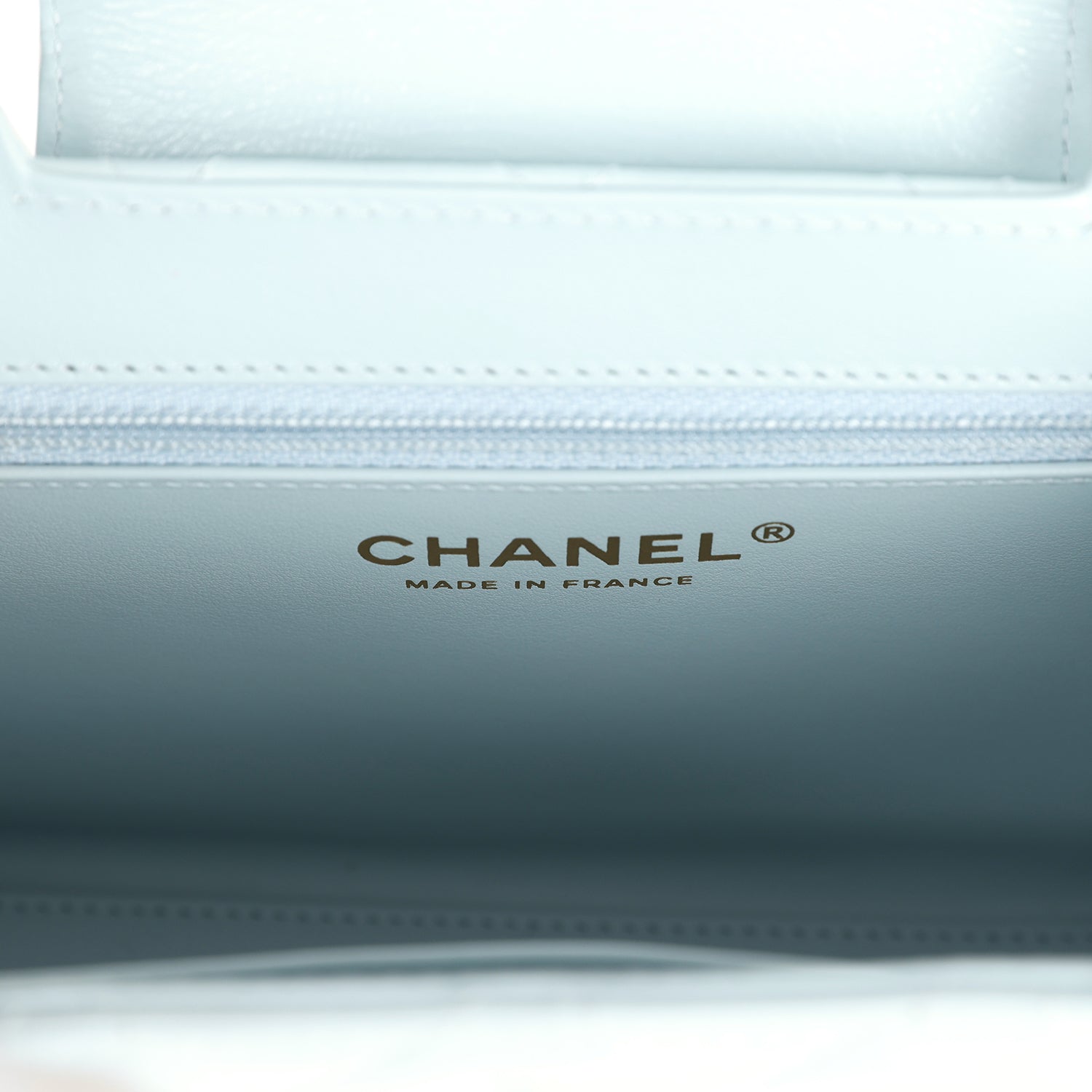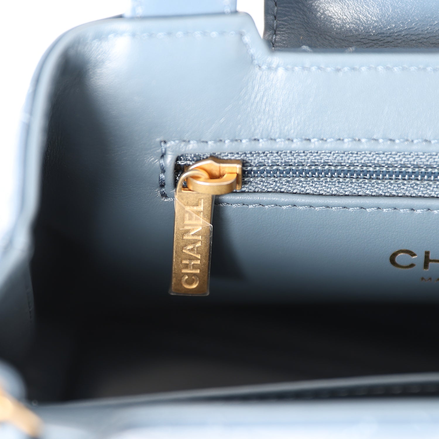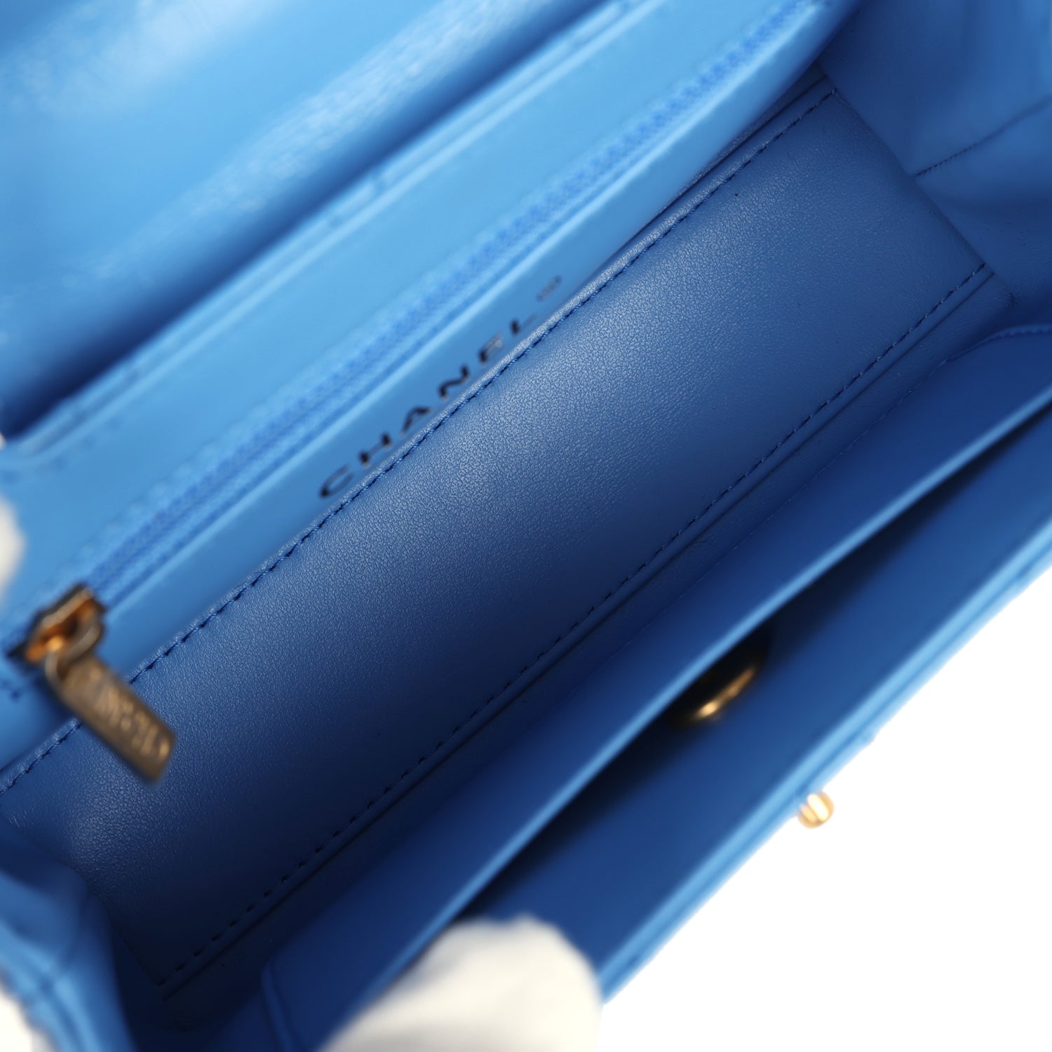 The interior is lined in light blue leather with one zip pocket on the rear wall and one center divide slip pocket.