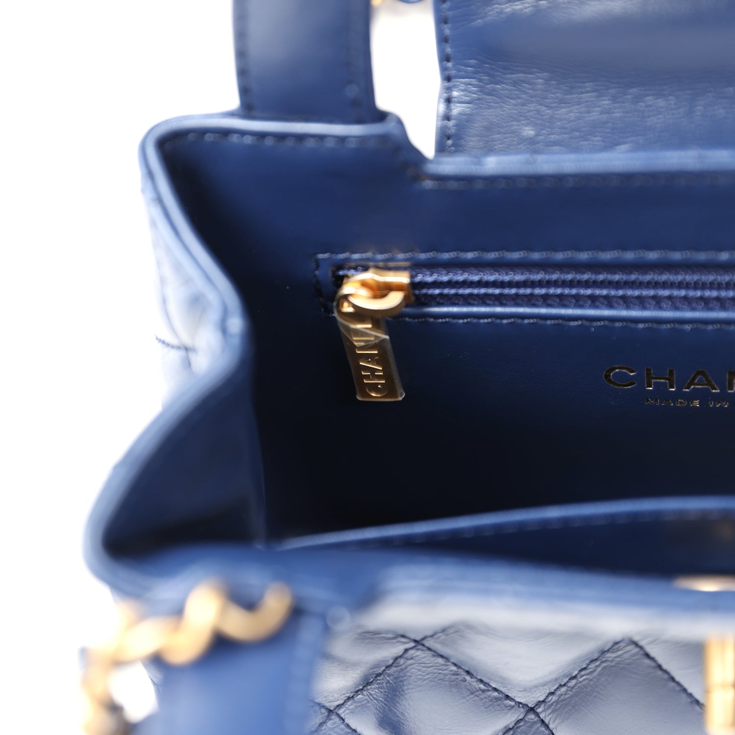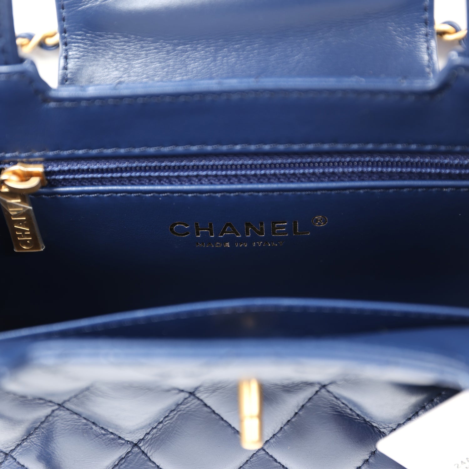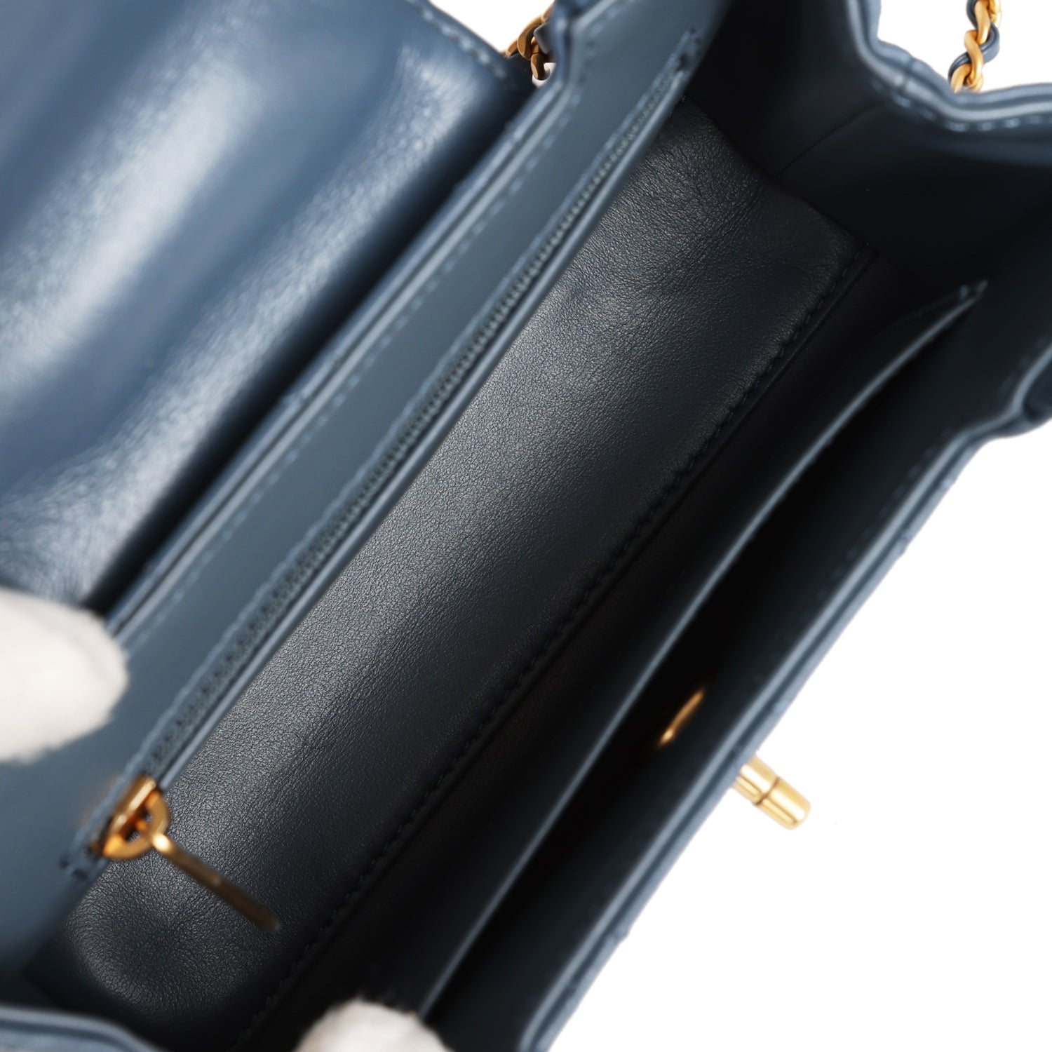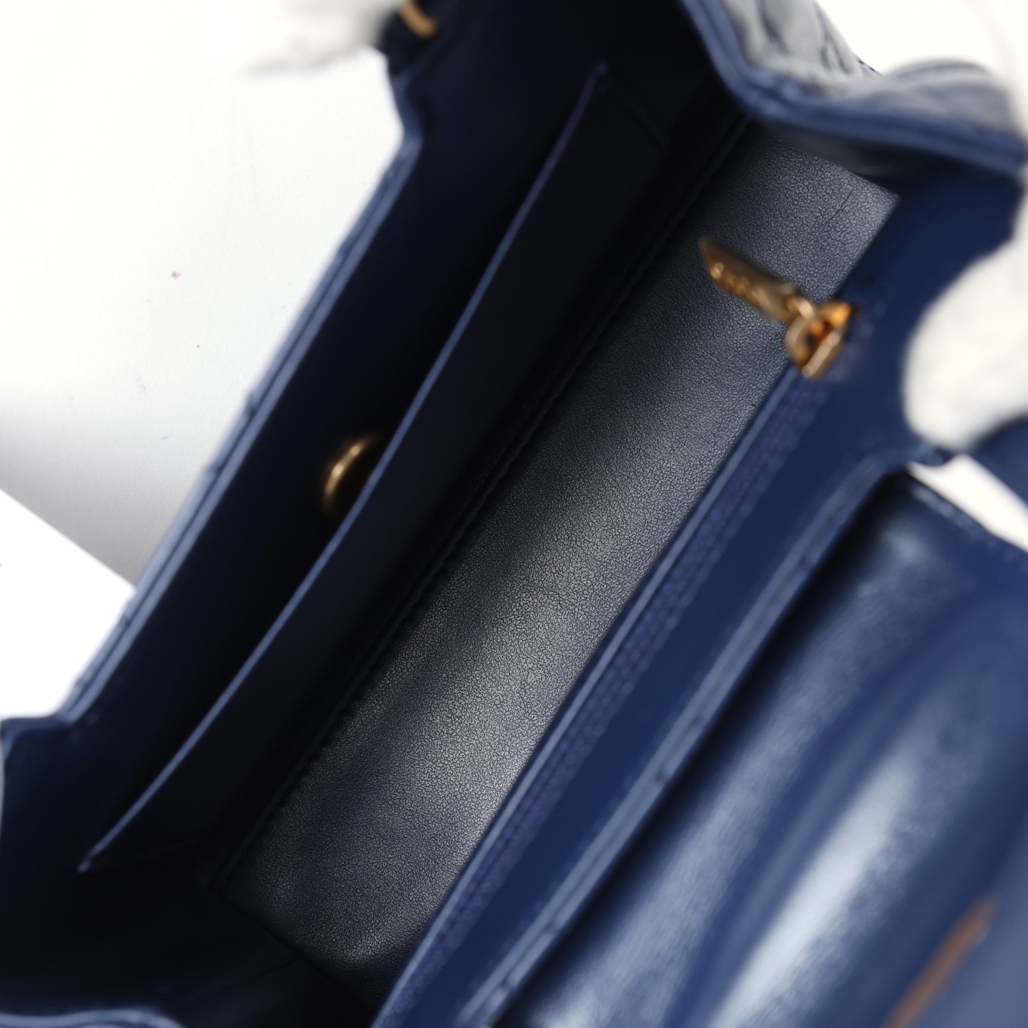 The interior is lined in navy blue leather with one zip pocket on the rear wall and one center divide slip pocket.