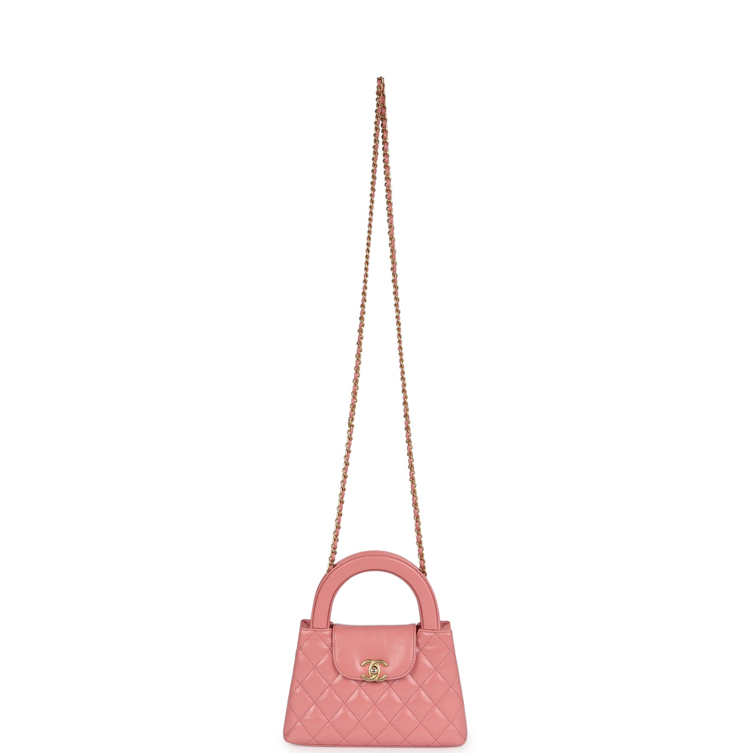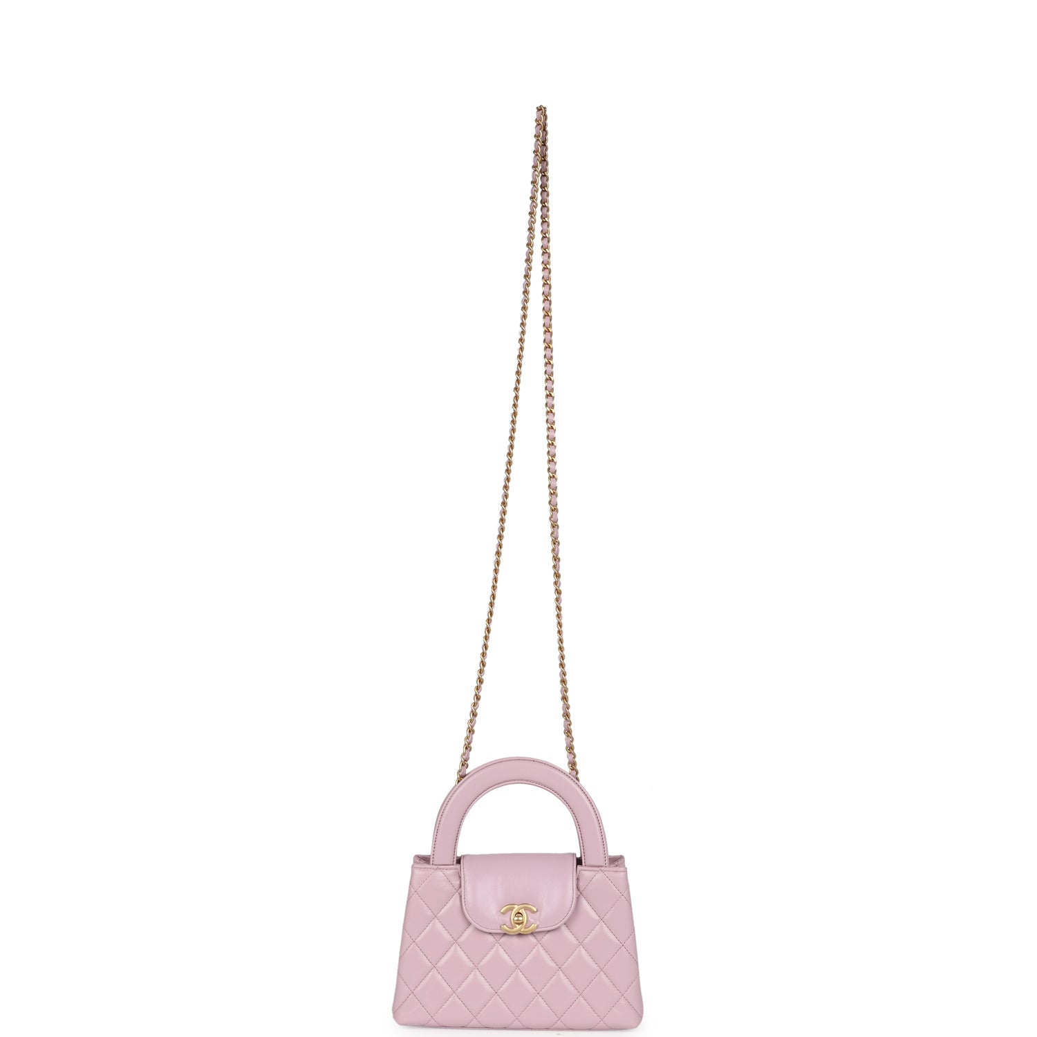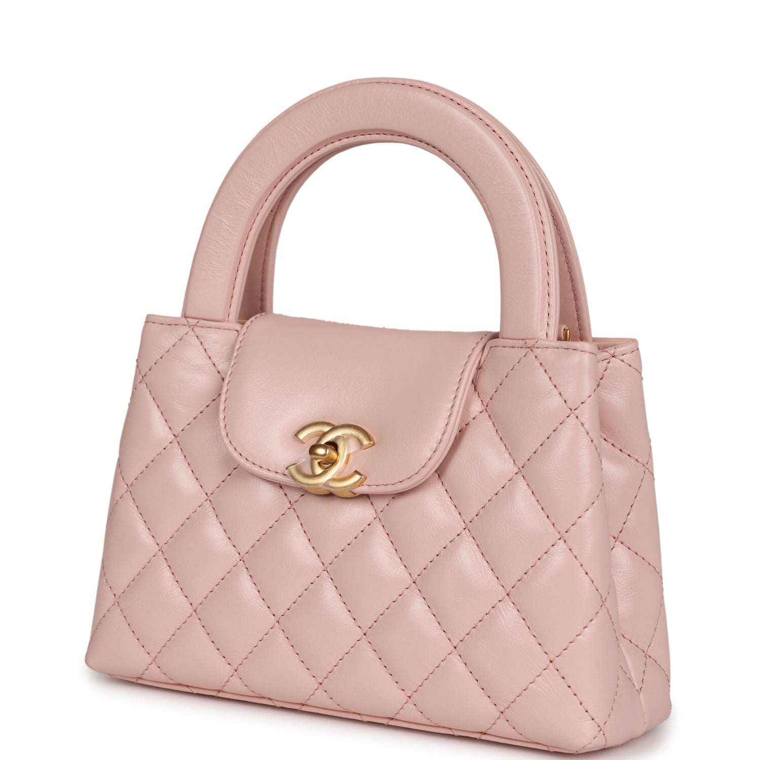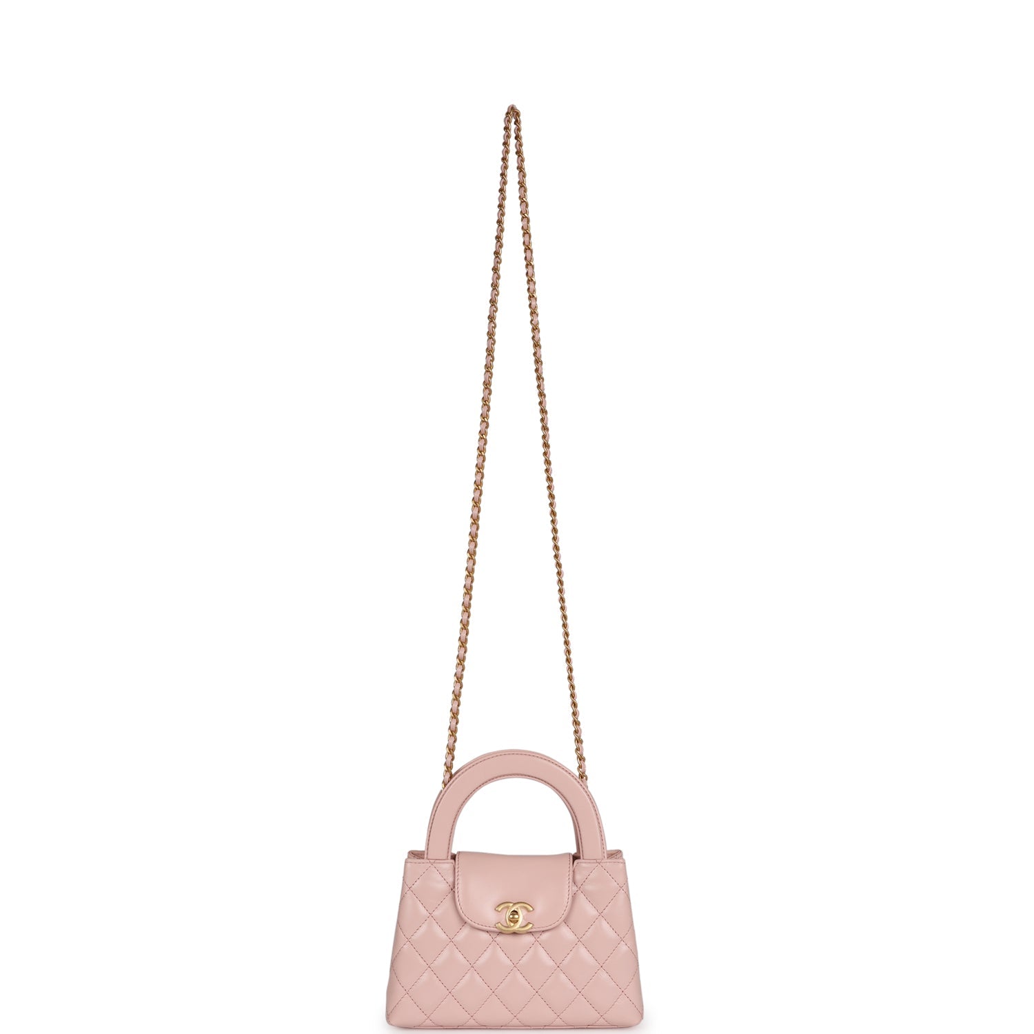 Regular price $1,620.00 Sale price $440.00 Save $1,180.00This small Kelly is in light pink shiny aged calfskin with brushed gold hardware, tonal stitching, two flat back top handles, interwoven brushed gold and light pink leather shoulder strap, and the signature CC turnlock closure.