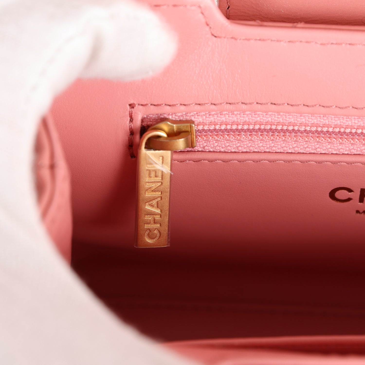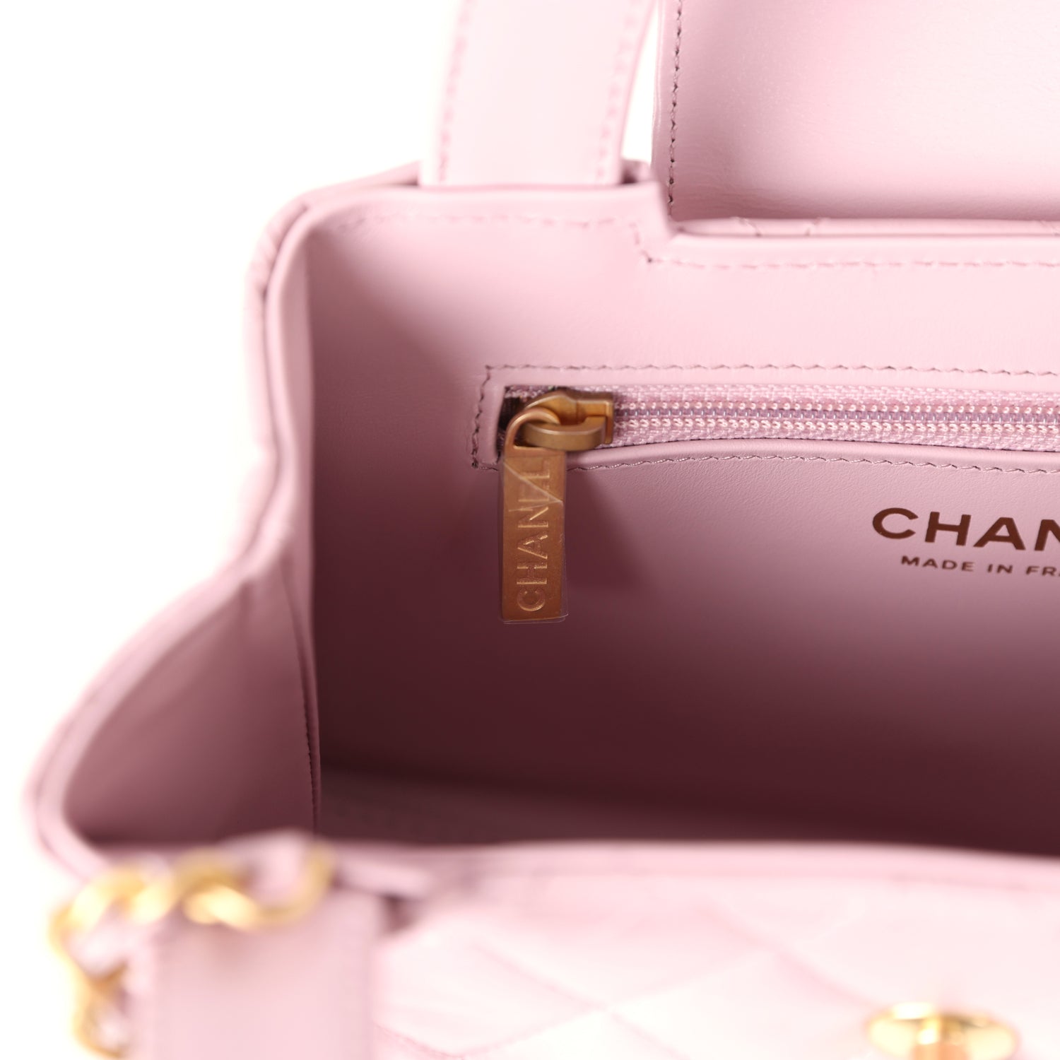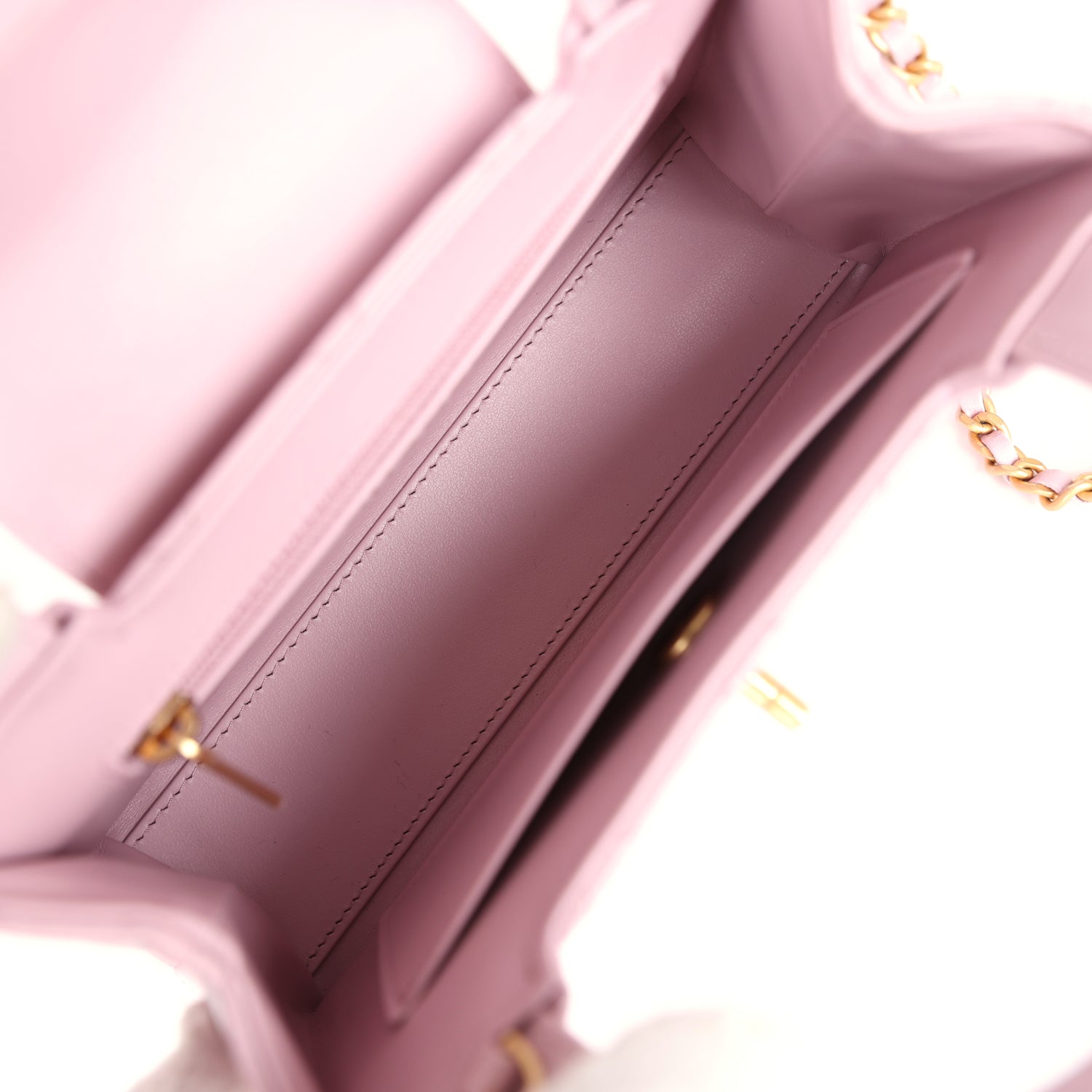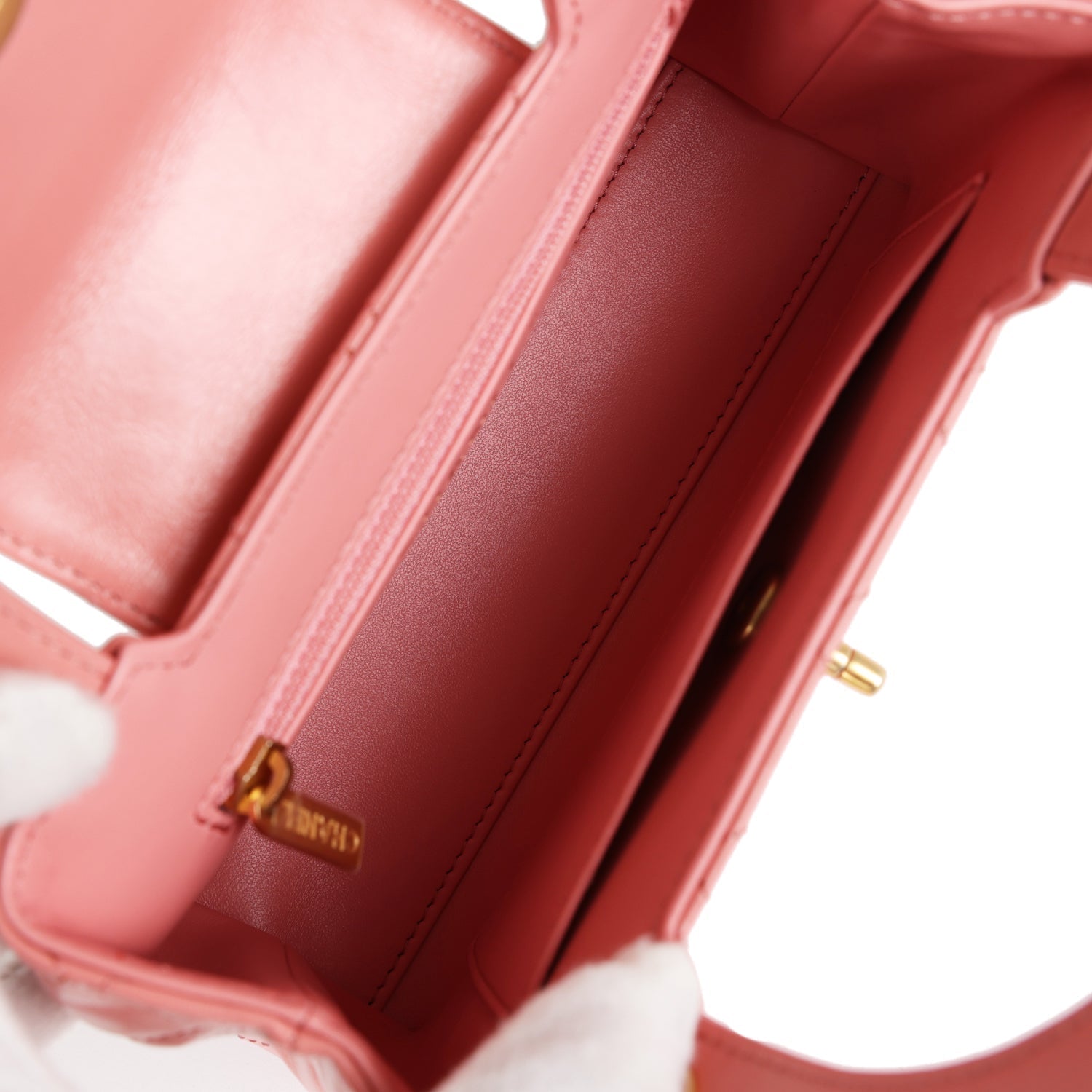 The interior is lined with light pink leather and has one zipper and one slip pocket.
