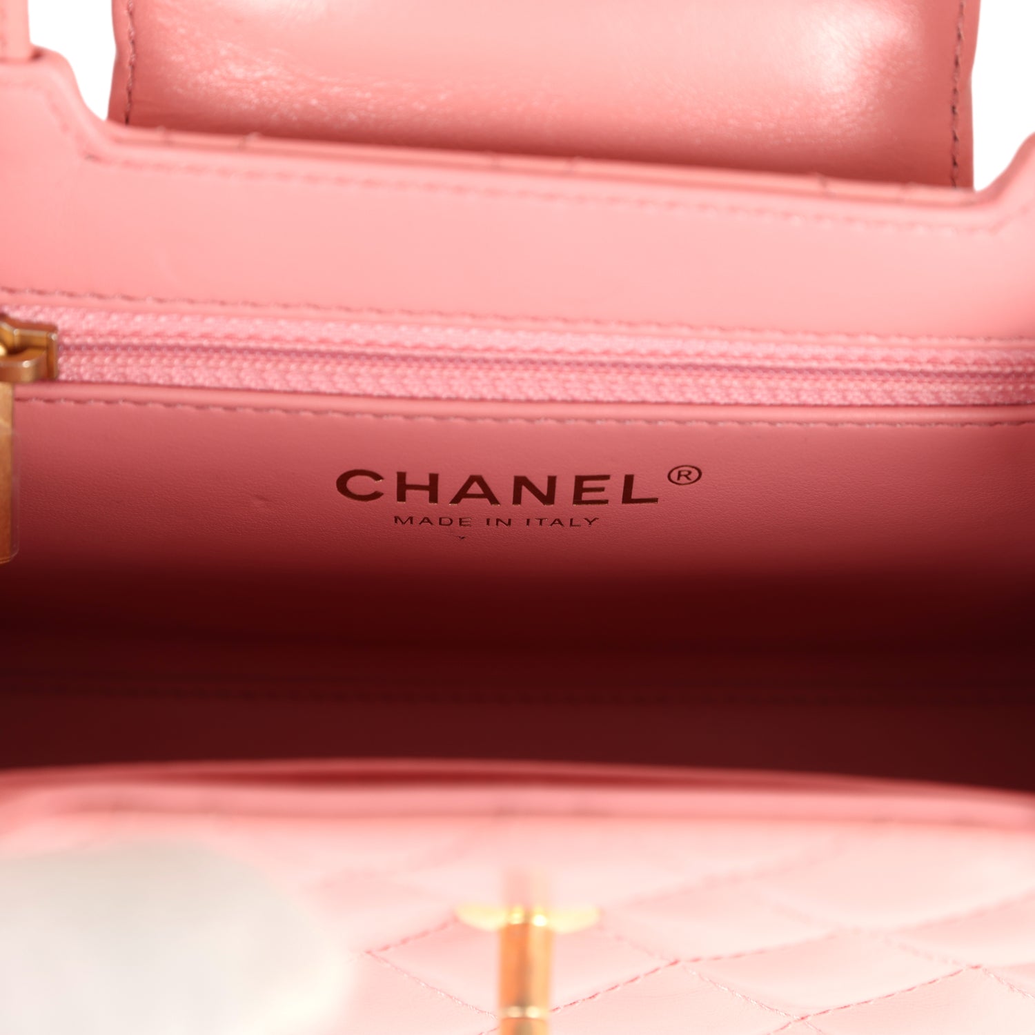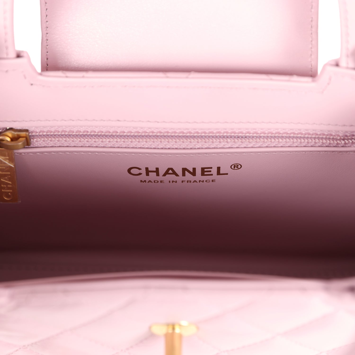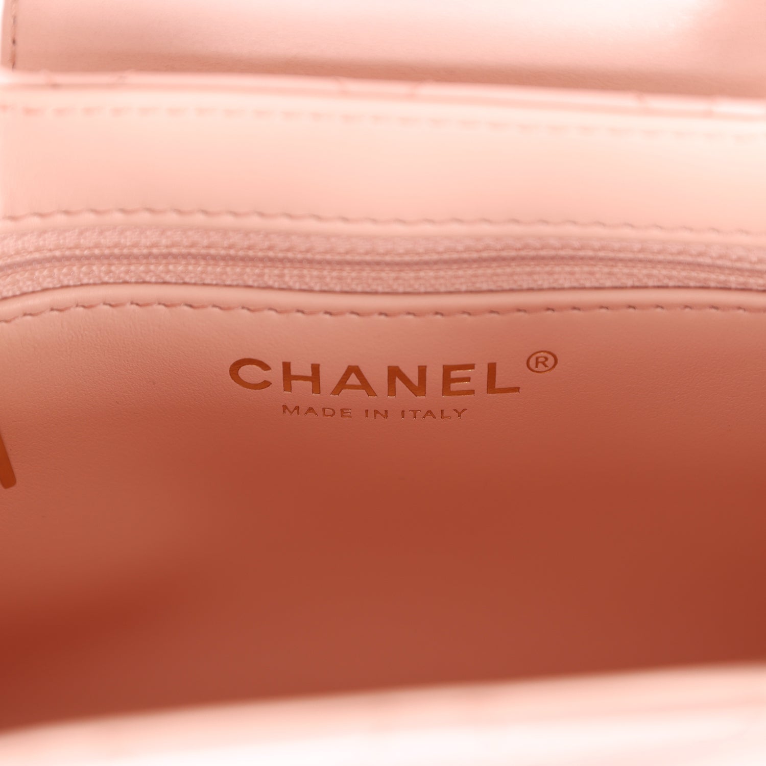 The interior is lined with light pink leather and has one zipper and one slip pocket.