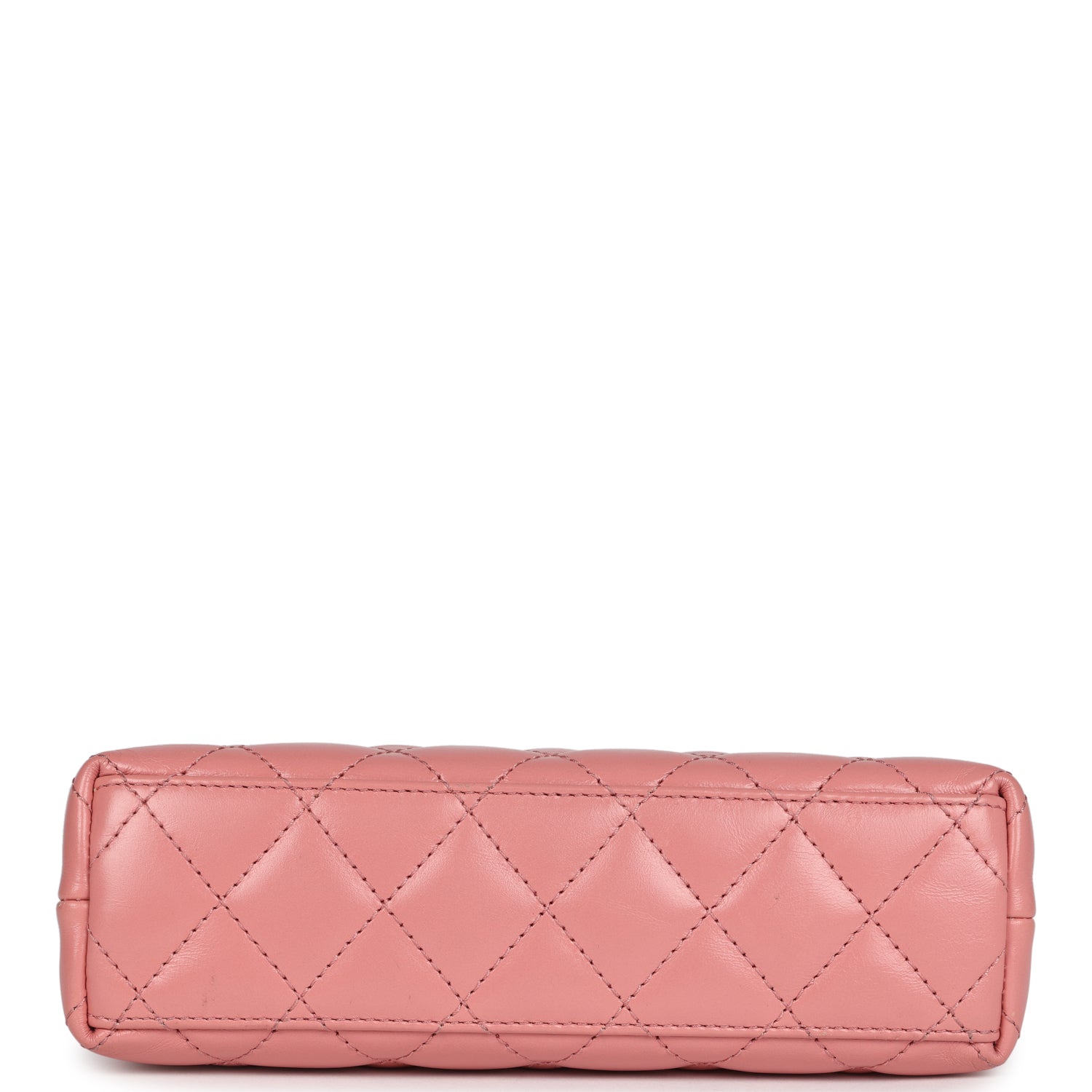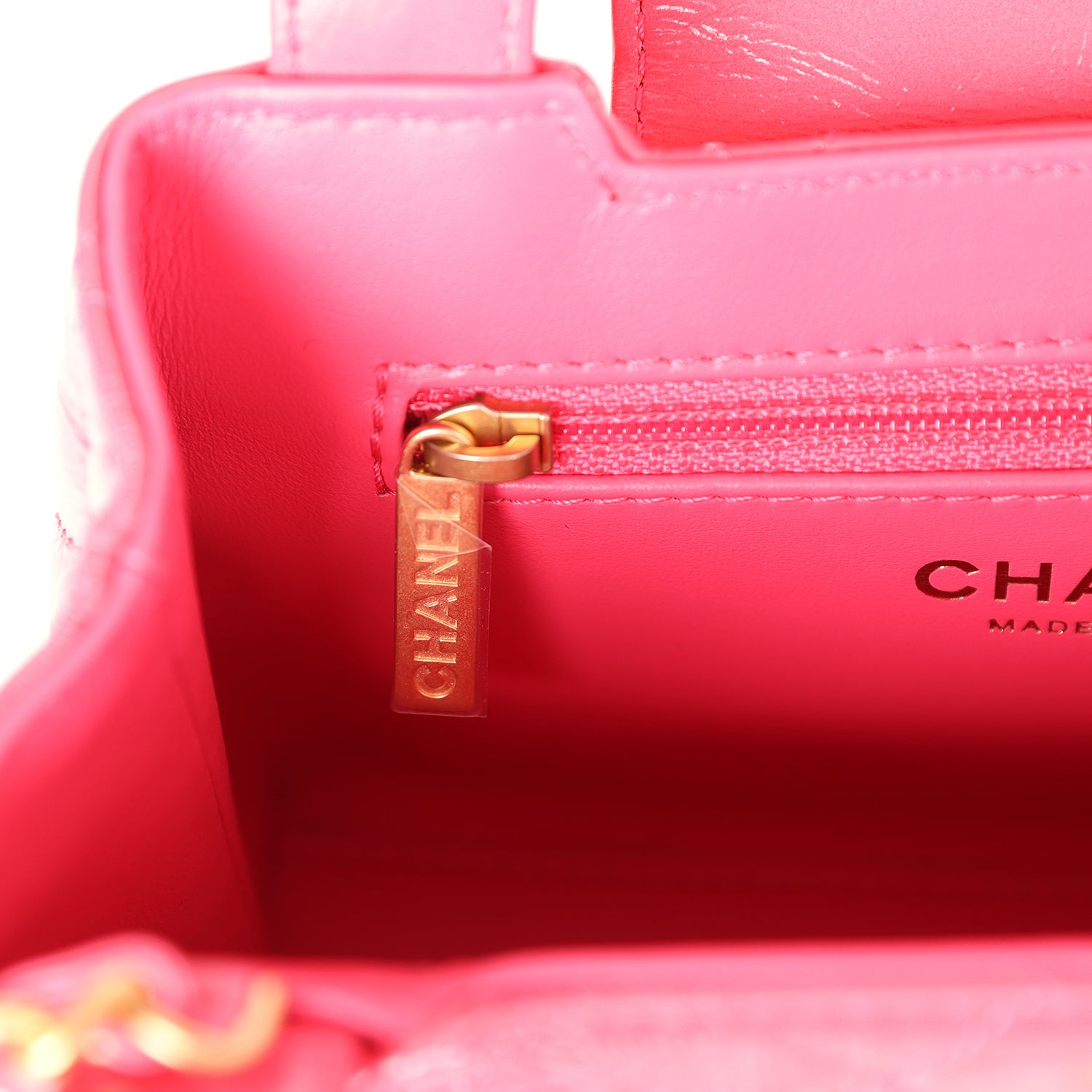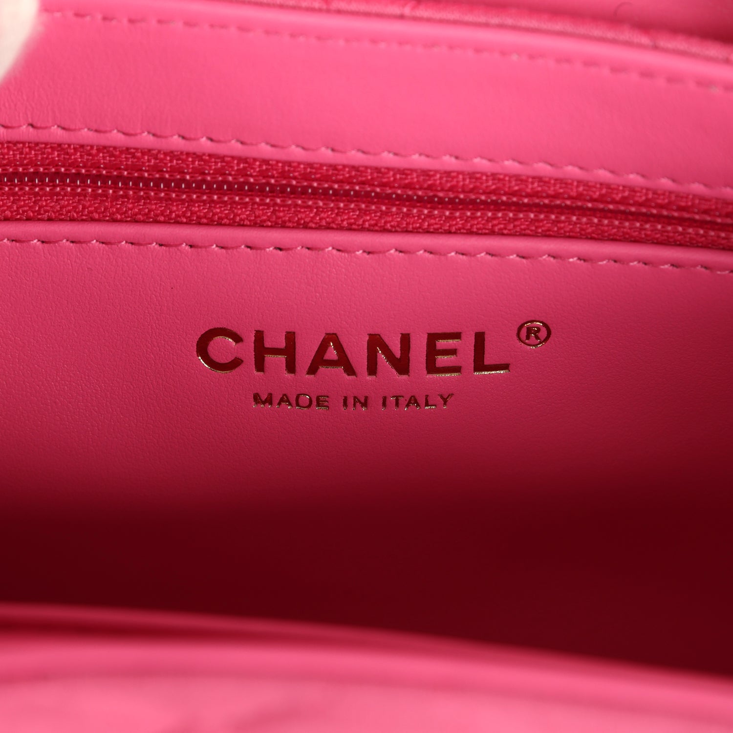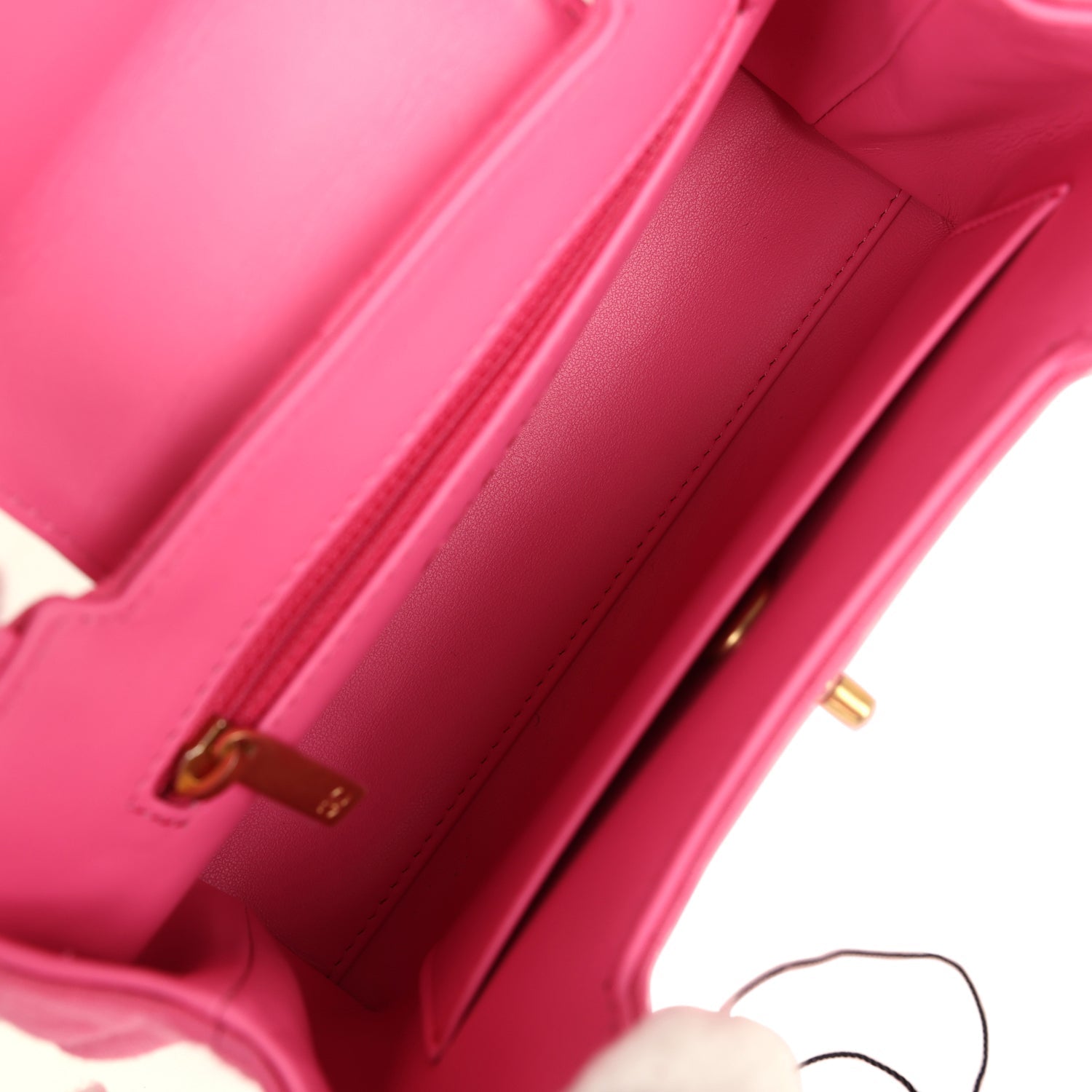 The interior is lined with light pink leather and has one zipper and one slip pocket.
