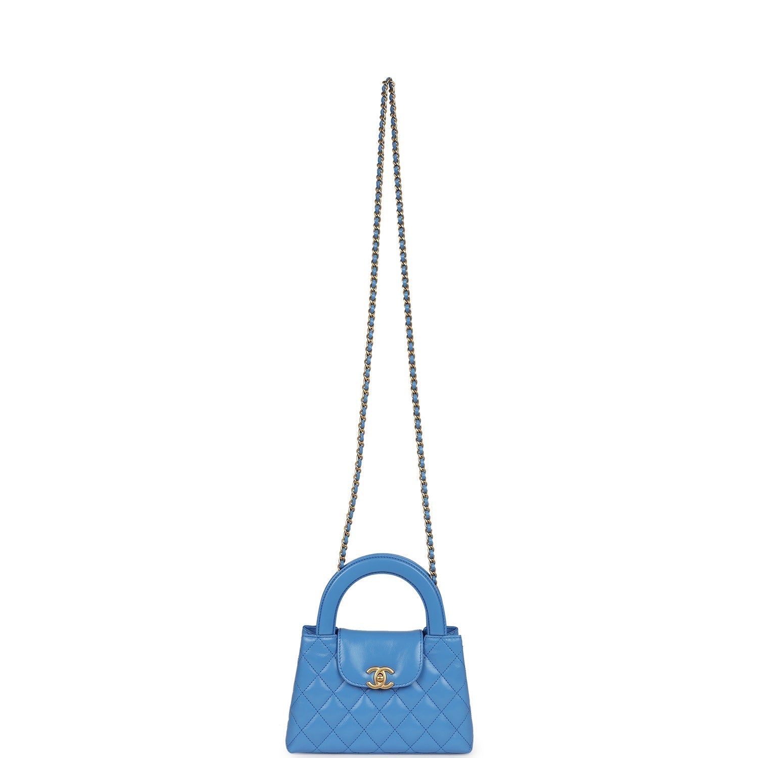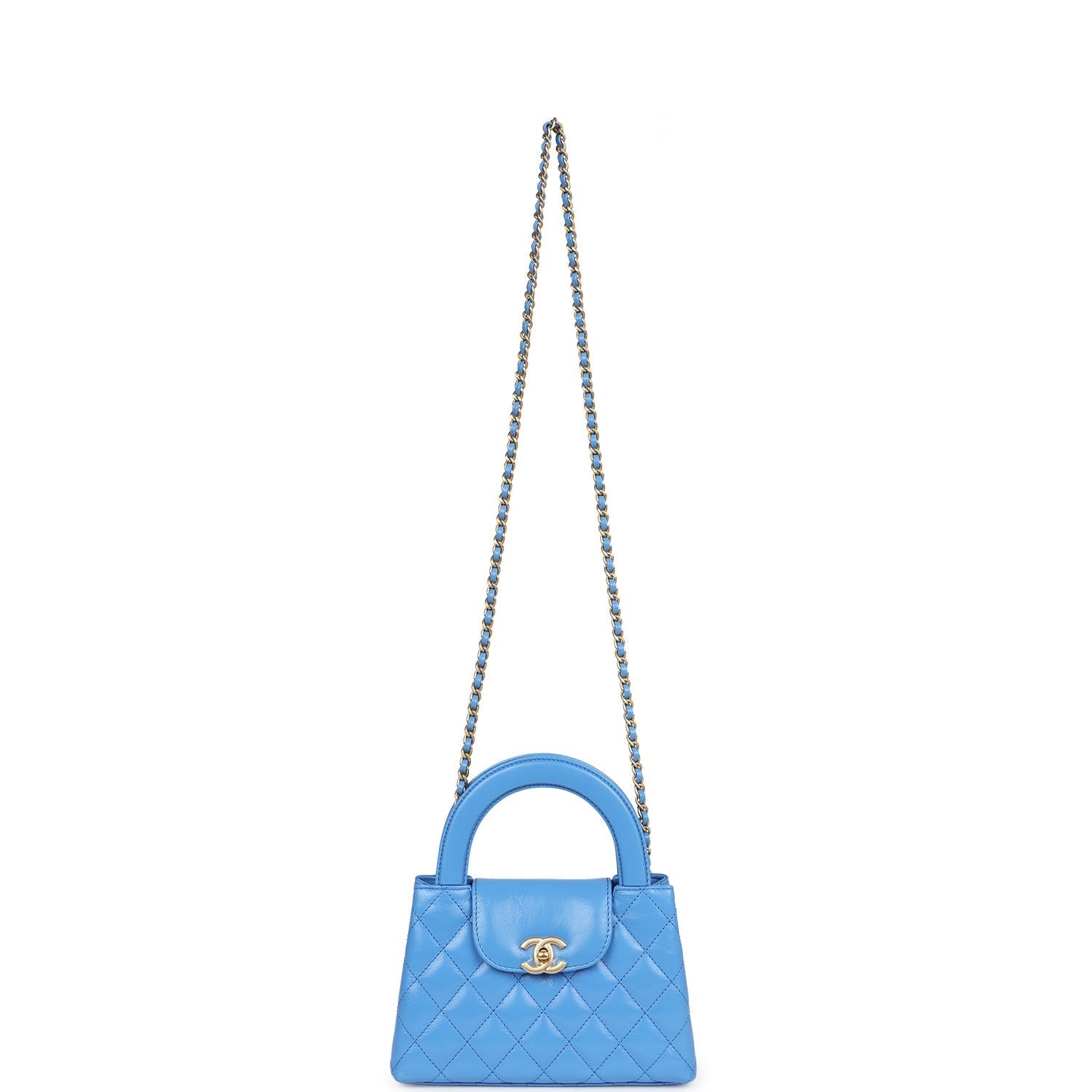 Regular price $1,640.00 Sale price $440.00 Save $1,200.00This small Kelly is in light blue shiny aged calfskin with brushed gold hardware, tonal stitching, two flat back top handles and an interwoven brushed gold with light blue leather shoulder strap, and CC turnlock closure.