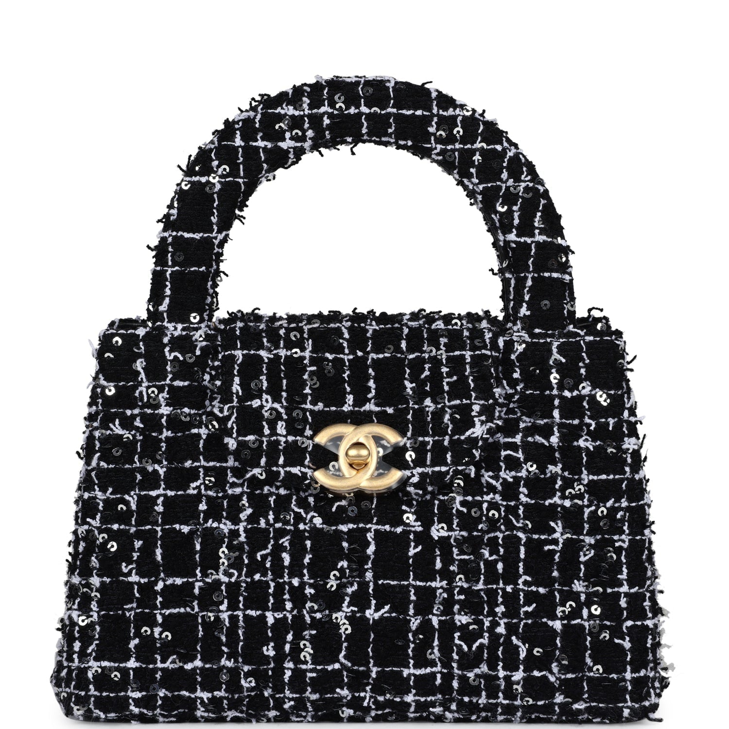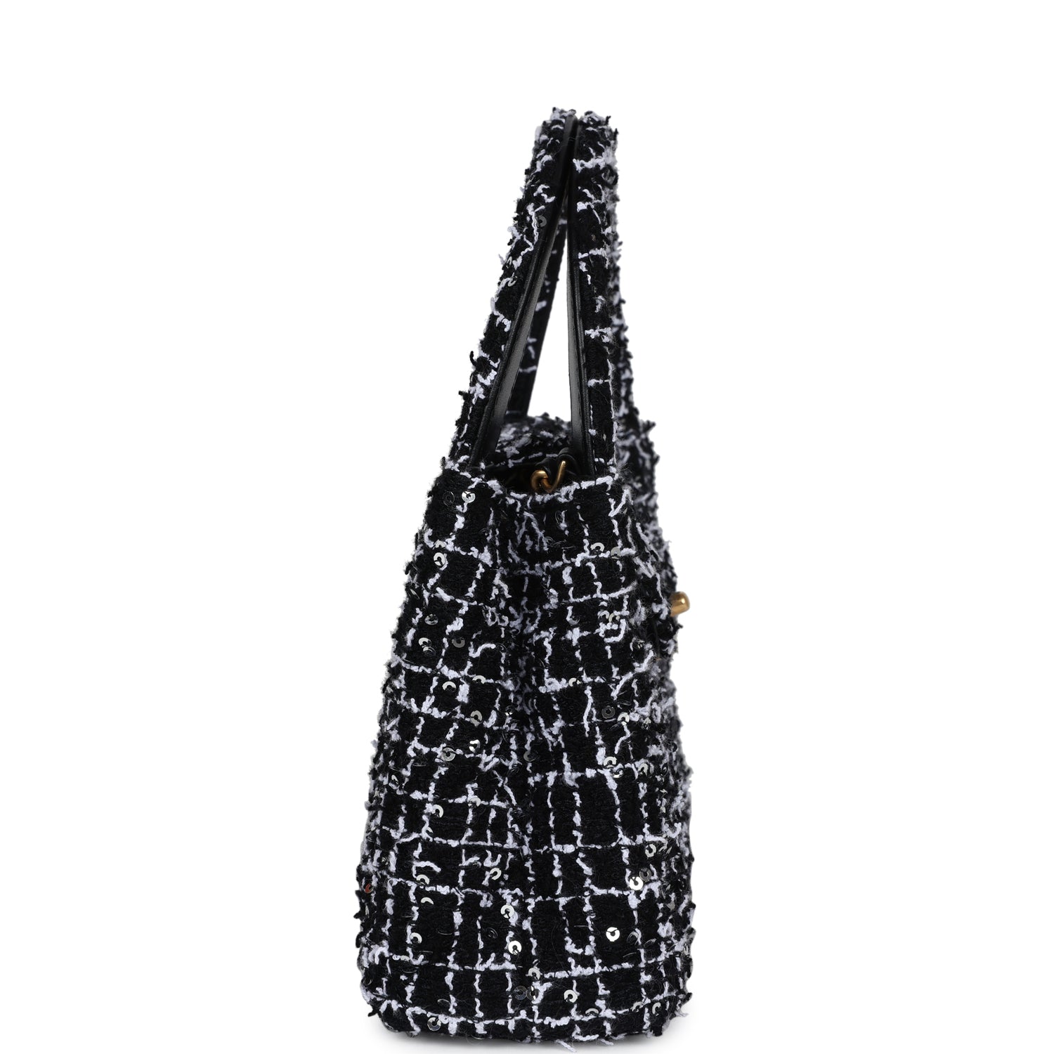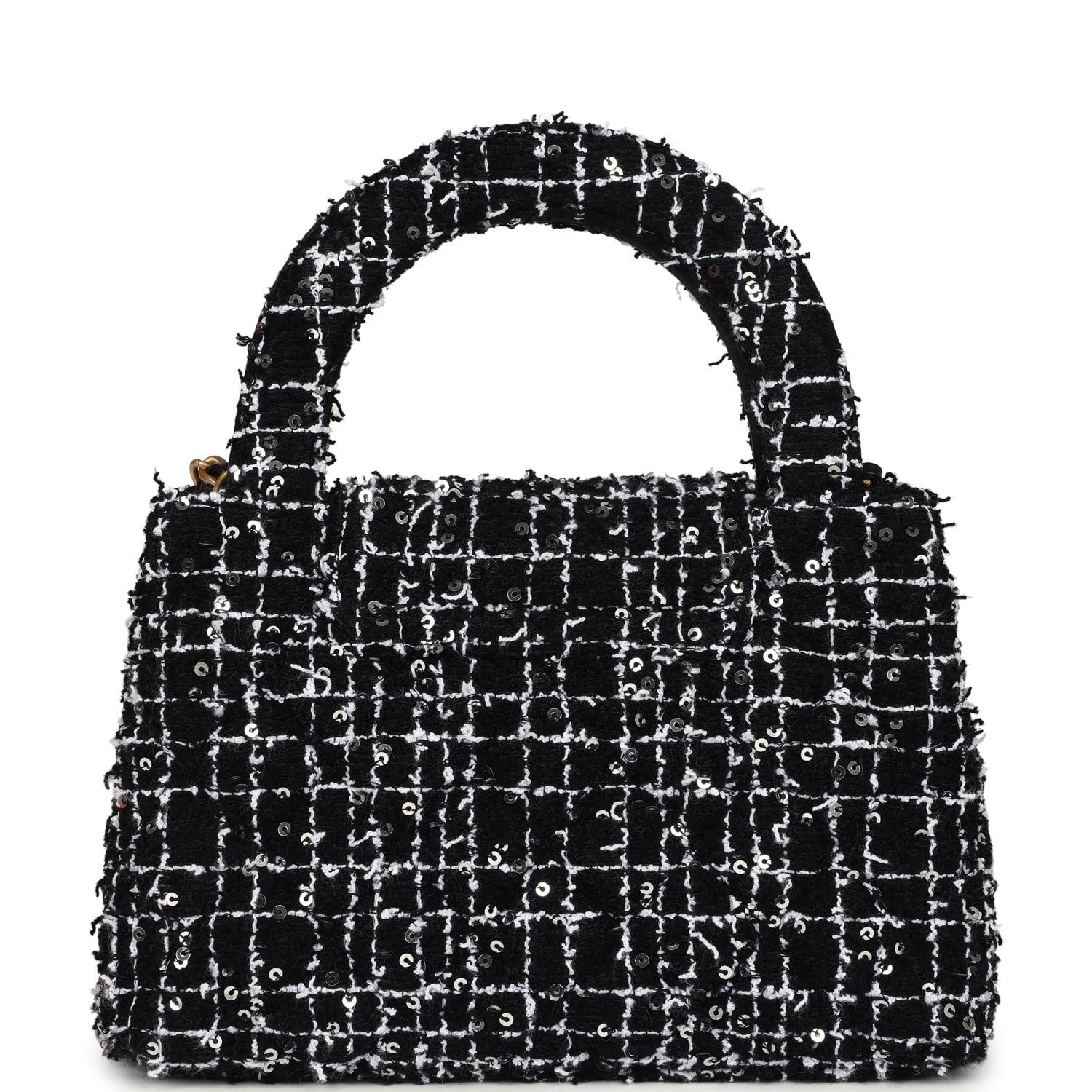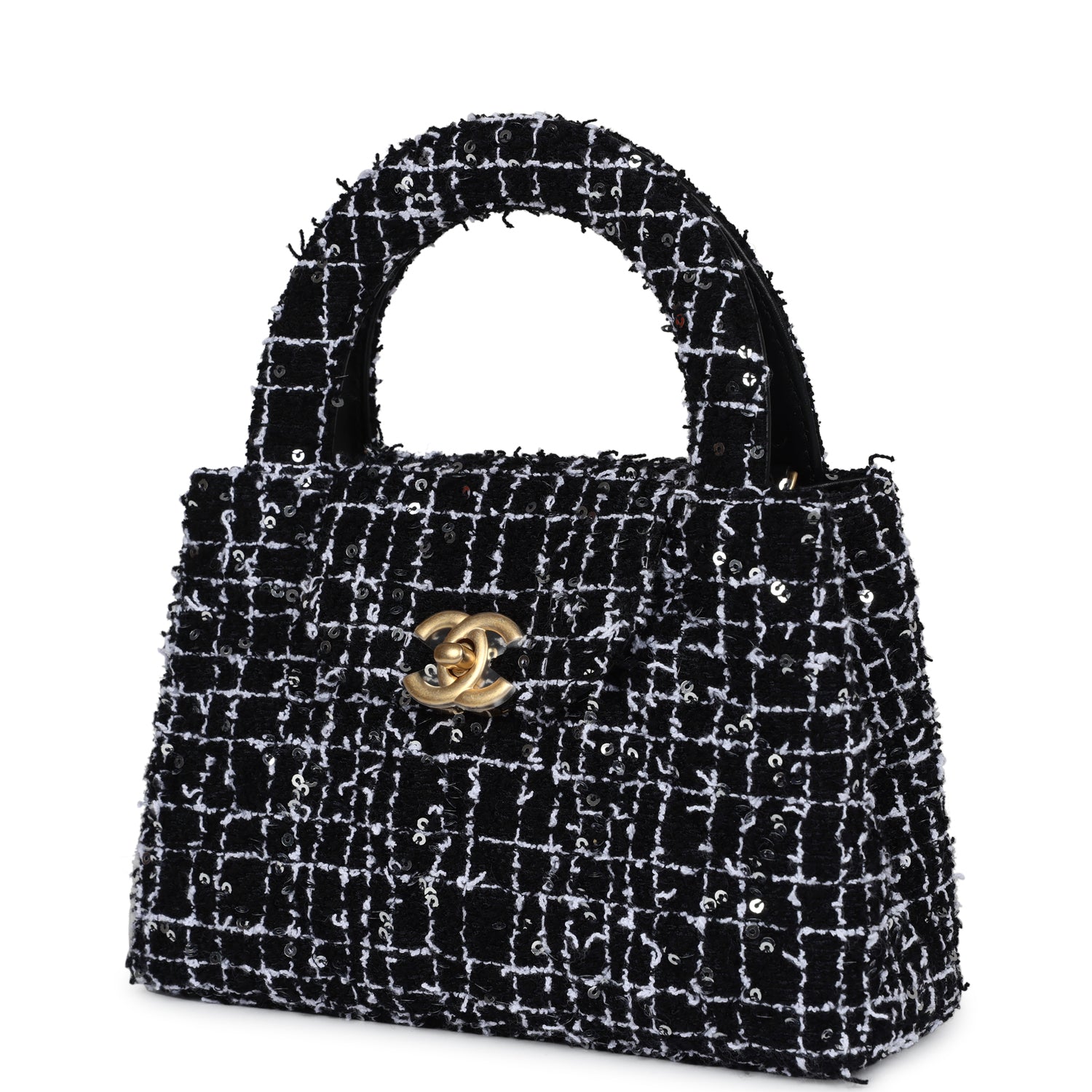 Chanel Small Kelly Shopper Black, White & Silver Sequin Tweed Brushed Gold Hardware
