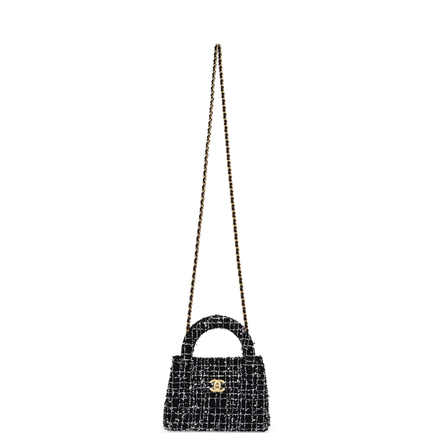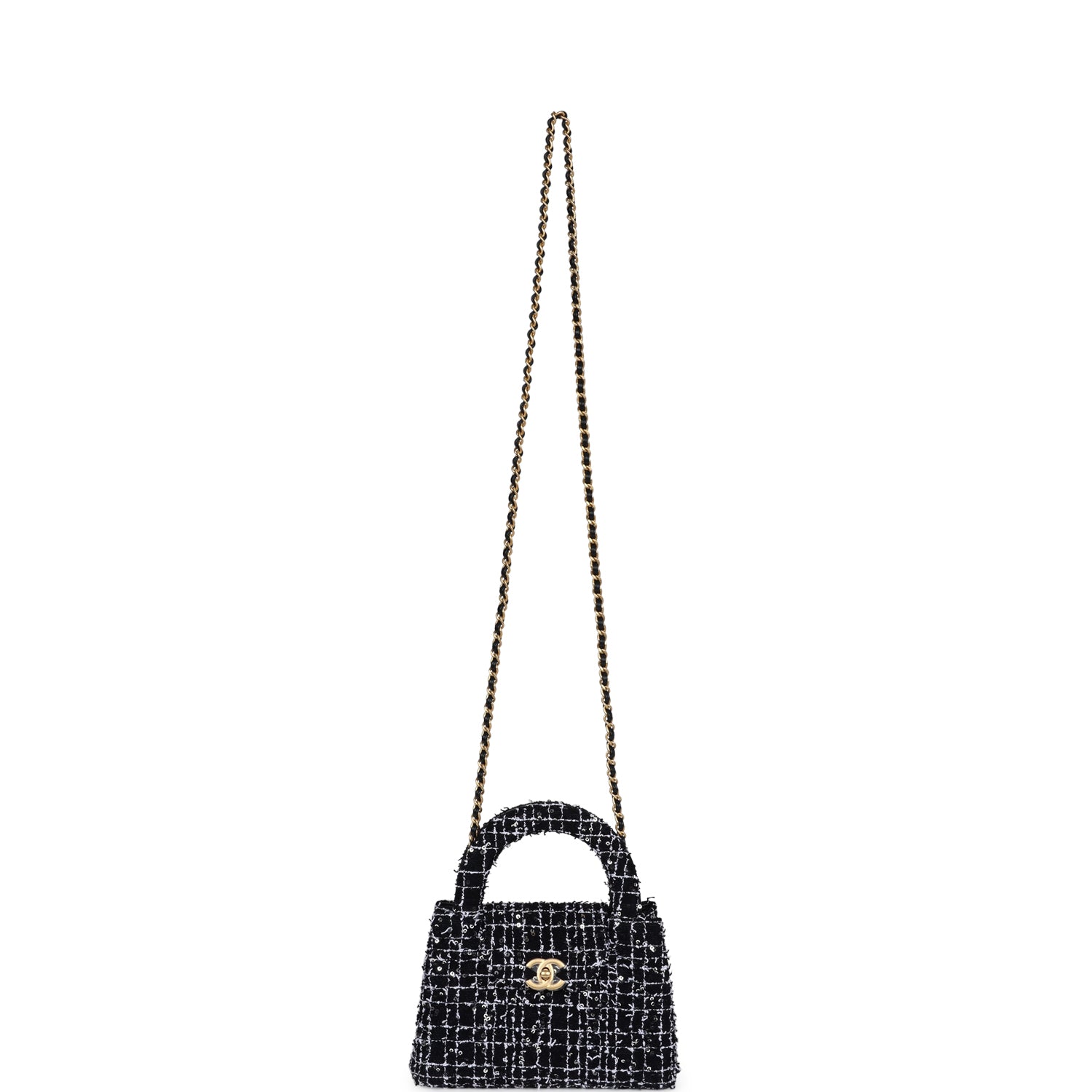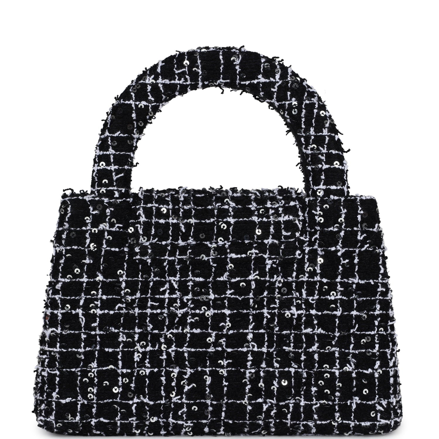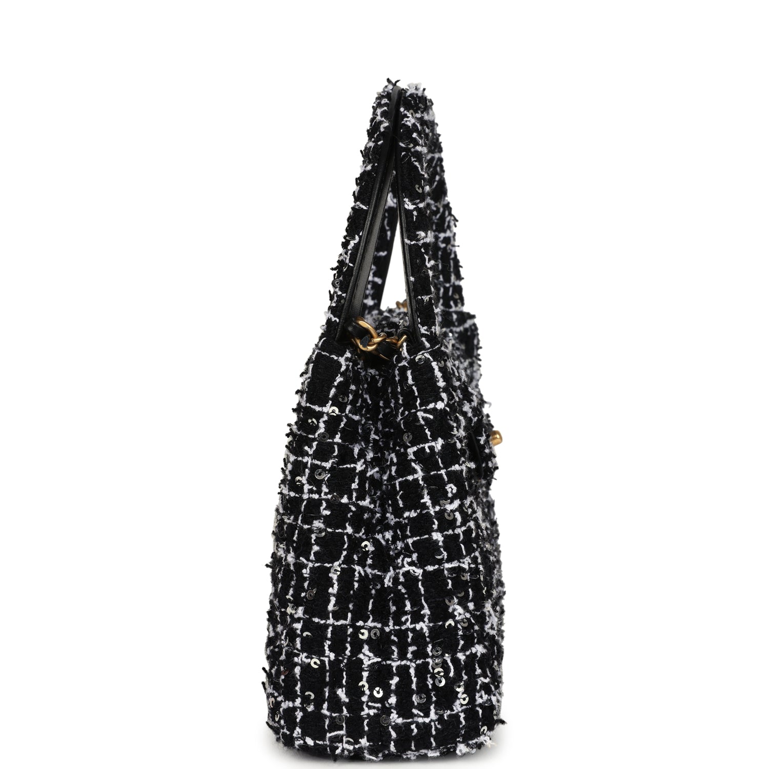 Chanel Small Kelly Shopper Black, White & Silver Sequin Tweed Brushed Gold Hardware