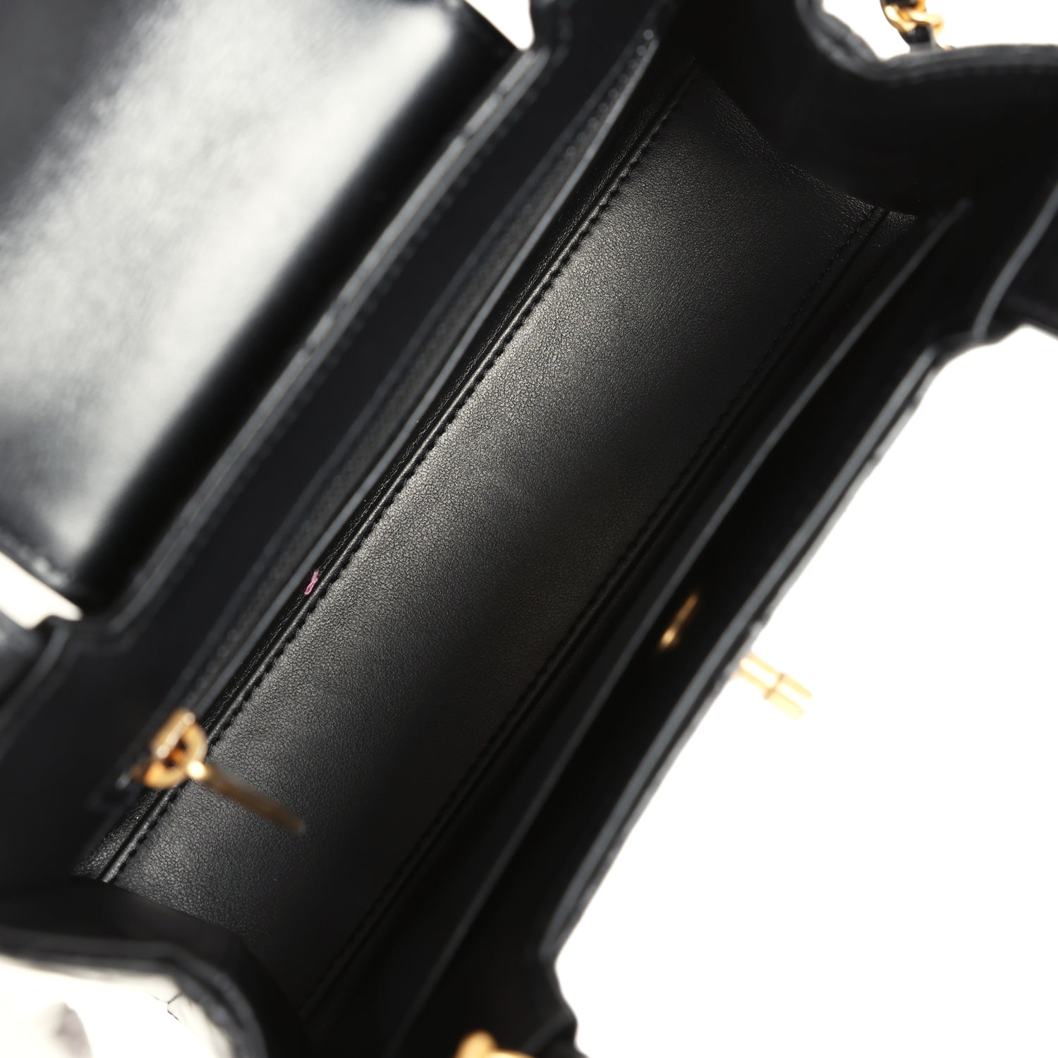 Regular price $1,770.00 Sale price $440.00 Save $1,330.00This small Kelly is in black shiny aged calfskin with brushed gold hardware, tonal stitching, two flat back top handles, interwoven brushed gold and black leather shoulder strap, and the signature CC turnlock closure.