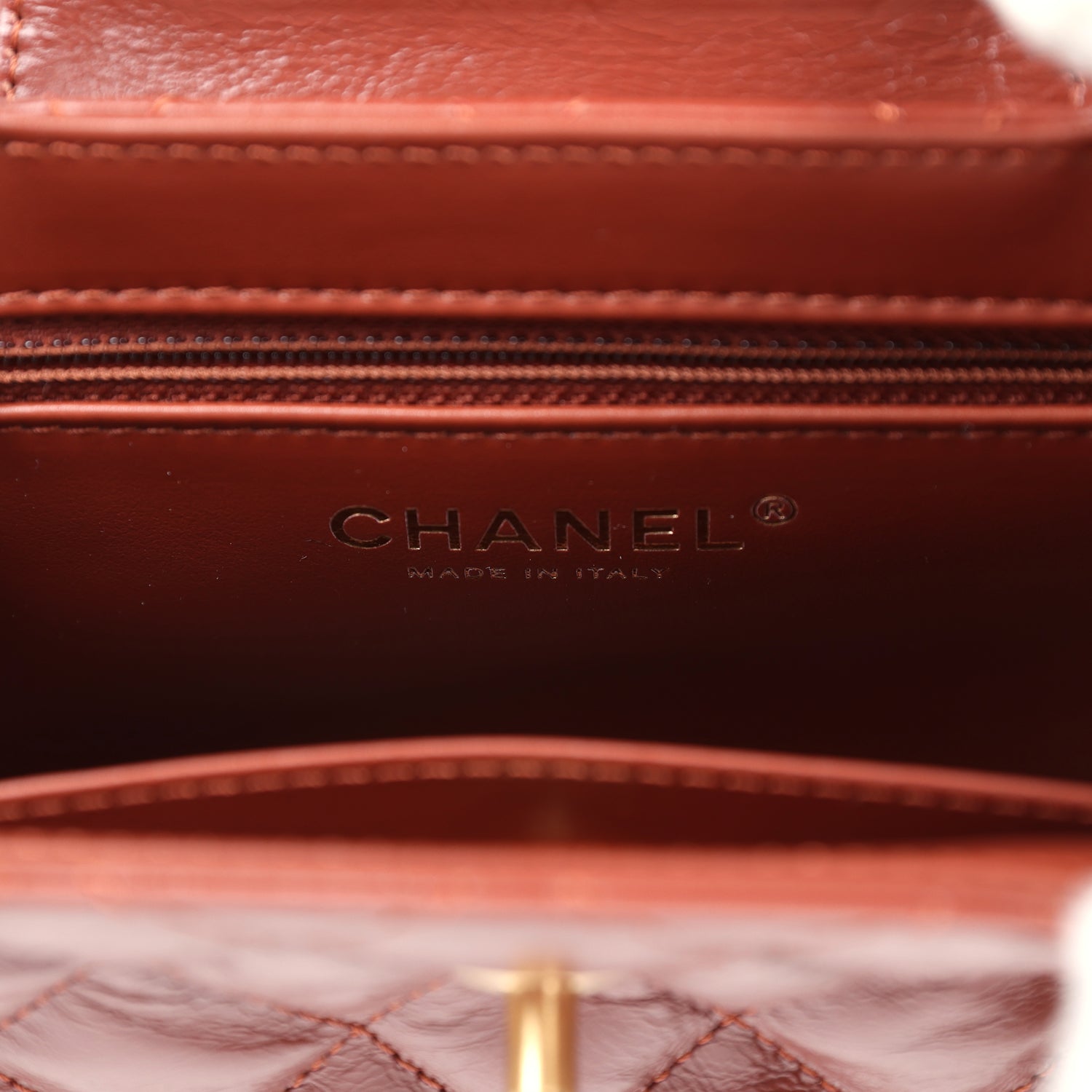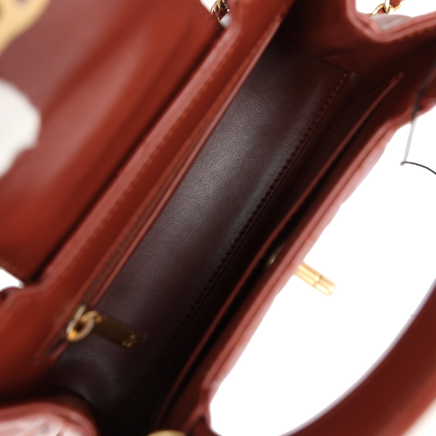 The interior is lined with brown leather and has one zipper and one slip pocket.