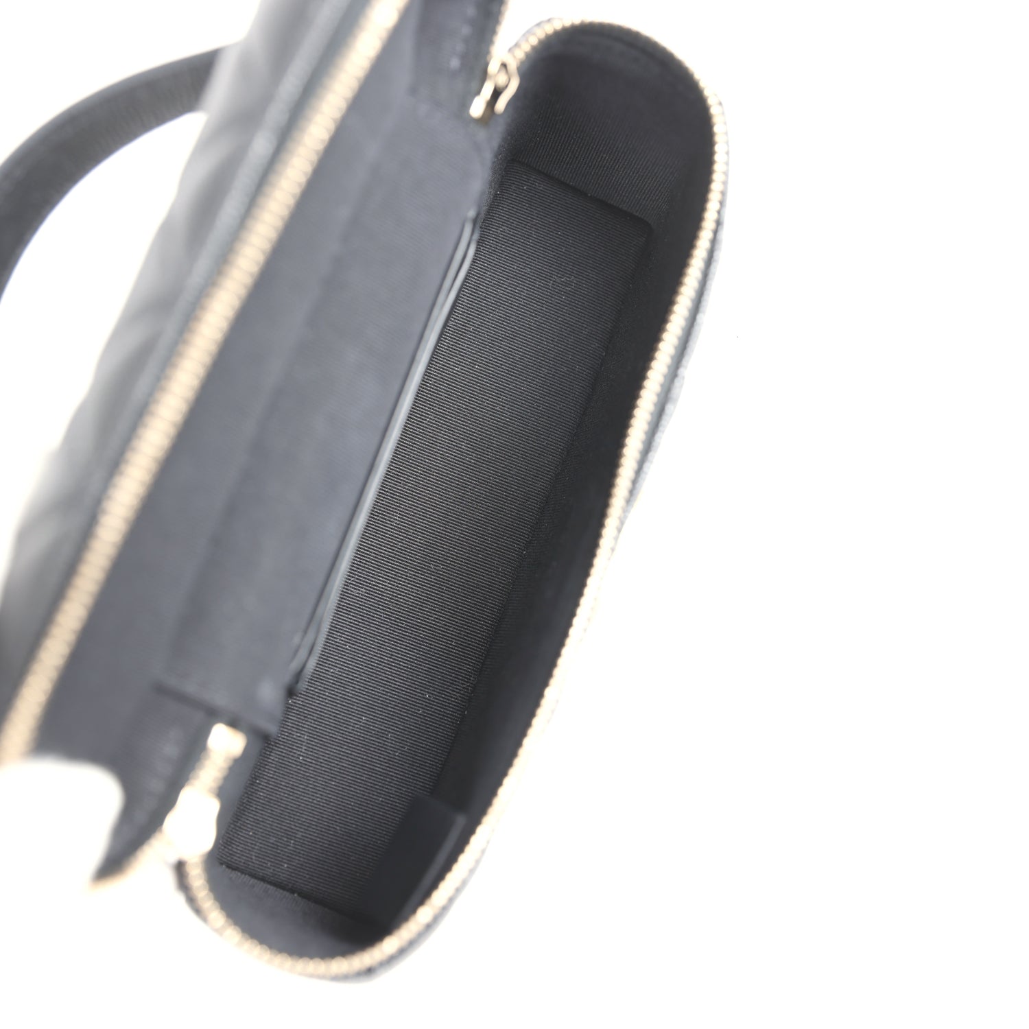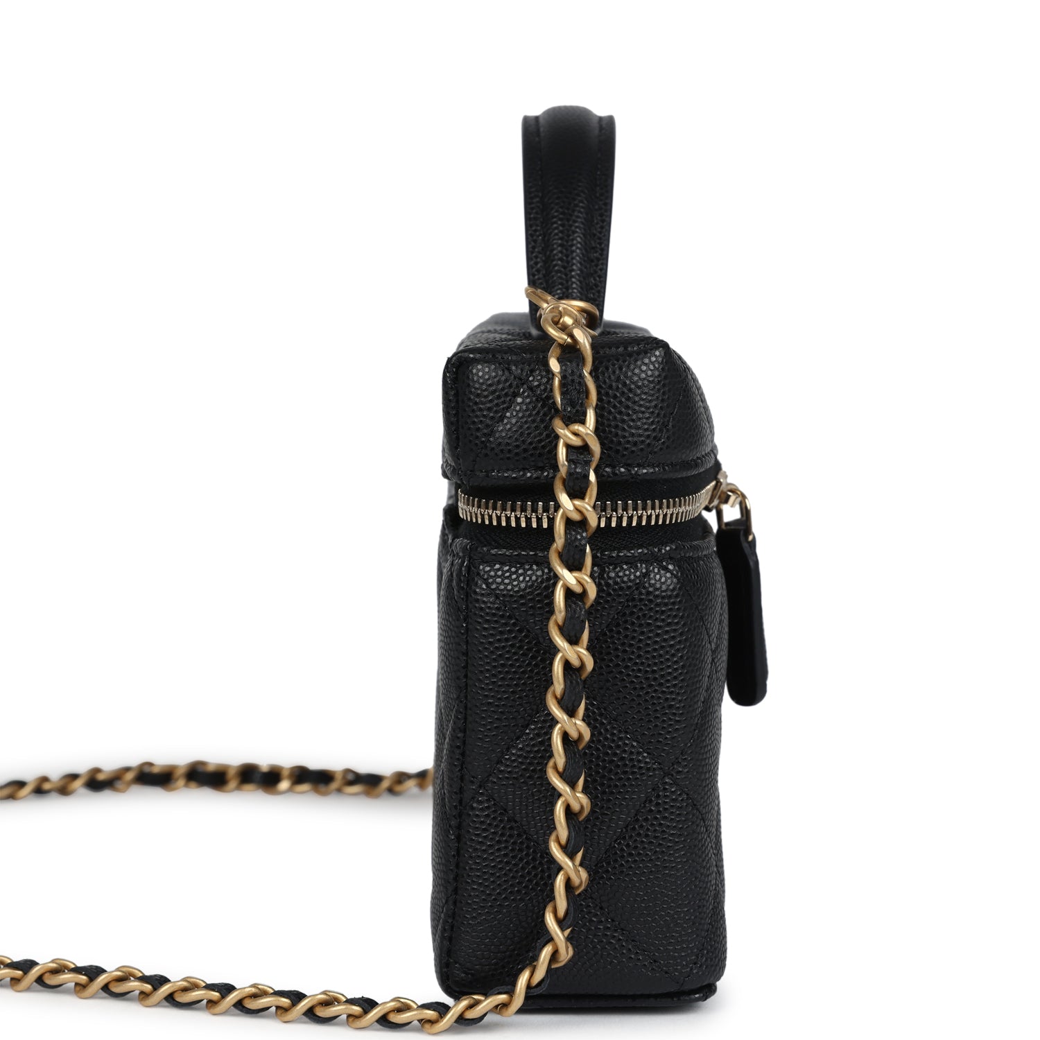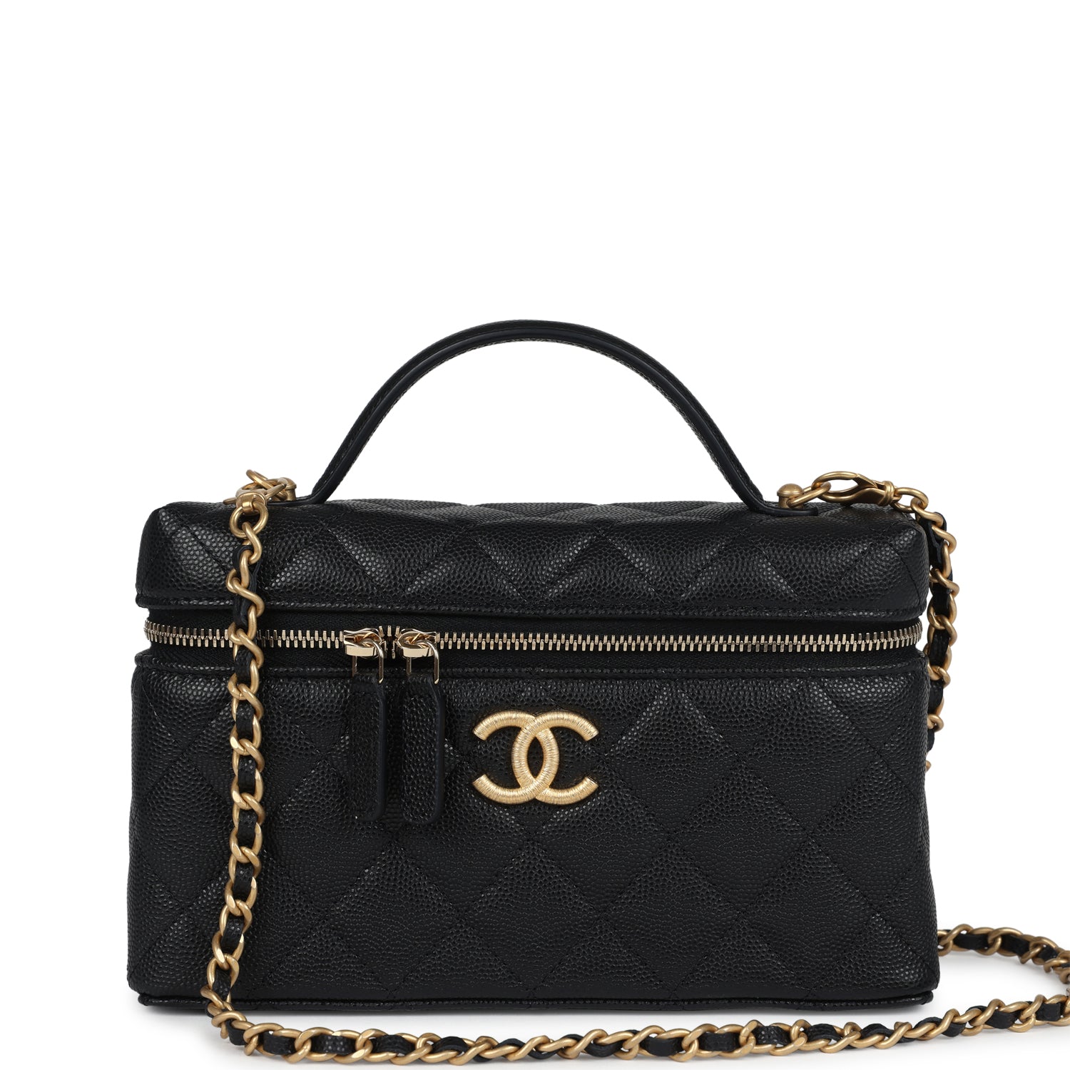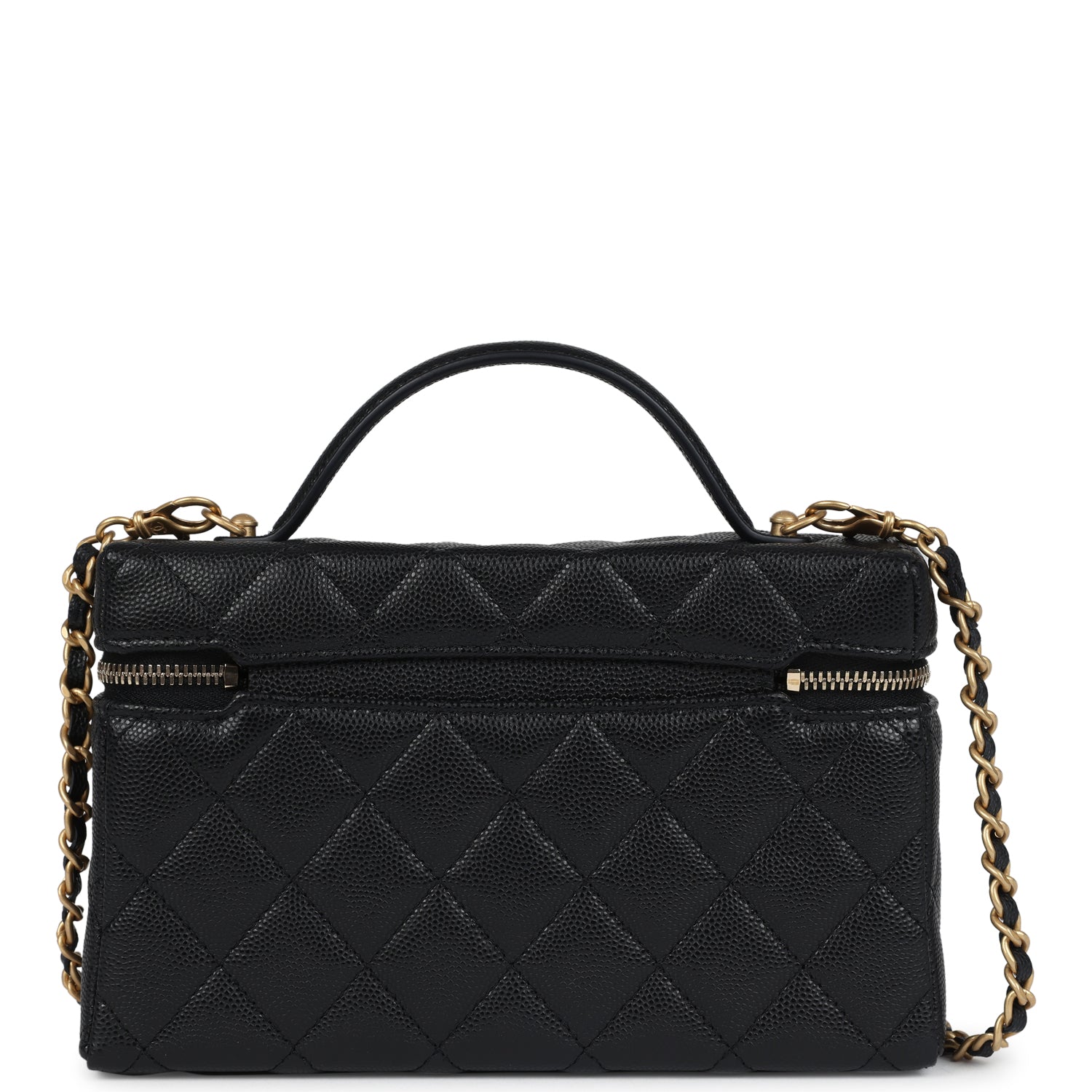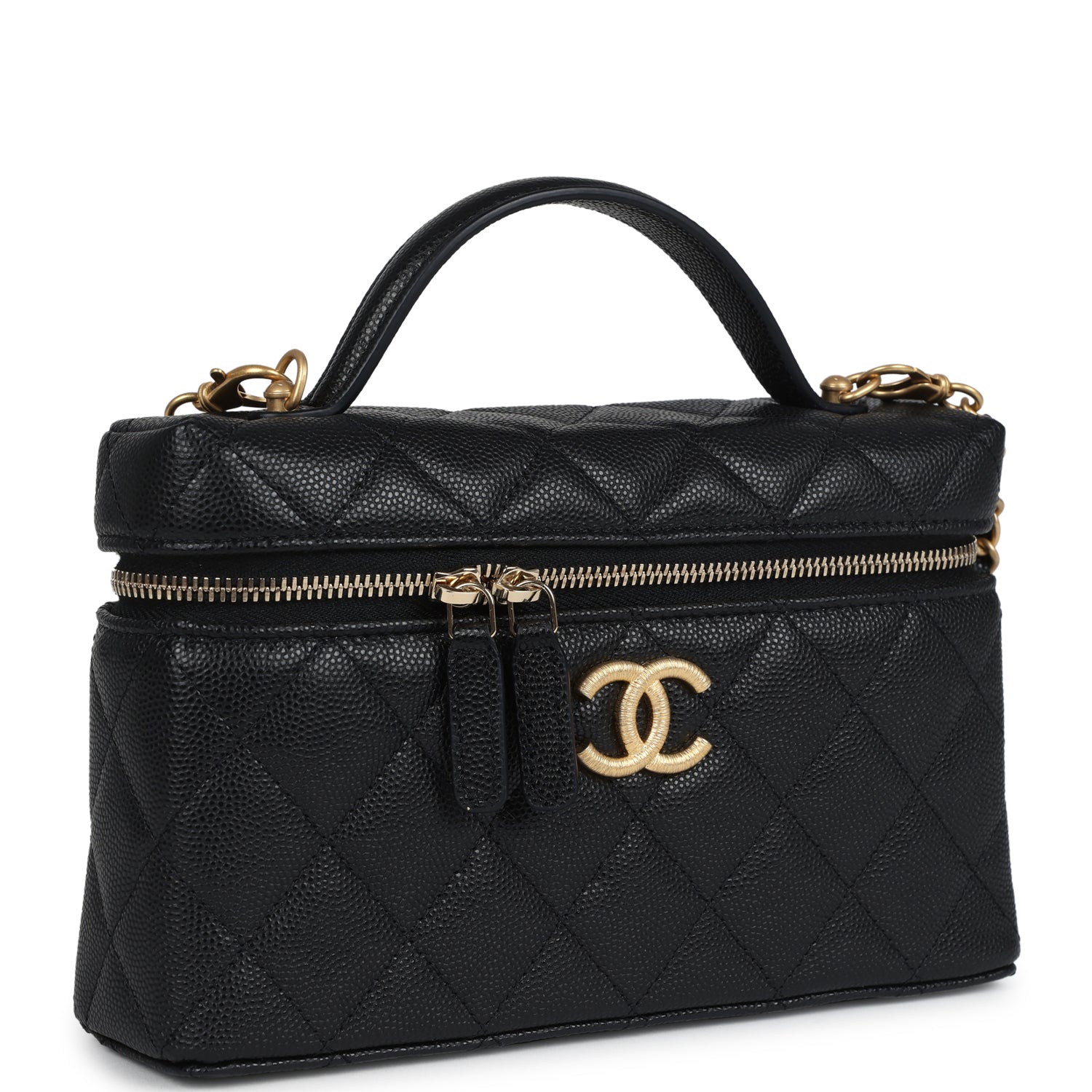 Chanel Top Handle Long Vanity Case With Chain Black Shiny Caviar Brushed Gold Hardware