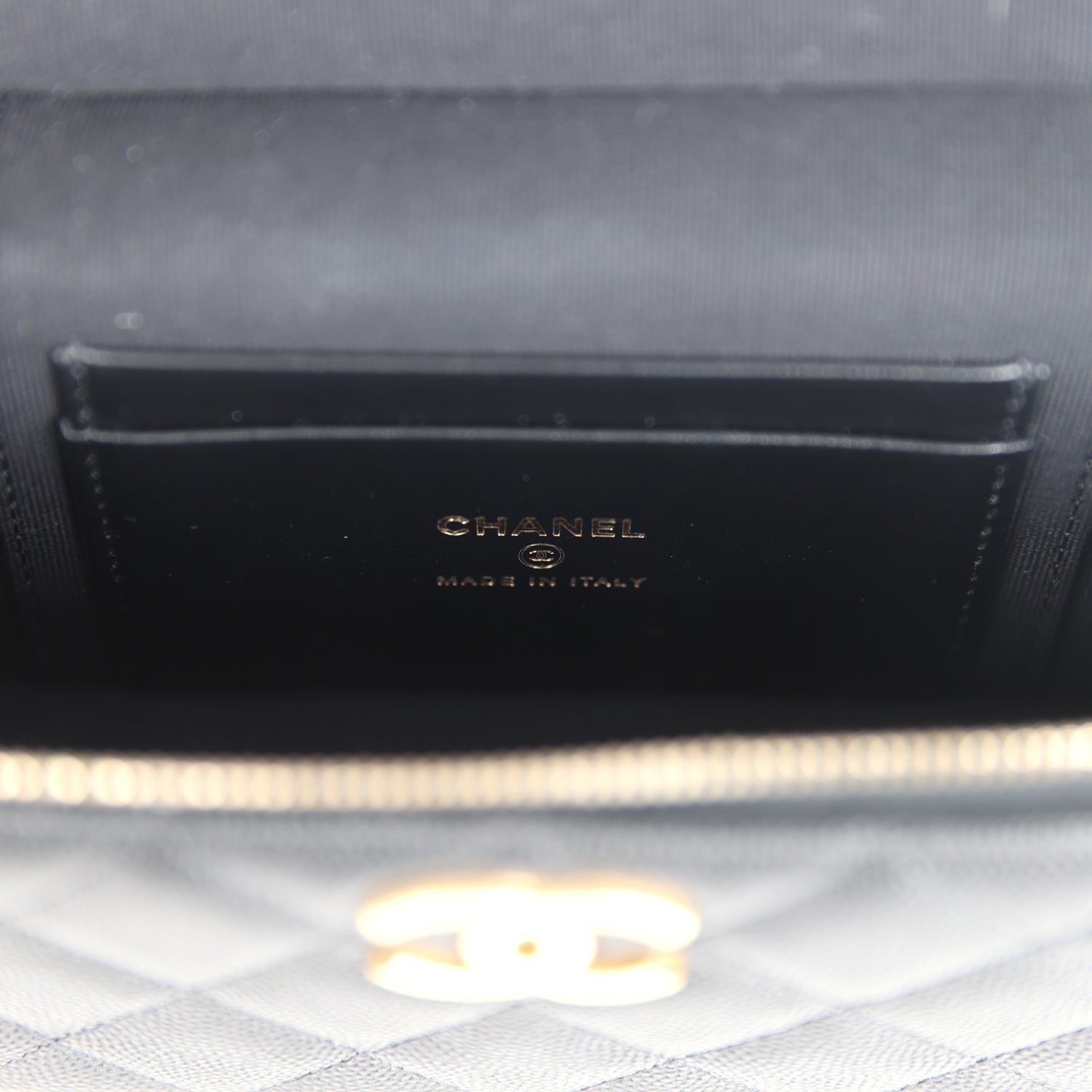 The interior is lined in white leather and features a zipper pocket with Chanel pull and an open pocket below.