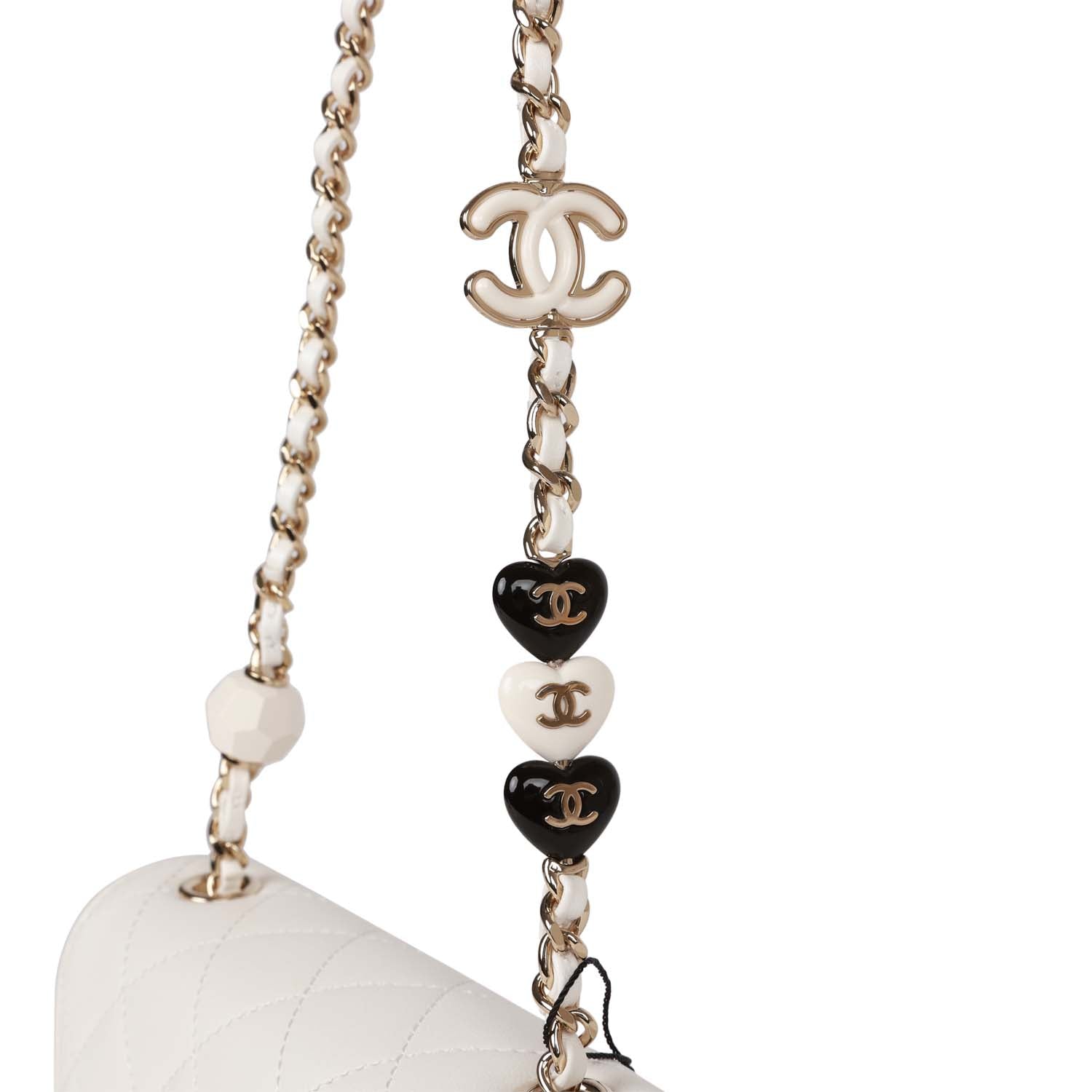 Regular price $1,710.00 Sale price $450.00 Save $1,260.00This Mini Square flap bag is of White lambskin with light gold tone hardware and has a front flap with signature CC turnlock closure, rear half moon pocket, single interwoven white leather and light gold tone chain link shoulder/crossbody strap with three CC hearts and an enamel white CC logo.