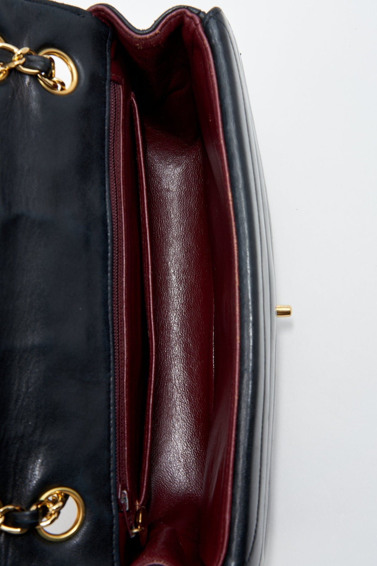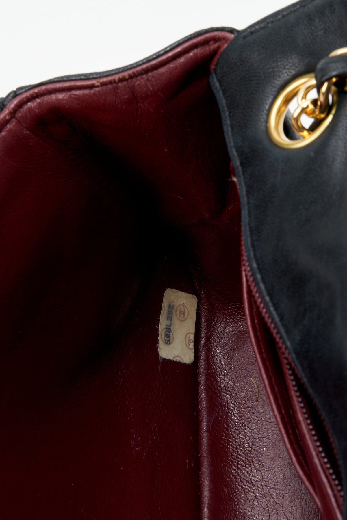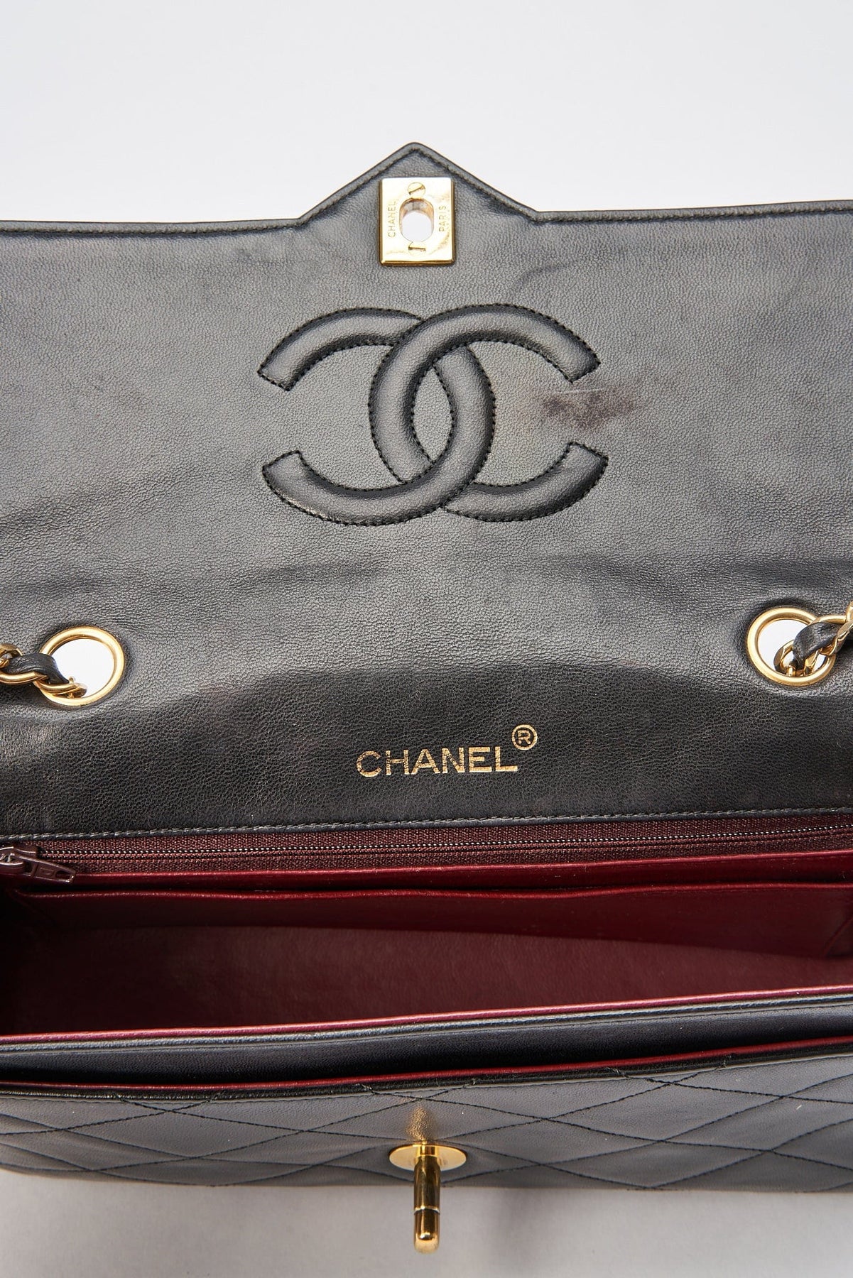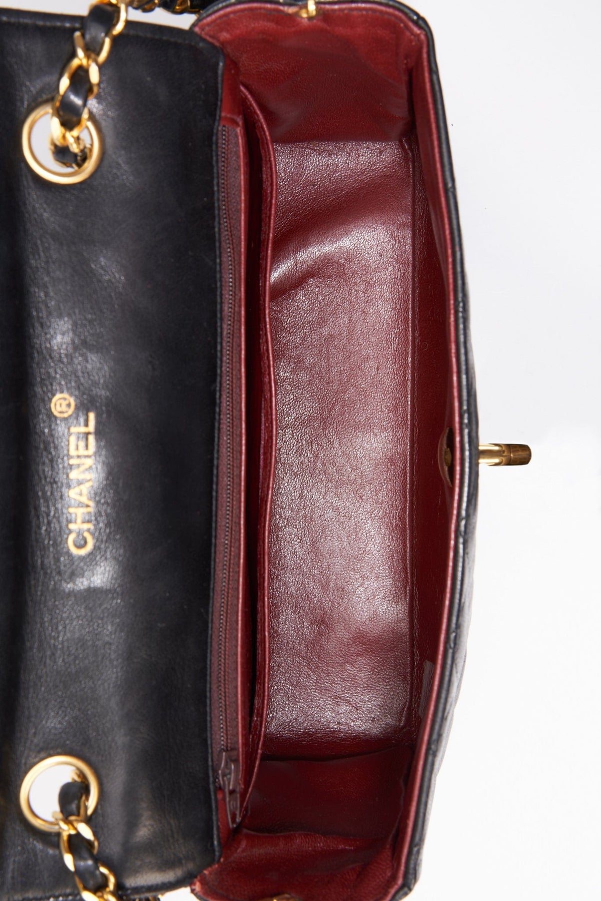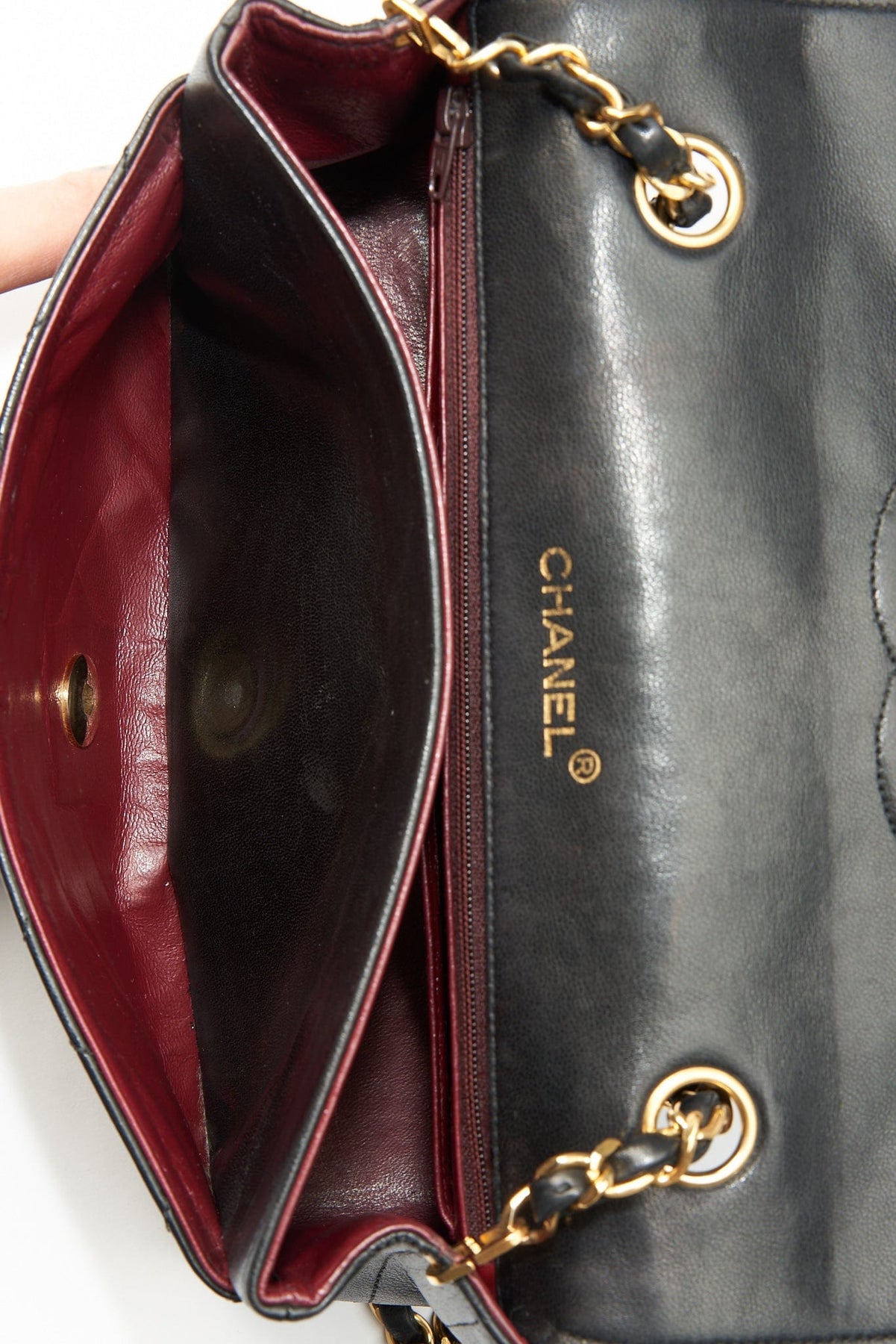 Regular price $1,980.00 Sale price $430.00 Save $1,550.00This vintage Classic Chanel Single Flap bag is crafted with black diamond quilted lambskin leather with 24k gold-plated hardware and a single leather-trimmed chain-link shoulder strap. There is a zip and a slip pocket inside this bag plus the interior is lined with maroon leather.